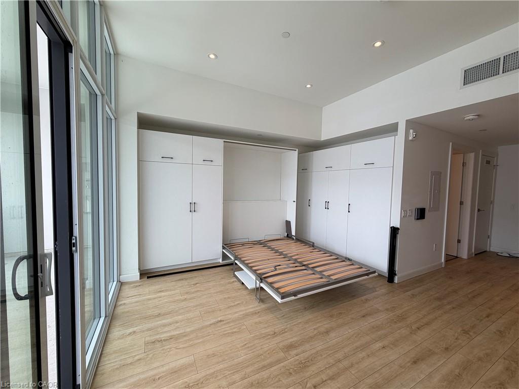 Bright and modern studio suite in the heart of Kitchener’s Innovation District at the Bright Building. This thoughtfully designed unit features floor-to-ceiling windows and an open-concept layout that fills the space with natural light. A sleek Murphy bed allows the living area to transform effortlessly from day to night, maximizing functionality and comfort.