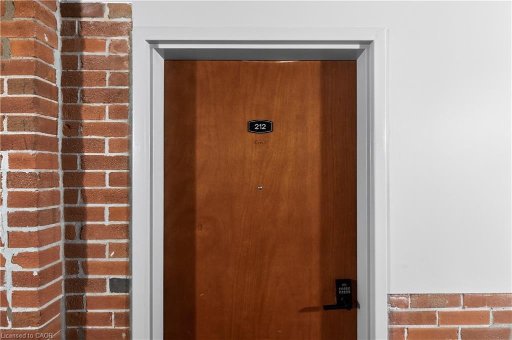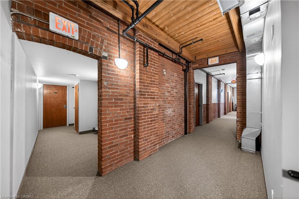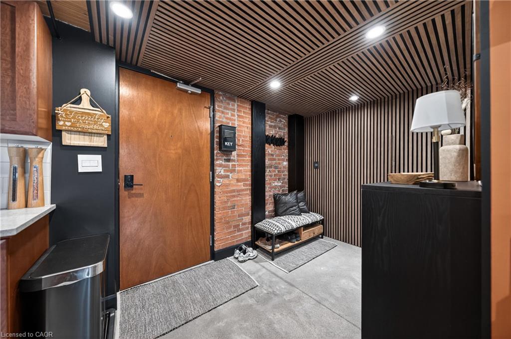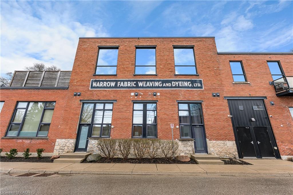 Welcome to one of Cambridge’s most striking loft residences, set in a character-filled, century-old factory conversion on a quiet street, just steps to the Grand River, cafes, shops, and trails. This exceptional open-concept loft offers approximately 1,535 sq. ft. of living space, featuring soaring 17-foot ceilings, post and beam construction, exposed brick, and dramatic double-height windows that flood the home with natural light. The updated kitchen showcases quartz countertops, stainless steel appliances, gas range with electric oven, exterior-vented hood, roll-out shelving, and a large pantry. Extensively renovated throughout, the unit includes a fully redone main bath and an updated ensuite with rain shower. Additional upgrades include an enlarged front entry with hidden pantry/coat closet, custom bar and coffee station with built-in microwave, updated stair landing, Brazilian cherrywood floating staircase, custom fireplace, industrial-style ceiling fan, and all new window coverings including remote blackout blinds. The upper-level features wide plank cherrywood flooring, along with a customized wardrobe, added closet, and ceiling fan in the bedroom. Enjoy your private 450 sq. ft. terrace, fully fenced for added privacy, complete with a gas line for BBQ, perfect for entertaining. Includes two parking spaces and a large locker. A rare opportunity to own a truly unique loft in one of Cambridge’s most desirable communities.