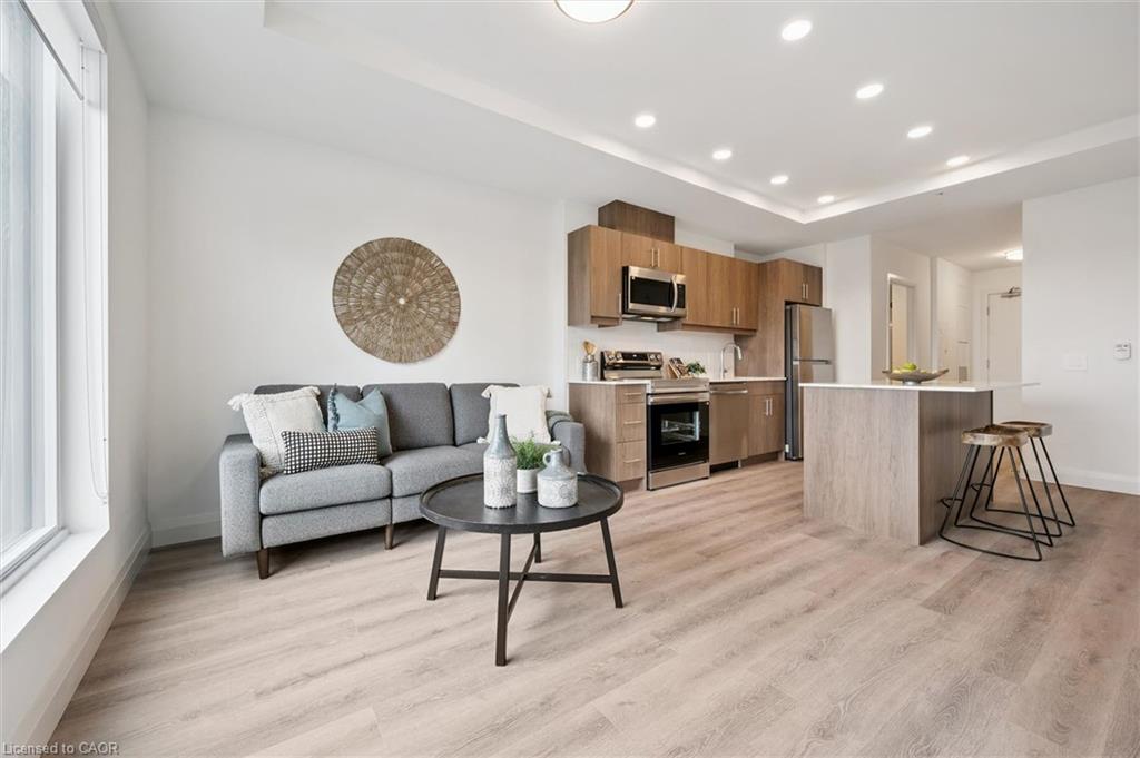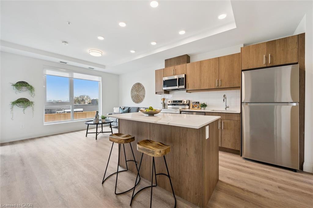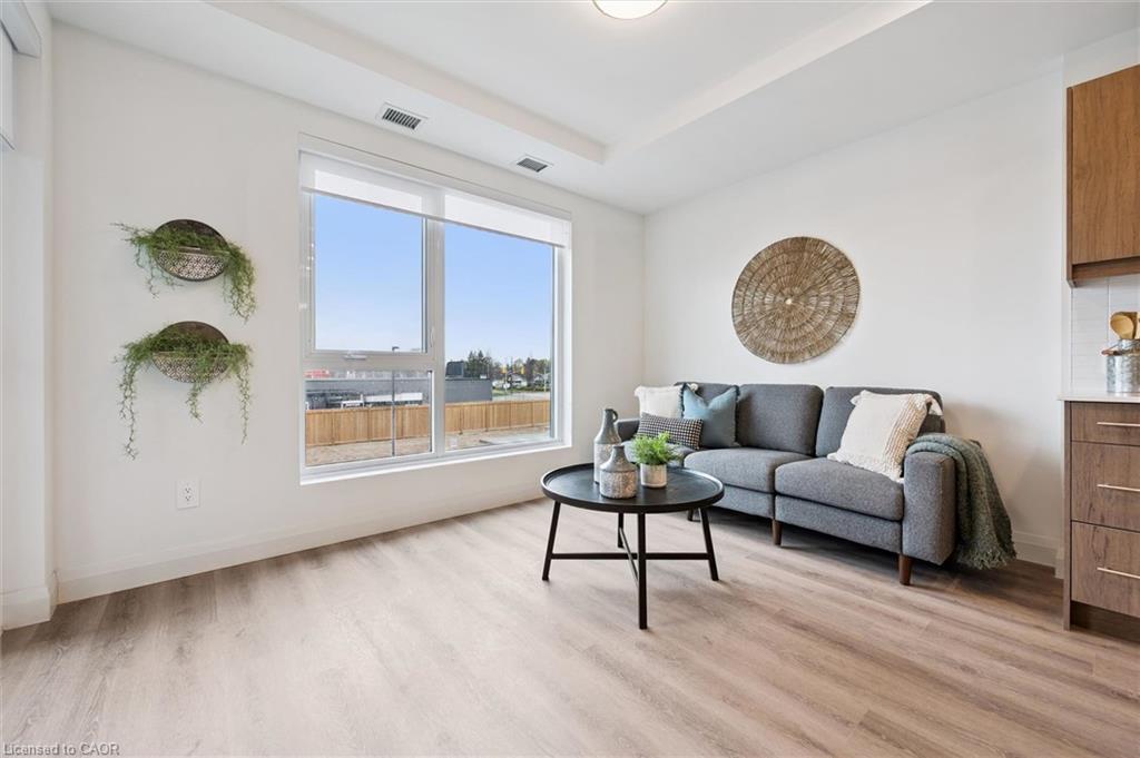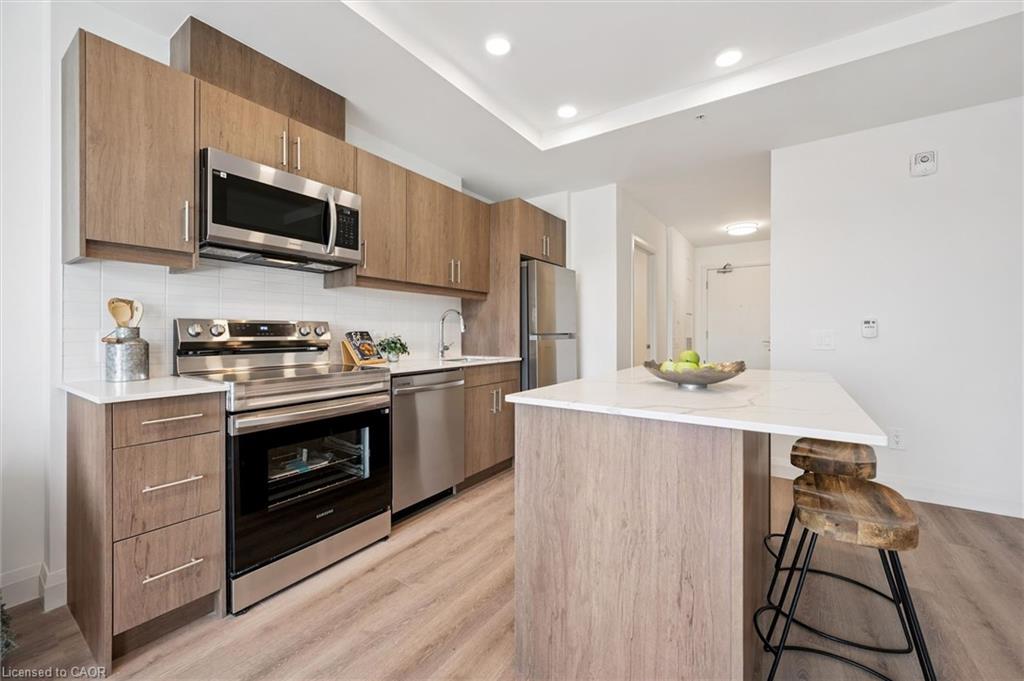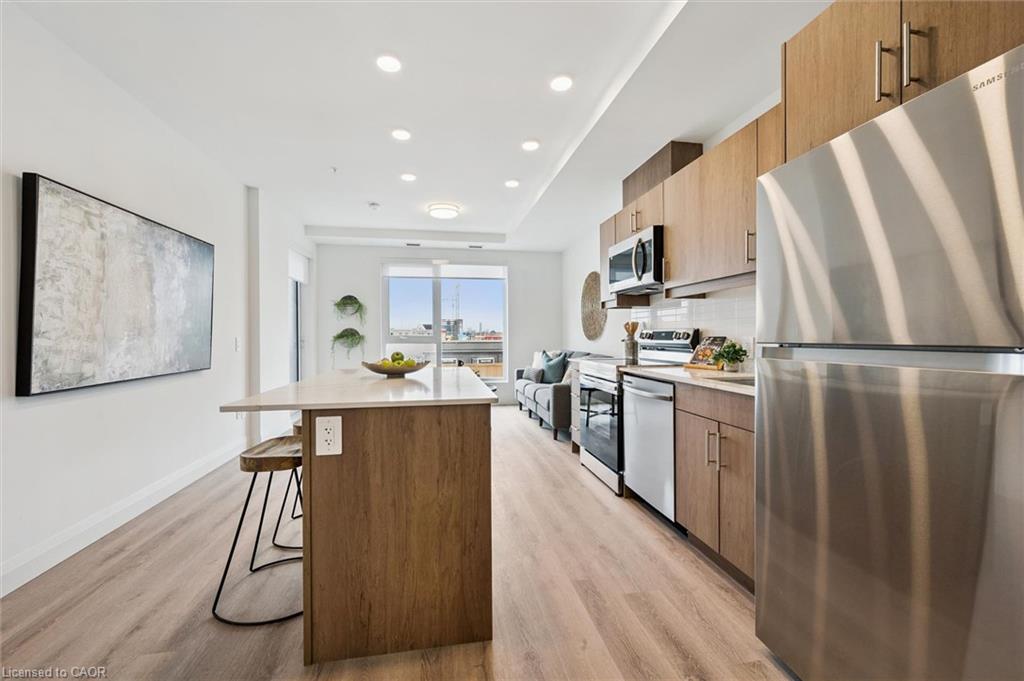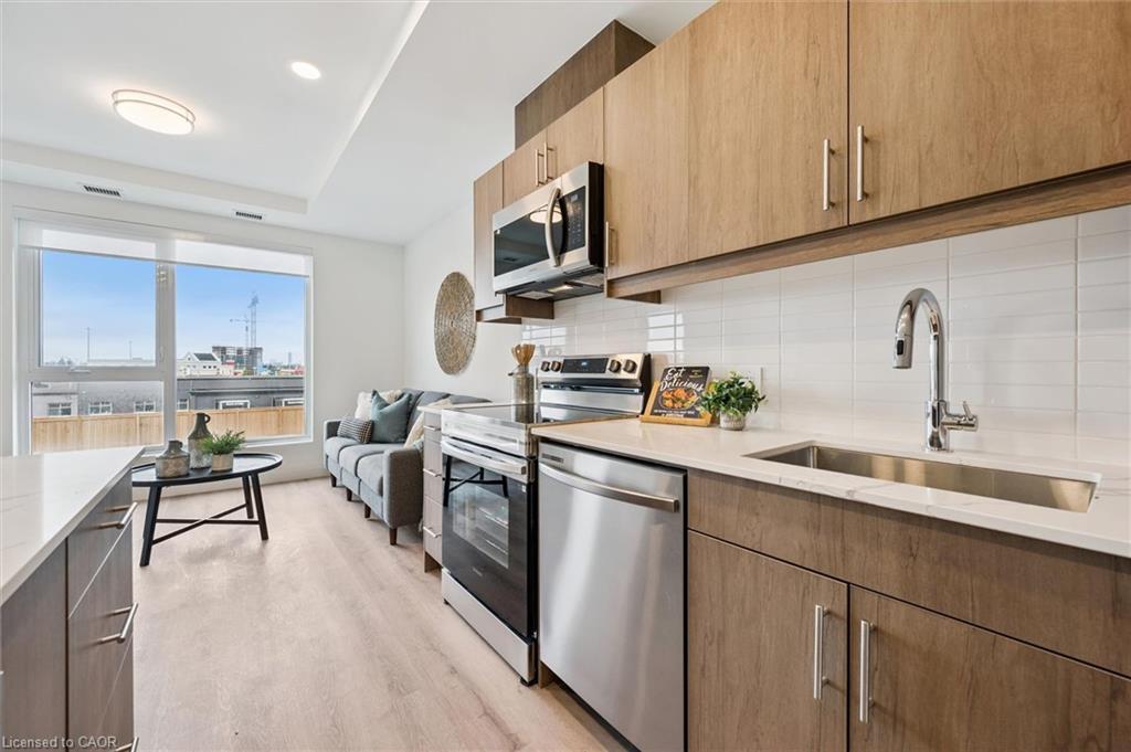 **OPEN HOUSE SAT. MAY 2 & SUN. MAY 3 from 2-4pm** Welcome to the newest condominium complex in Kitchener. Located on Weber Street E with close proximity to Fairview Mall, Kitchener Costco, great restaurants and expressway access, Weber Yards is an exciting new project for the entry level buyer. Get into the real estate market with this 699 sq ft, one bedroom, one bathroom, plus a balcony, one underground parking space, and a storage locker. This brand new, never been lived in unit is open concept with a bright kitchen and living room. The kitchen is modern and fresh with white cabinetry, quartz countertops, stainless steel appliances and a centre island with barstools for easy entertaining. The one bedroom offers great light with floor to ceiling windows and good square footage for easy decorating. The 4 pc bathroom has a good layout so nothing feels awkward or too tight. All appliances are included: fridge, stove, microwave range, dishwasher and stackable washer and dryer. Enjoy winter more when you don't have to clean off your car! One underground parking spot (P1-62) is located immediately beside the elevator doors for easy unloading of groceries. Your storage locker offers excess storage for your winter tires, luggage and holiday decor. Building amenities include: 24/7 Concierge Desk and secured entry, Front lobby gathering space, amenity room, pet washing station, visitor parking, gym and larger party room. Come see the features found here and not offered elsewhere for this price point.