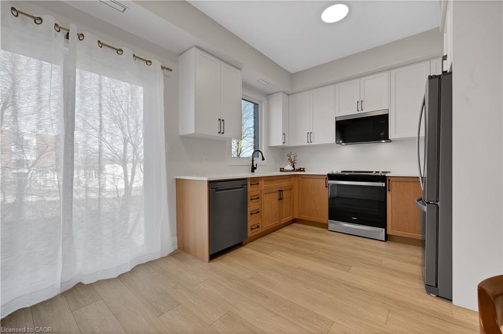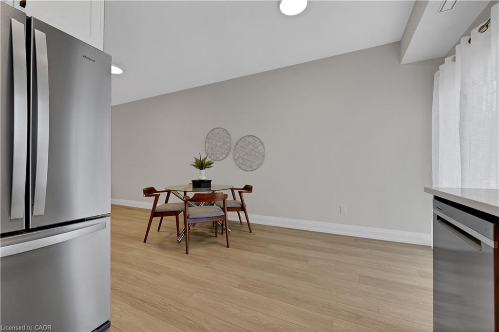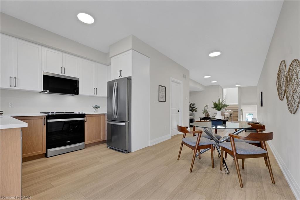 The open-concept main floor is filled with natural light and features a generous living area, a convenient two-piece bathroom, and a well-appointed kitchen complete with stainless steel appliances, quartz countertops, two-toned cabinetry, and a spacious dinette that easily accommodates family meals and casual gatherings. Sliding patio doors open onto a private wood deck, a wonderful spot for morning coffee, outdoor dining, and relaxing evenings with friends.