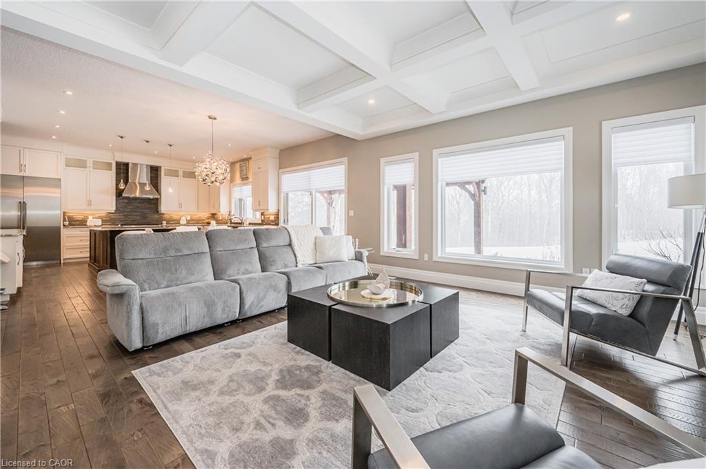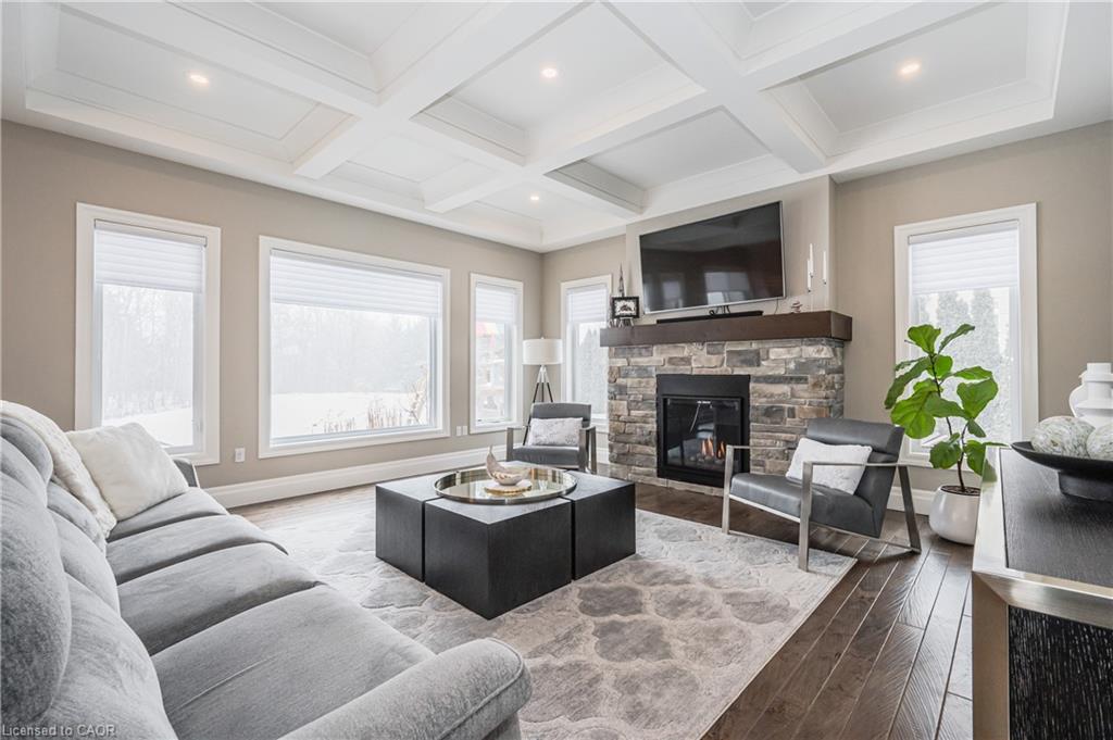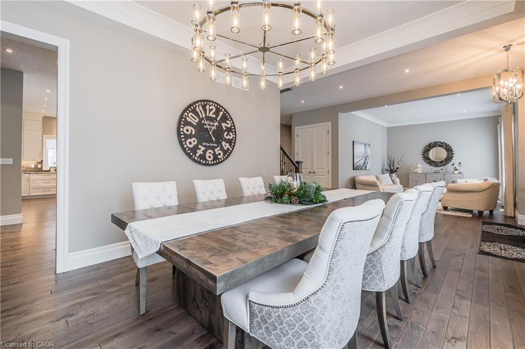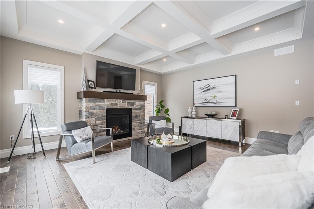 This 4+1 bed/4.5 bath home is set upon a SPRAWLING 0.88-acre RAVINE TREED LOT. This CUSTOM-BUILT home boasts 5851.91 fully finished square feet. Enjoy the grandeur of the front stone/brick exterior w/TRIPLE CAR GARAGE. A front foyer is flanked by a formal living room & distinguished dining room. The main floor unfolds with PREMIUM HAND-SCRAPED HARDWOOD FLOORS, leading to the family room adorned with a COZY GAS FIREPLACE, complete with a STONE SURROUND MANTLE & COFFERED WAFFLE CEILING. Towering 10-FOOT CEILINGS accentuated by 9-foot 4 hinged doors, windows w/ENCHANTING VIEWS of the expansive backyard retreat. The CUSTOM CHERVIN KITCHEN exudes a two-tone theme, featuring a custom WALNUT WOOD CENTER ISLAND and CEILING-HEIGHT TALL CABINETRY. High-end THERMADOR STAINLESS APPLIANCES, incl. a 6-burner gas stove, elevate the culinary experience, while a MOSAIC TILE backsplash adds a touch of sophistication. The kitchen seamlessly flows into a Butler's Servery & WALK-IN PANTRY. A main floor den/office w/custom built-ins is complemented by a convenient 2-piece powder room, main floor laundry, & mudroom w/garage access. Ascend the IRON-RAILED HARDWOOD stairs where the opulent primary bedroom awaits. A custom double tray ceiling & walk-in closet w/organizing systems & the luxuriously appointed ensuite beckons with a FLOATING TUB, oversized glass-enclosed walk-in shower, & double vanity. A second bedroom w/ensuite bath & two other bedrooms sharing a JACK'N'JILL BATHROOM. The recently finished lower level offers a large additional living area w/5th bedroom & 3pc bath & games/media area with space for a home gym or hobby room; a convenient sep. walk-up access for ideal multi-generational living. A rare opportunity to own a home that epitomizes the pinnacle of modern living. Situated close to 401 ACCESS and mere minutes from an array of shopping amenities, this residence seamlessly blends LUXURY WITH CONVENIENCE, promising a lifestyle of unparalleled COMFORT AND SOPHISTICATION.