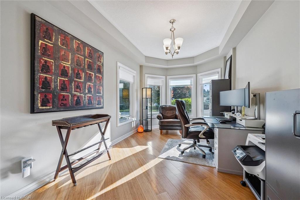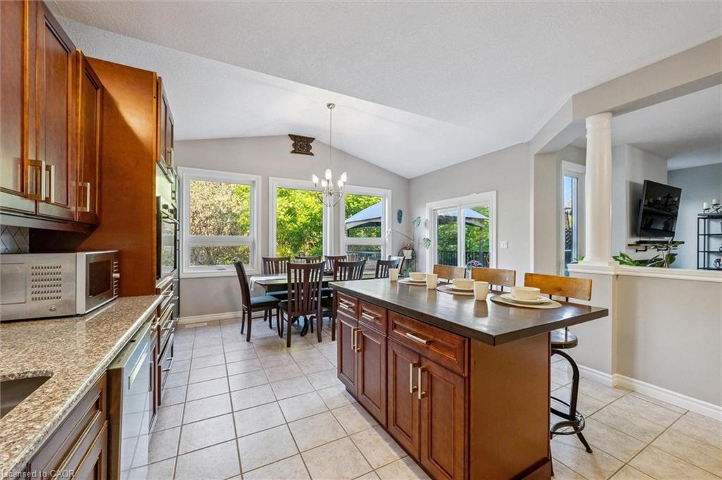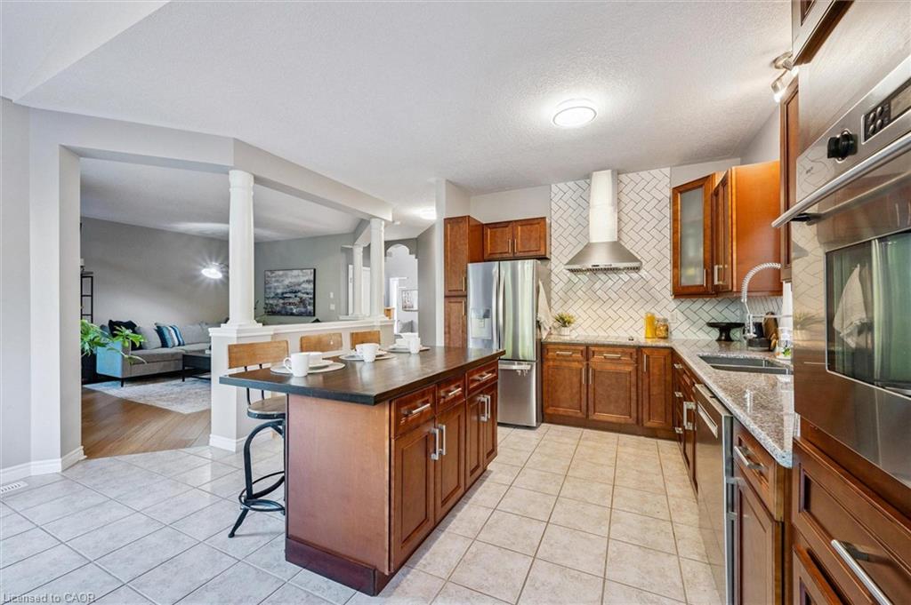 Impressive 5-bdrm, 3.5-bath home W/LEGAL 2-bdrm + den W/O bsmt apt offering 3400sqft of living space backing onto greenspace! Stunning curb appeal W/modern black dbl car garage & window framing (2023), front porch, distinctive architectural lines & landscaped front yard. Inside the main level offers spacious layout for modern living & entertaining. Front office W/tray ceilings, bamboo floors & bay window. Living room W/new gas fireplace is framed by 2 large windows. Chef-inspired kitchen W/dark cabinetry, granite counters, top-tier S/S appliances incl. B/I oven, tile backsplash & centre island W/bar-height wood countertop & seating. Dining area W/vaulted ceiling, custom wall of B/Is W/coffee bar, storage & wall of windows framing views of backyard. Step outside to upper-level Trex composite deck & take in views of greenspace beyond. 2pc bath completes this level. Upstairs primary bdrm boasts multiple windows, W/I closet & 5pc ensuite W/oversized vanity, quartz counters, dbl sinks, soaker tub & W/I glass shower. 2 add'l bdrms share 4pc bath with tub/shower & large vanity. Laundry area is located in the upper-level bathroom. Legal W/O bsmt apt offers 2 bdrms + den (one bdrm has B/I closet organizer), kitchen W/ample cabinetry & 4pc bath W/modern vanity, tub/shower & its own laundry. Luxury vinyl plank floors & sliding glass doors flood space W/natural light & provide access to lower deck & backyard. Ideal for multi-generational living or income potential, this well-designed apt offers opportunity to offset your mtg W/strong rental potential of approx. $3000/mth, private entrance & close prox. to UofG. Outside the fenced backyard offers lower deck W/stairs connecting to upper level, grassy area & peaceful wooded backdrop making it ideal space for families & pets. Upgrades: metal roof 2021, furnace & AC 2016, triple-pane windows Dec 2023, exterior & garage doors 2024 & fencing 2020. Walking distance to Rickson Ridge PS, mins from UofG & easy access to Hanlon Pkwy & 401