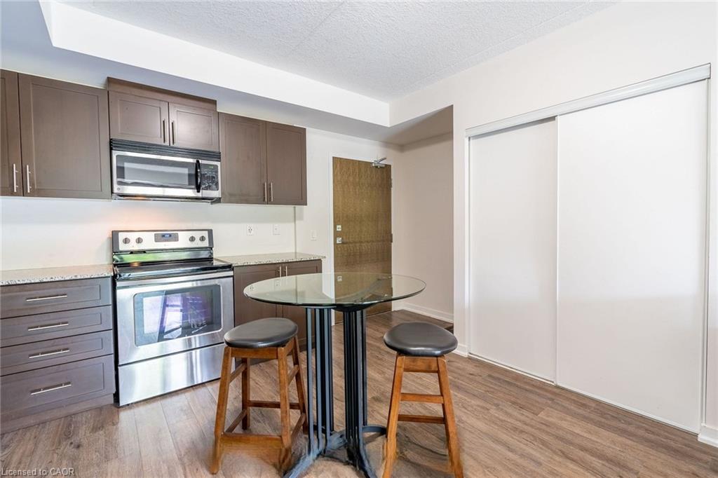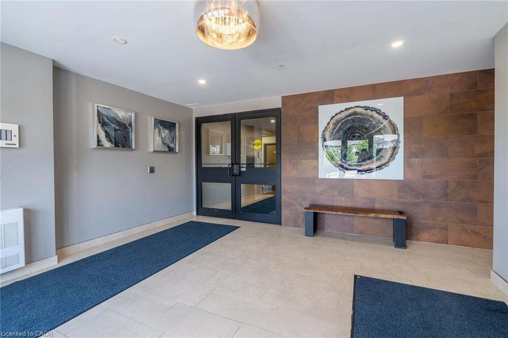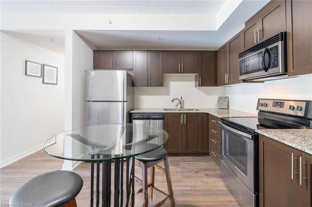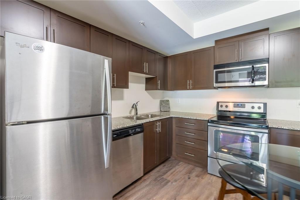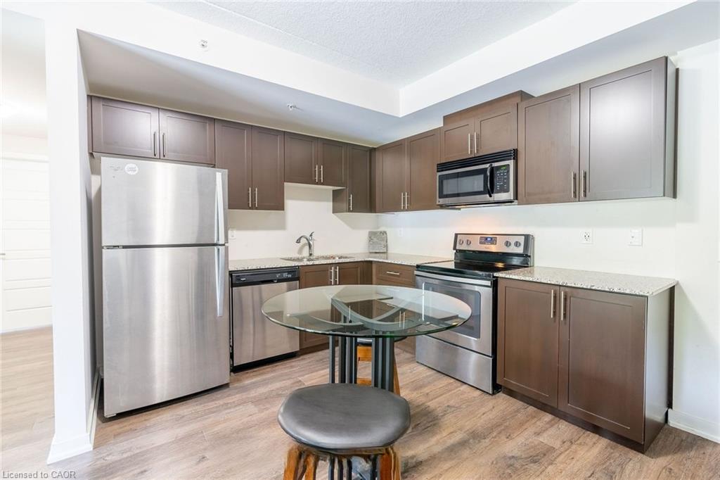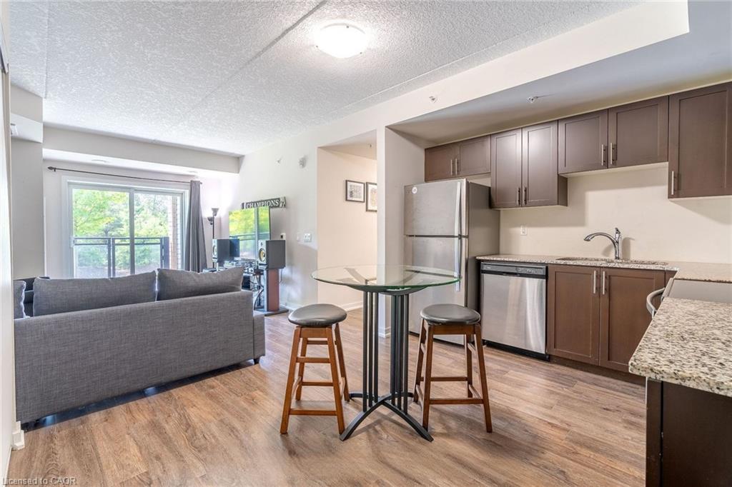 Beautiful, spacious & bright 2 bedrooms, 2 baths condo located in lively & desirable south end of Guelph. This 2 bedroom street level corner unit condo has high ceilings and sparkles like new with lots of high end finishes. The open concept kitchen features quartz countertops, Stainless steel appliances with upgraded dark rich espresso kitchen cabinets with plenty of cabinet space. A bright open concept living room and dining area with laminate floor and neutral color paint. Large Master bedroom with a walk in closet and an abundance of natural light through large windows and fully upgraded in-suite. Laminate floor and neutral paint throughout the unit with plenty of light in the unit. This popular well-built six-story condo building also features free access to an impressive party room complete with full kitchen and tons of space for entertaining, plenty of visitor parking, a bike storage room and a spacious garden area with large gazebo for outdoor enjoyment. walking distance to all of south Guelph's modern conveniences that include restaurants, grocery stores, a library, shopping plazas, public transit and a Galaxy Movie Theatre. There is a direct bus route to the University of Guelph and it's only a few minutes drive to the 401.