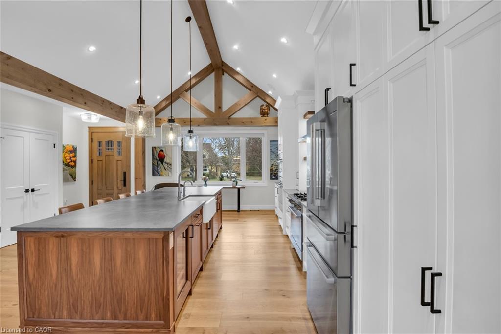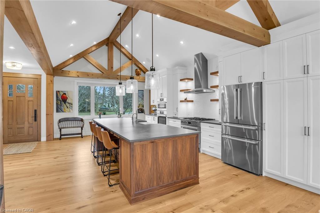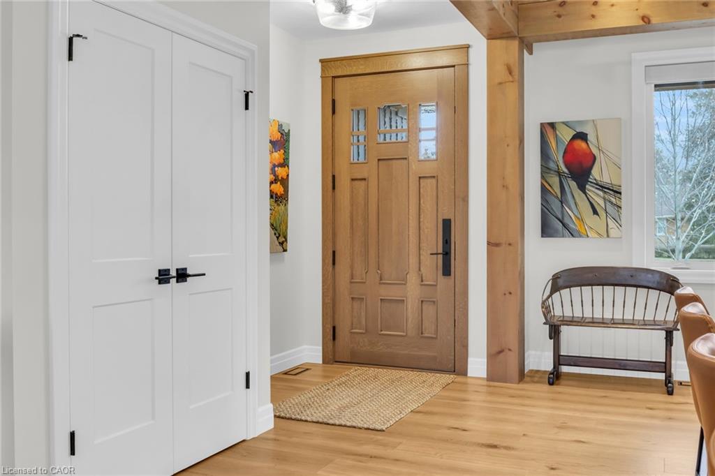 Step through the custom solid oak front door into open-concept principal rooms defined by striking post and beam construction and soaring ceilings. The space is filled with natural light and anchored by a beautiful stone fireplace.