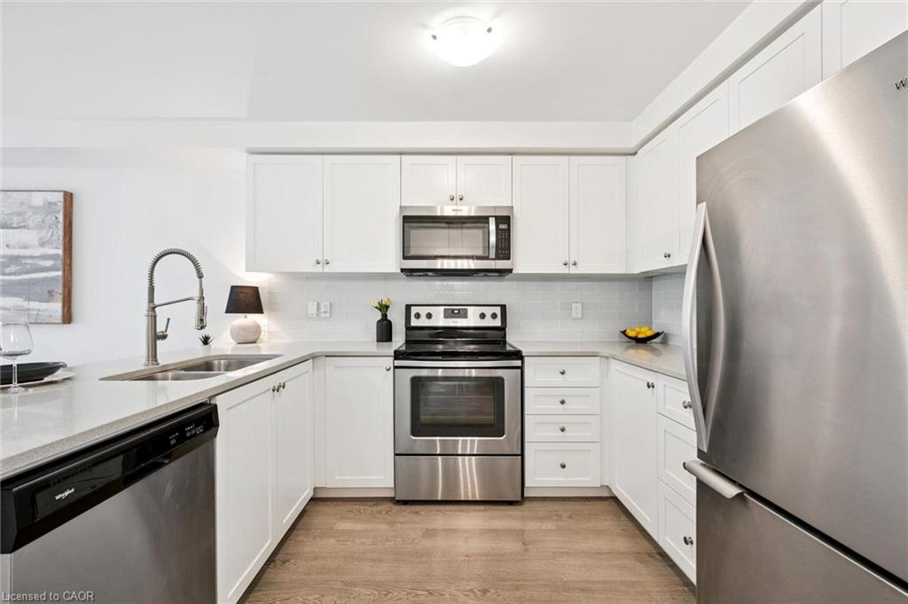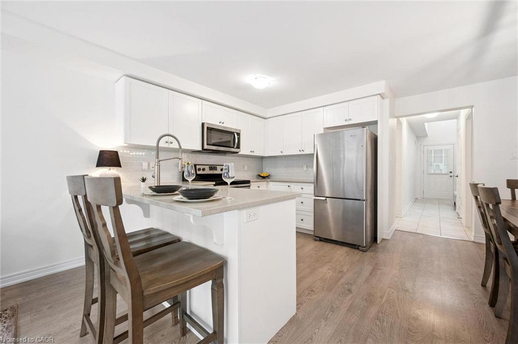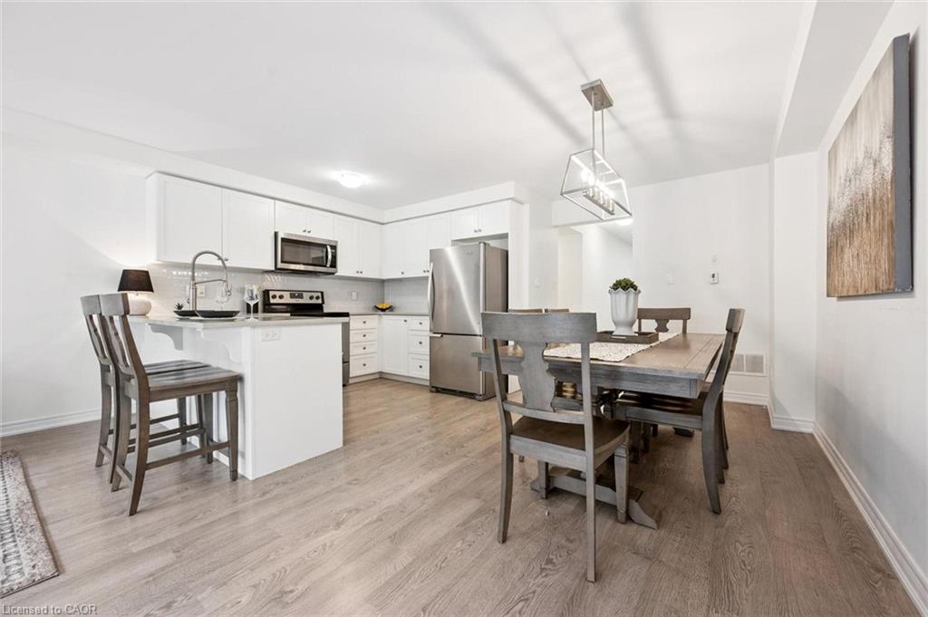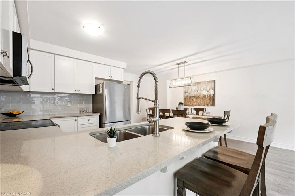 Welcome to 26 Skinner Dr, a beautifully updated 3-bedroom, 2.5-bathroom FREEHOLD townhouse, perfectly situated on a quiet street in a family-friendly neighbourhood! From the moment you arrive, you’ll notice the charming red brick exterior, inviting front porch and attached single-car garage—offering both curb appeal and everyday convenience. Step inside to a bright, open-concept main floor designed for modern living. The stunning eat-in kitchen features fresh white cabinetry, gleaming quartz countertops, a stylish backsplash and stainless steel appliances creating a clean, timeless space that flows effortlessly into the dining area. Complete with a beautiful light fixture, it’s ideal for hosting family dinners or entertaining guests. The spacious living room offers laminate flooring and is filled with natural light from a large window and sliding doors, seamlessly connecting indoor and outdoor living while overlooking the backyard. A sleek powder room completes this level. Upstairs, the primary bedroom is a true retreat, highlighted by a large arched window, walk-in closet and a private ensuite with a quartz vanity and a glass walk-in shower featuring elegant tile work. Two additional generously sized bedrooms offer large windows and ample closet space, along with a well-appointed 4-piece main bathroom. Second-floor laundry adds everyday convenience. Outside, enjoy the expansive back deck—perfect for summer gatherings—along with a fully fenced yard and a generous green space for kids or pets to play. 26 Skinner Dr is located directly across from Hammill Park and just a short walk to the Guelph Public Library, William C. Winegard Public School, Holy Trinity Catholic School and Ken Danby Public School, this home is perfectly positioned for family living. You’re also just minutes from restaurants, grocery stores, fitness centres and more—with easy access to the 401 via backroads, making commuting a breeze