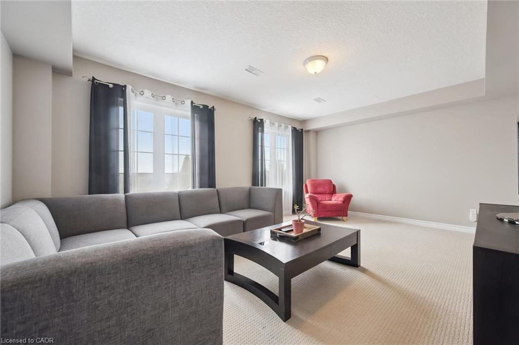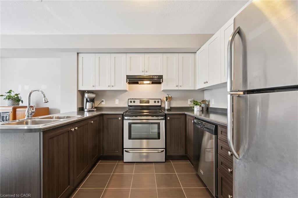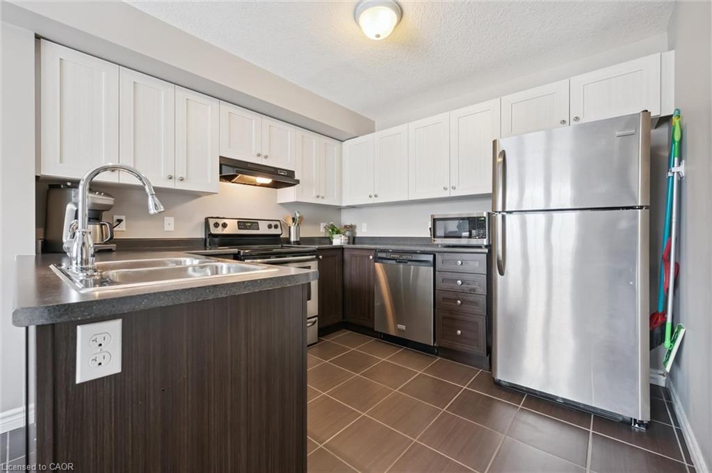 This beautifully maintained upper-level stacked townhome offers 1,369 sq ft of bright, functional living space. Thoughtfully designed with neutral finishes and décor, this home provides a warm, move-in-ready feel that suits any style. The spacious living room is filled with natural light from large windows, creating an inviting atmosphere perfect for both relaxing and entertaining. The functional kitchen features a convenient dine-in area and direct access to the private balcony- ideal for morning coffee or evening unwinding. A well-placed powder room on this level adds everyday convenience for you and your guests. Two great-sized bedrooms, a 4-piece bathroom, and in-suite laundry occupy the upper level. Located in a fantastic neighbourhood, just minutes from schools, parks, shopping, and scenic trails leading to Guelph Lake- perfect for outdoor enthusiasts.