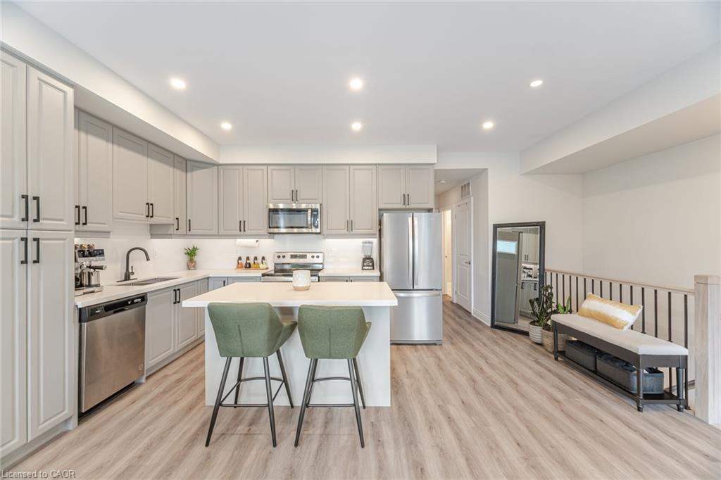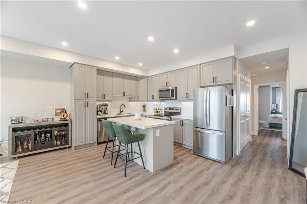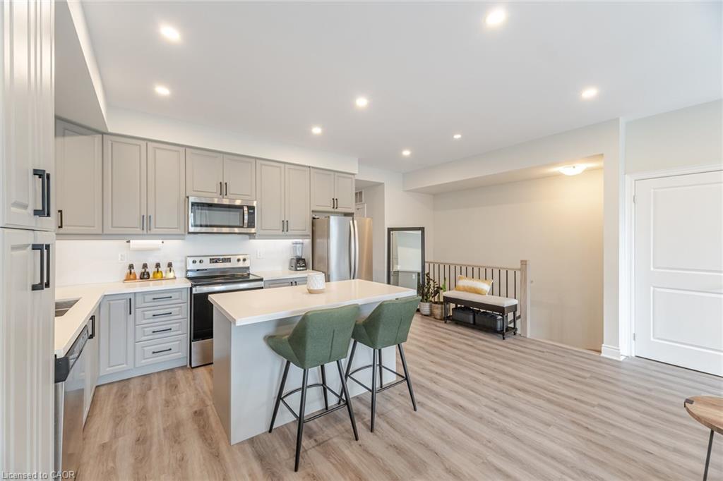The kitchen stands out as the heart of the home, showcasing extended cabinets, quartz countertops with a matching backsplash, a premium Moen faucet, and an extended island that doubles as a breakfast bar. It's equipped with thoughtful details, including a gas line for the stove, a water line with a shut-off valve for the fridge, LED pot lights, and a built-in electrical outlet with a USB port on the island.