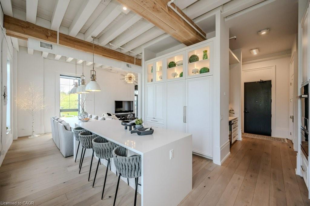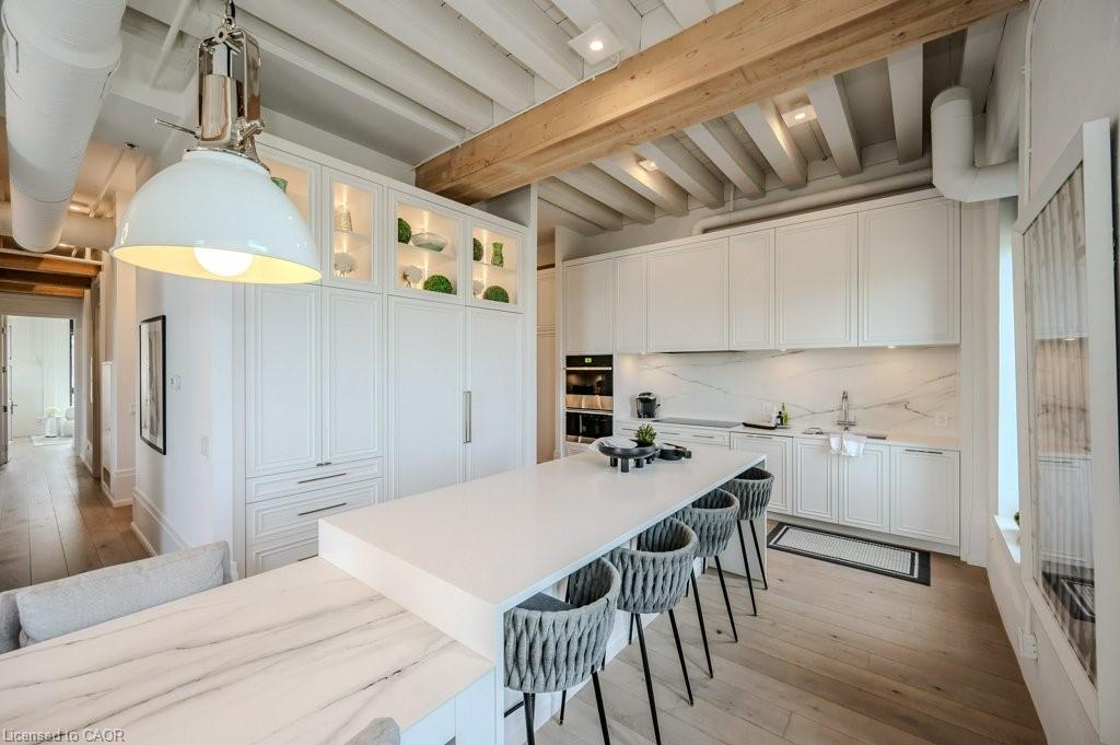 Welcome to Riverbank Lofts, a boutique historic stone conversion on the Speed River in the heart of Hespeler Village. This rare corner unit offers luxury with 12' ceilings, exposed beams, and oversized windows showcasing river, pond and waterfall views. Featuring 2 bedrooms with private ensuites, a powder room, and a show-stopping 18' island kitchen with built-in appliances, servery, and pantry. High-end finishes include European white oak flooring, heated floors in baths and laundry, custom built-ins, automatic blinds, and designer lighting. One of only three units with a private river-view balcony and a 2-car garage. Enjoy amenities like a fitness centre, common lounges, bike storage, and direct access to trails and the river. Steps to shops, restaurants, and cafes, with easy access to Hwy 401-this is elevated loft living in one of Cambridge's most desirable locations. Virtual tour and some photos are staged.