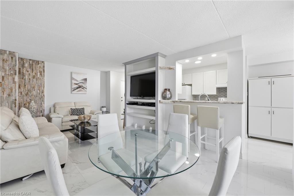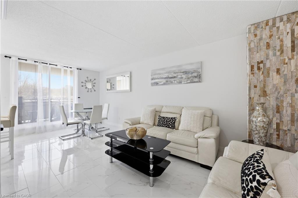This bright, spacious, and updated corner unit is move-in ready. The two-bedroom, one-bathroom home features a fresh neutral paint palette and carpet-free living with luxurious vinyl plank and tile flooring throughout. The large living room leads to a private covered balcony with sliding doors, and large windows in every room provide ample natural light. The kitchen offers a sleek, contemporary design with pot lights, abundant cabinetry, a beautiful tile backsplash, and recently updated appliances (2024/2025). The kitchen flows seamlessly into the dining room, perfect for family dinners and entertaining.The primary bedroom includes a walk-in closet, and this unit offers plenty of storage throughout. For added convenience, the unit is located near the elevator and includes a dedicated parking spot close to the building entrance, along with ample visitor parking.Ideally situated near schools, parks, restaurants, the Hanlon Parkway, and the University of Guelph, this property is an excellent opportunity for first-time buyers, young families, investors or those looking to downsize.This is one unit not to be missed!