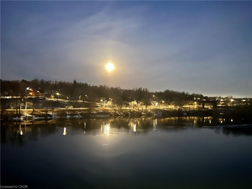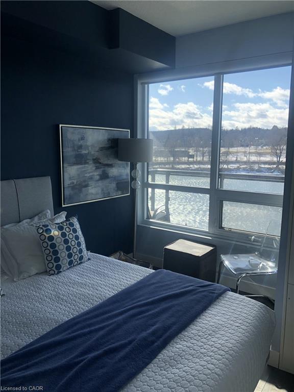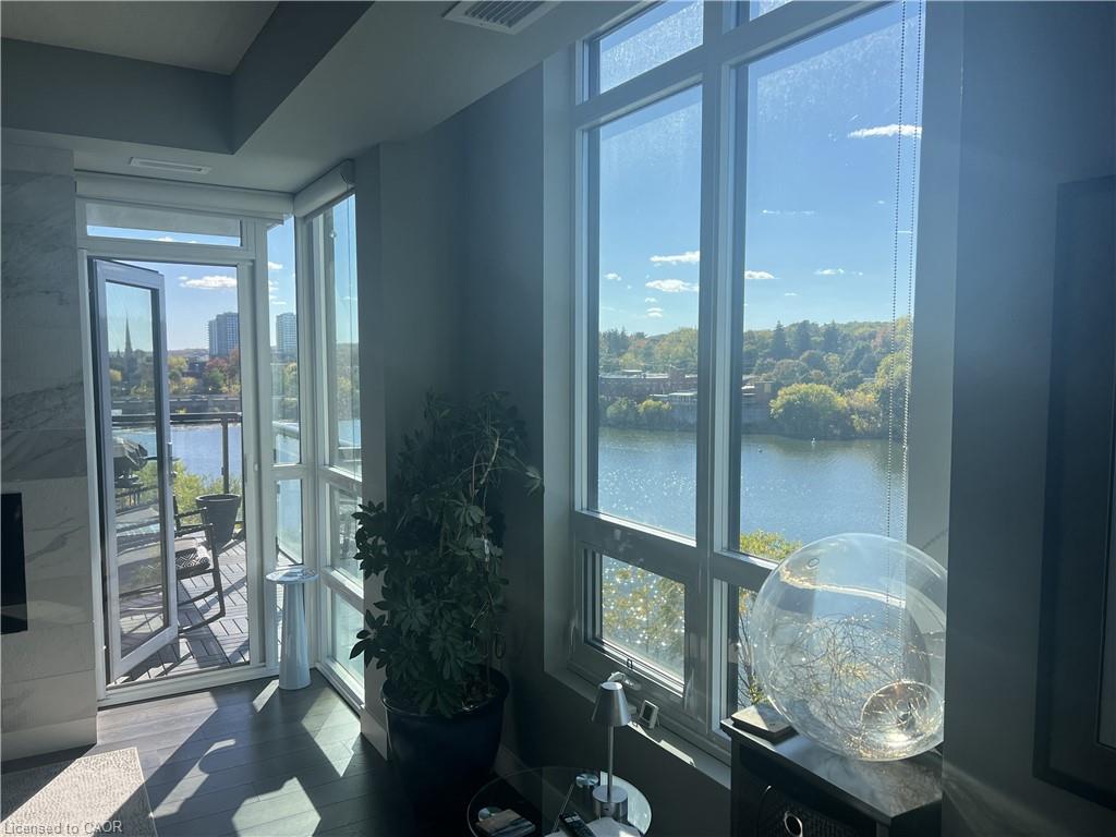 One plus large-size Den that fits a queen-size bed. Stunning views from every room, the best view of the river and historic downtown is from this unit, bright and sunny unit with almost floor-to-ceiling windows that provide an unobstructed view of the architecturally renowned downtown Galt and the Grand River as well as magnificent sunsets. Wake up to the view of the Grand River. Enjoy the breathtaking historic old Galt bridges and churches from your living room and the balcony. And a kitchen made for cooking and entertaining, kitchen cabinets has hidden drawers and organizers. A big size den fit to be used as a guest bedroom. Your water, A/C and heat are all included in your condo fees, you have no extra payments except for hydro (average $50/month)! Great location, walking distance to boutique shopping, restaurants, theatre, Gaslight district, Grand River trails, library, farmers' market, minutes to the 401, public transportation and so much more. It offers an awesome fitness centre 24/7, Guest Suite ($75/1st night, $25 after), Party Room with walkout to an impressive Garden Terrace with BBQs and dining area for all your entertaining needs, and lounging area overlooking the Grand River. Secured entry building with security cameras. This building has a community living feel.
