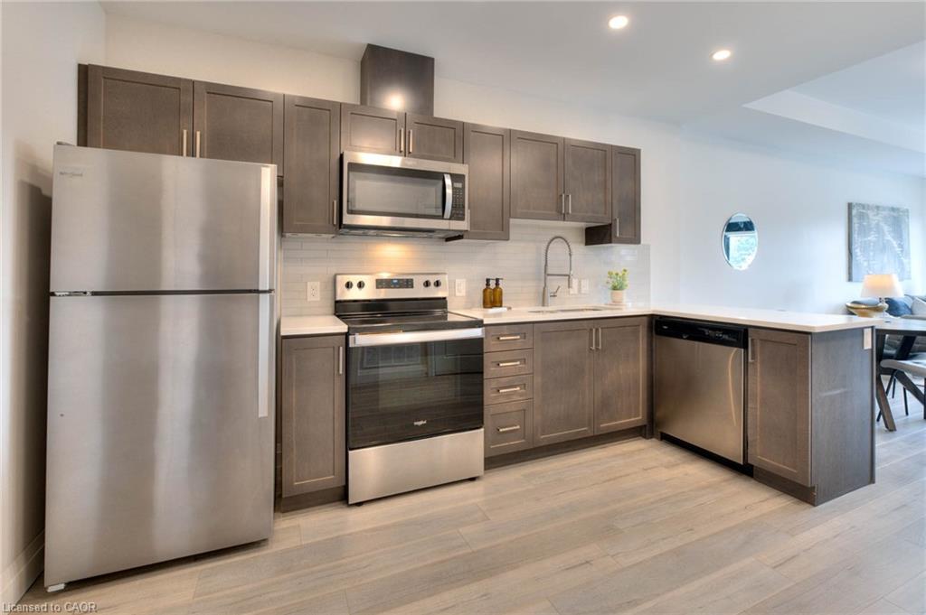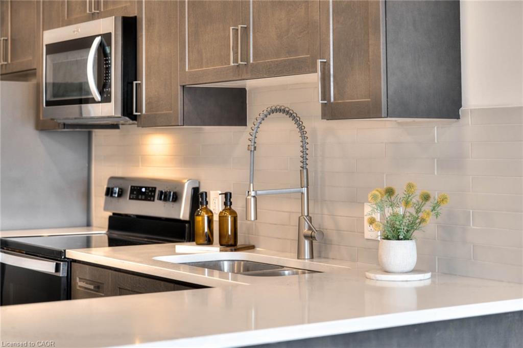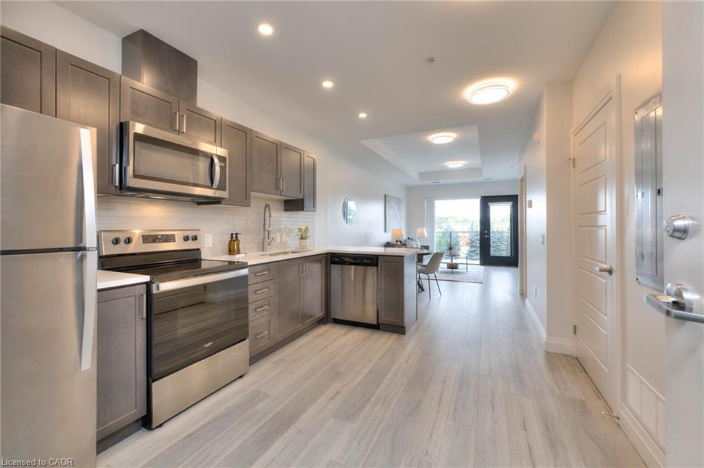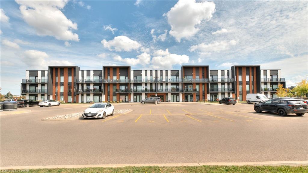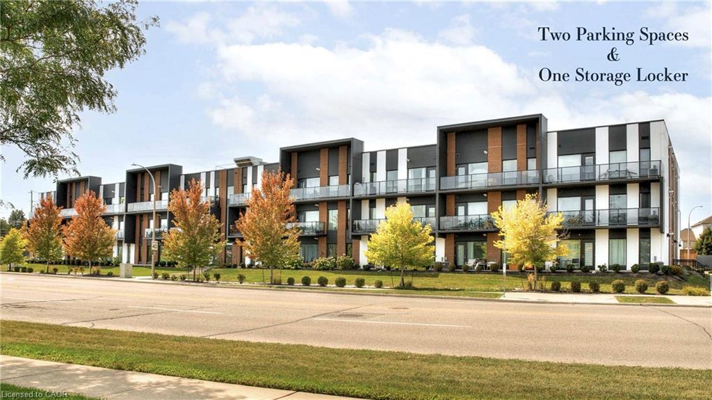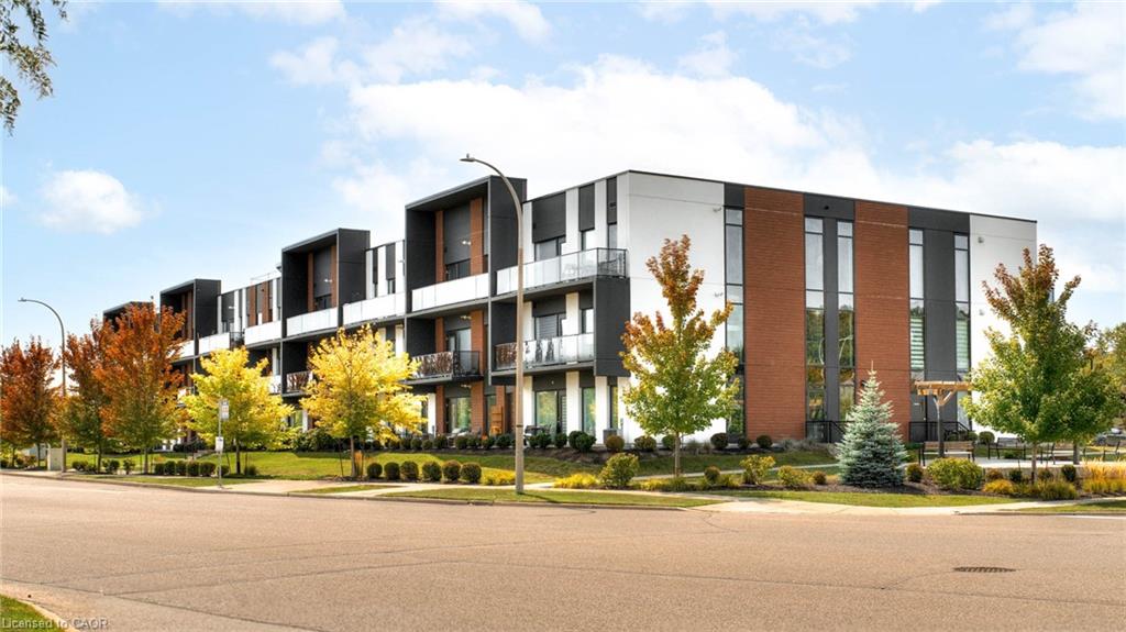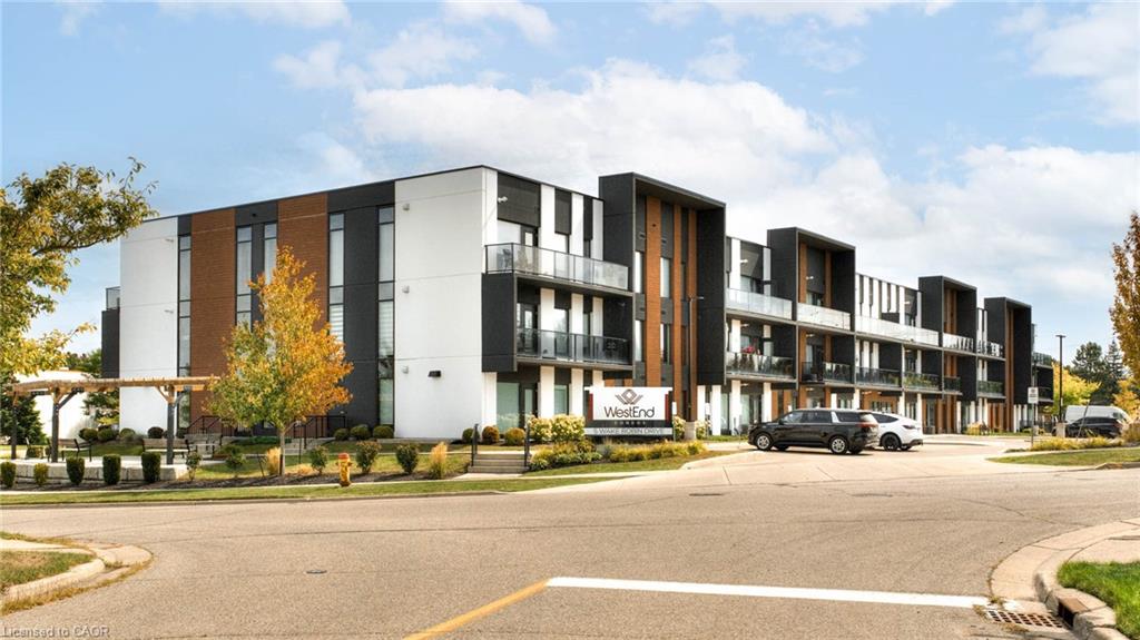 5 Reasons to love this condo:1. Two owned parking spots 2. One owned storage locker 3. Top floor & corner unit 4. Ensuite Laundry 5. Large balcony. Welcome to Unit 318 at 5 Wake Robin Drive a bright 1-bedroom condo built in 2020 offering contemporary finishes and stress-free living. This rare top-floor corner unit features tall ceilings, oversized windows, and a freshly painted interior filled with natural light.The open-concept kitchen showcases quartz countertops, stainless steel appliances, a tile backsplash, and a peninsula with breakfast seating. Wide-plank flooring flows through the main living area to a large private balcony - perfect for morning coffee or evening relaxation.The spacious bedroom offers two big windows and a large closet, while the stylish 4-piece bathroom includes a tiled tub/shower combo and modern vanity. Enjoy the convenience of in-suite laundry, two owned parking spaces, and a storage locker.Condo fees include private garbage removal, building insurance, property management, snow and lawn care, plus roof and window maintenance - leaving you with truly worry-free ownership. Residents also enjoy a community BBQ area.Ideally located close to Sunrise Plaza, major highway access, shopping, and everyday amenities, this bright, move-in-ready condo combines style, comfort, and convenience in one of Kitcheners most desirable locations.