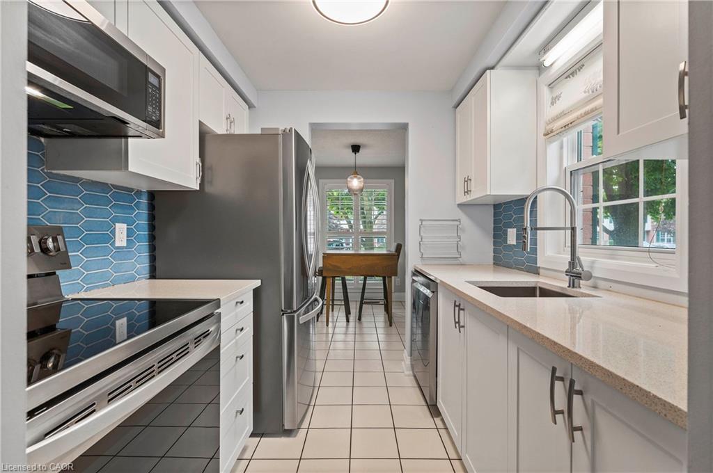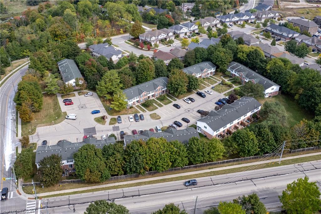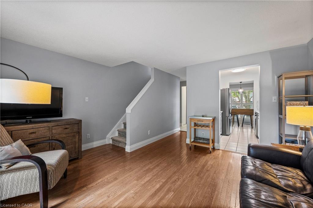 This beautifully maintained 2-storey end unit townhome is located in sought-after Riverpark Village community. Perfect for first-time buyer, a young family, an investor or down-sizing! It’s move-in ready and has it all. Carpet-free with hardwood, ceramic tile and laminate. New trim & doors. Custom shutters and blinds The kitchen is fully equipped with stainless appliances, updated white cabinetry and quartz countertop. Adjacent is the cozy dining area, perfect for enjoying meals with loved ones. The living room leads outside to your own private backyard oasis featuring a deck, partial fencing & access to mature green space with many trees. It’s just perfect for summer BBQs or evening relaxation. The adjacent playground is perfect for young children! Upstairs are 2 generously sized bedrooms, each with picturesque views from the windows. The primary bedroom includes his-and-her closets, while the 4pc shared bathroom features a shower/tub combo. The fully finished basement has recroom that can also be used as a playroom, home gym or media space. There is also a 2pc bathroom, laundry & ample storage space. Nestled in a serene, family-friendly complex, this home offers unmatched access to everyday essentials. Close to RIM, Bechtel and Kiwanis parks, recreation facilities, walking/biking trails, Conestoga mall, Kaufman flats, the Grand River, groceries, schools, public transportation and major transit routes.