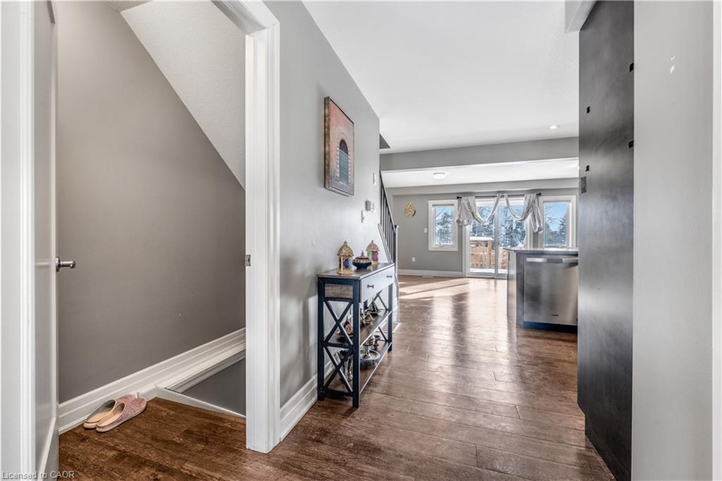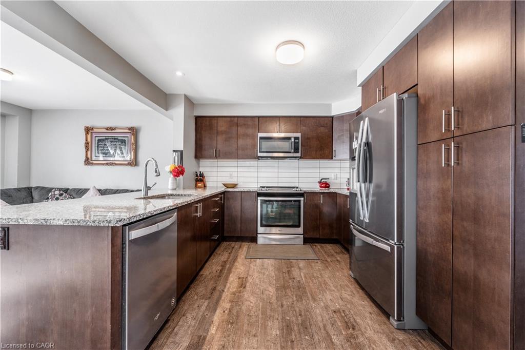 STYLISHLY UPGRADED TOWNHOME. 34 Nieson Street, Cambridge an elegantly upgraded freehold townhome set within a coveted, family-friendly neighbourhood. Backing onto green space and thoughtfully upgraded throughout, this move-in-ready home offers both refined style and practical living in a location that truly delivers. Step inside to a bright, open-concept main floor where natural light pours through large windows and laminate flooring creates a warm, welcoming atmosphere. The layout flows effortlessly with the gourmet kitchen, showcasing granite countertops, stainless steel appliances, sleek modern cabinetry, and a breakfast bar that invites casual meals, morning coffee, and effortless hosting. Overlooking the living and dining area, this space is designed to keep everyone connected. Upstairs, the primary suite is a serene retreat, complete with a spacious walk-in closet and a beautifully appointed 3pc ensuite featuring a glass walk-in shower. 2 additional sun-filled bedrooms, a stylish 4pc main bathroom, and the convenience of second-floor laundry complete this level. The fully finished basement adds incredible versatility, offering a generous recreation room, a newly completed modern 3pc bathroom, and ample storage — perfect for a home office, guest suite, gym, or additional living space. With thoughtful upgrades throughout, this home has been meticulously cared for. Ideally located close to schools, parks, shopping, and with quick access to Highway 401.