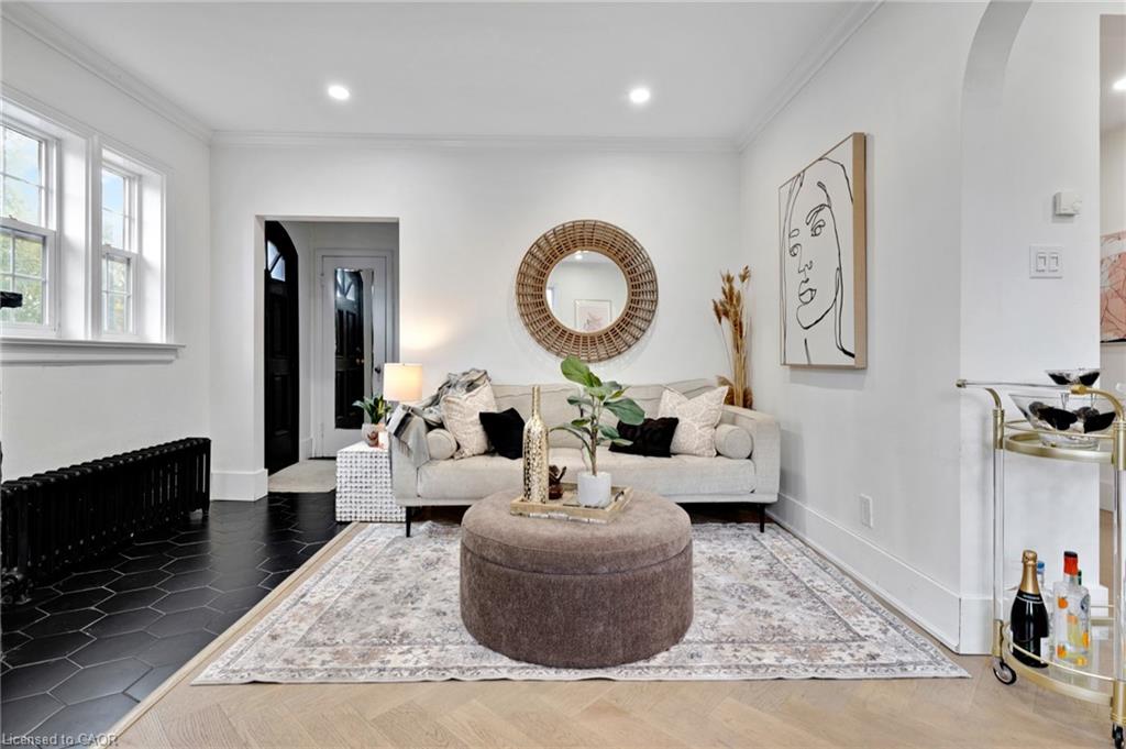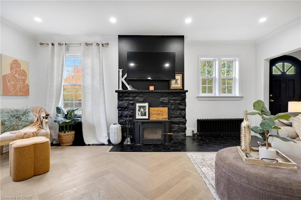 Welcome to 360 Luella, an enchanting 3 bedroom East Ward home set on a mature, tree lined street close to the heart of Downtown Kitchener. A flagstone porch leading to the all brick exterior, gorgeous cherry blossom tree and 4 car driveway with detached garage add to the whimsical curb appeal. The original character has been maintained inside and out, with mechanical upgrades and aesthetic updates to give a compelling mix of charm and elegance. Step inside to the open concept living room and kitchen, where you will love the many large windows letting in natural light and the contrast of modern black octagon tile, black stone wood burning fireplace and the classic herringbone hardwood floors. The chic kitchen blends style and class with gorgeous light wood cabinetry, black backsplash and hardware, stainless steel appliances and exquisite Calcutta marble countertop and breakfast bar. The main floor also features 2 spacious bedrooms, and 4 pce bath. Upstairs is your expansive primary suite with a sitting/dressing area, pine floors and huge walk in closet. This space would be ideal to build an ensuite to give you your own private bathroom. Back downstairs, to the back of the kitchen is a separate entrance taking you to the large, full sized basement with an easily-to-be finished rec room with gas stove fireplace, laundry and plenty of storage. Take the backdoor to your private fully fenced yard and enjoy the outdoors and serene greenery on the quaint patio. Situated just minutes to the expressway, short walk to the Ion, Downtown, Farmers Market, Centre in the Square, Library, parks, schools as well as bistros pubs and restaurants, perfect for those who love the Urban lifestyle with the perks of owning freehold and having private outdoor space!