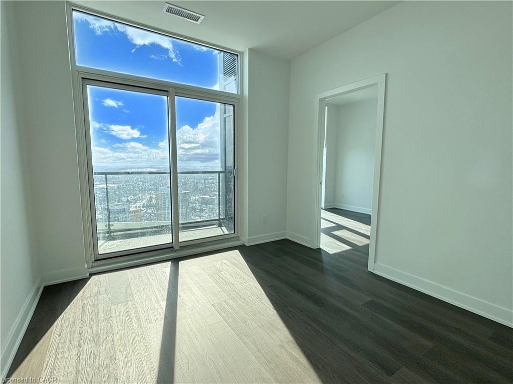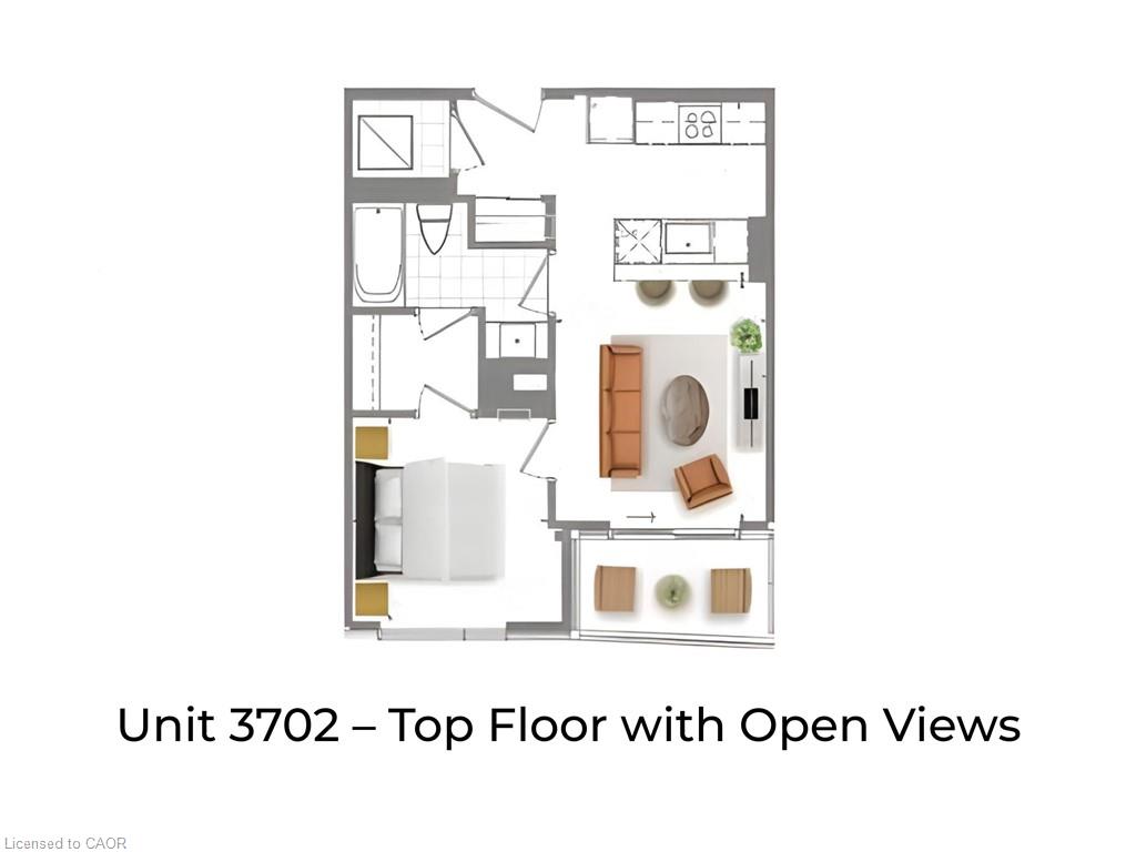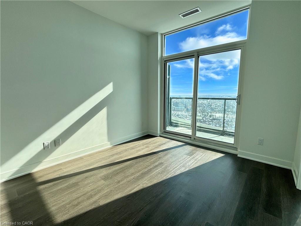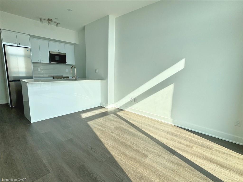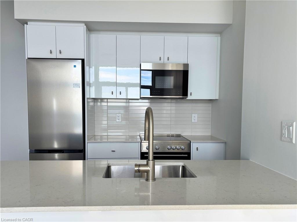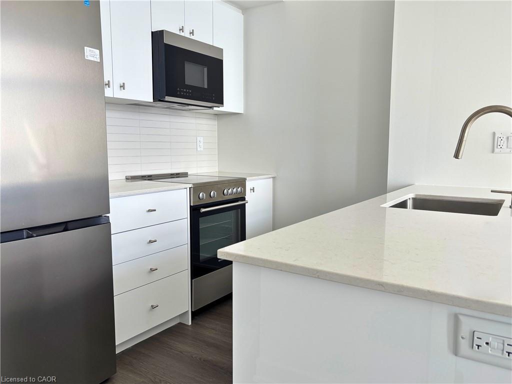 Welcome to Station Park. This bright, top-floor suite features fantastic views, no neighbours above, and a modern open-concept layout. The kitchen is designed with a large island and breakfast bar, stainless steel appliances, and in-suite laundry. The spacious bedroom boasts a walk-in closet and convenient ensuite access to the 4-piece bath. Rent includes internet, A/C, and heat; tenants pay hydro and water. One parking space and a private locker are included. Enjoy exceptional amenities: sauna, outdoor gym, half running track, fitness and Peloton studio, bowling lanes, lounge and bar, music room, and hydro-pool swim spa. Steps to Google, the University of Waterloo School of Pharmacy, and downtown Kitchener.
