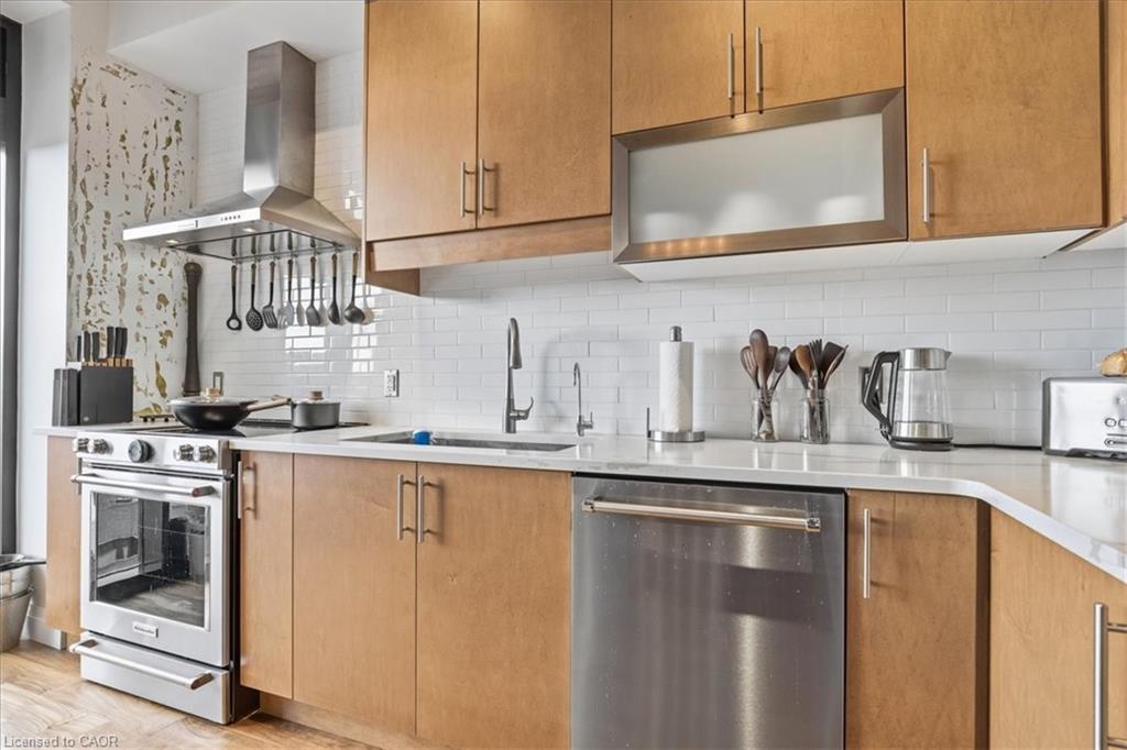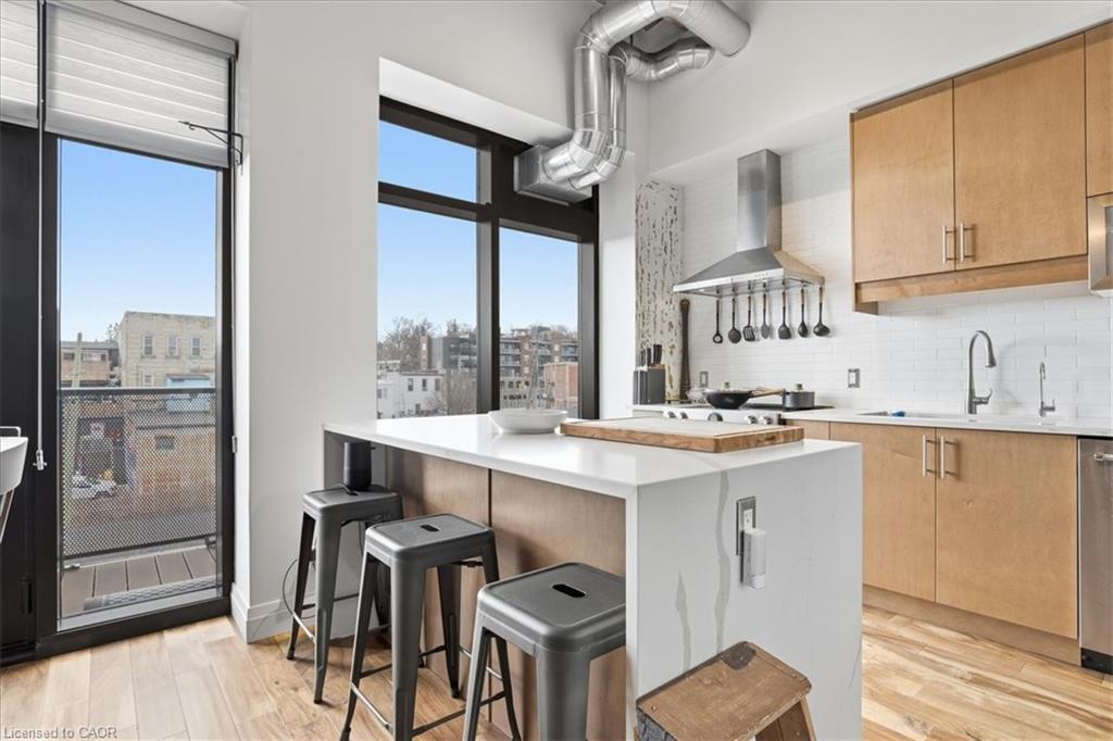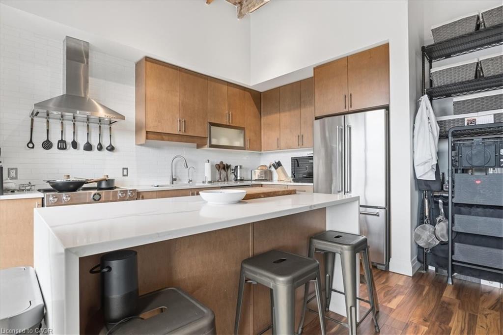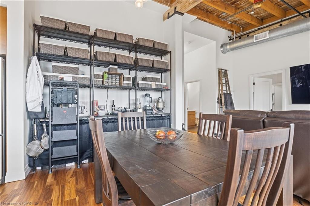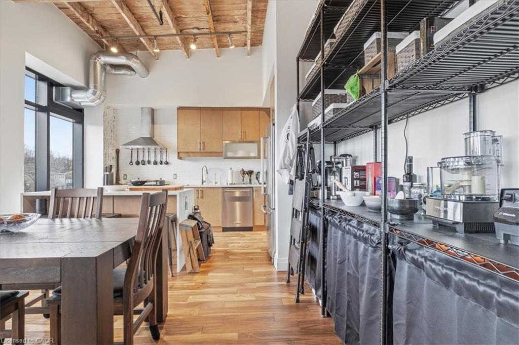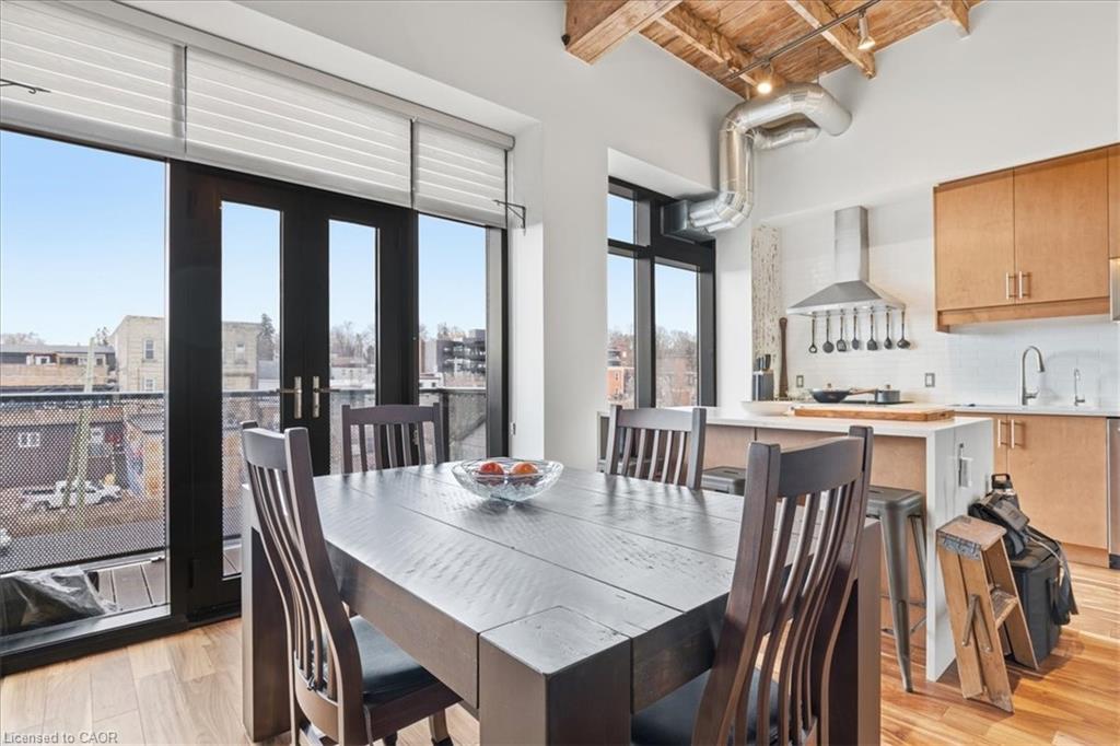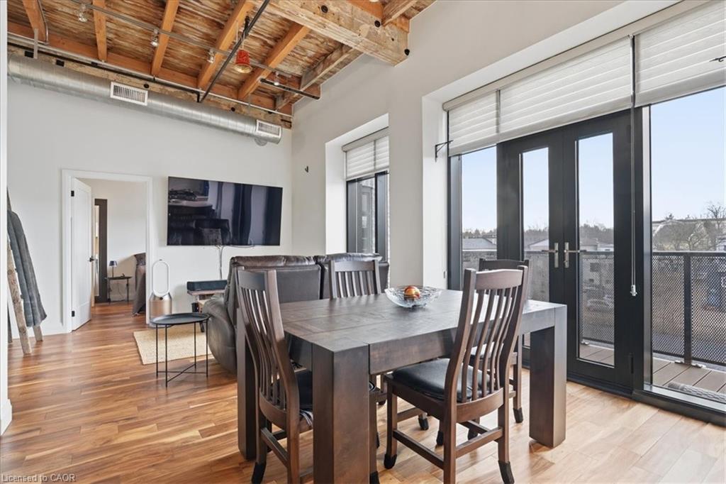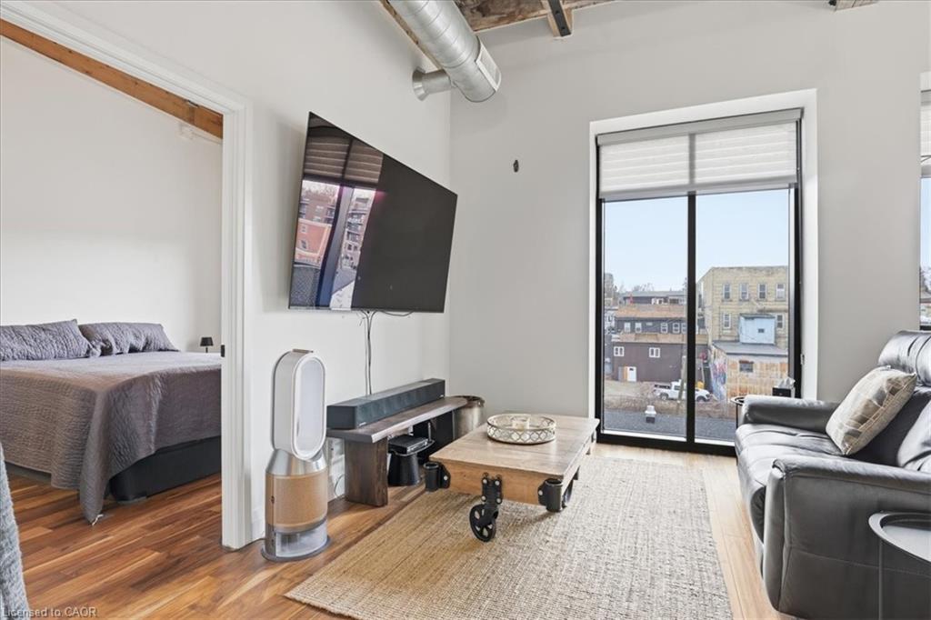 Welcome to Riverbank Lofts, one of Cambridge’s most iconic and architecturally rich residences where historic industrial character meets refined, modern luxury along the banks of the Speed River. Set within the landmark former American Standard factory, thoughtfully transformed in 2020, this boutique building offers a truly unique ownership opportunity in the heart of downtown Hespeler, just steps to charming cafés, restaurants, trails, and vibrant community life. This exceptional one-bedroom residence is defined by its dramatic scale and design. Soaring 12-foot ceilings and striking floor-to-ceiling windows create an airy, light-filled space, while exposed stone walls and reclaimed wood beams add warmth, texture, and unmistakable character rarely found in today’s market. The open concept living space is both elegant and functional, seamlessly connecting to a beautifully appointed kitchen featuring quartz countertops, stainless steel appliances, and an oversized island with breakfast bar ideal for entertaining or relaxed everyday living. Step out to your private balcony and take in the charm of downtown Hespeler, a perfect extension of your living space. The spacious bedroom offers a serene retreat, complete with a generous walk in closet, while in suite laundry and thoughtfully designed finishes throughout enhance comfort and convenience. Residents of Riverbank Lofts enjoy access to an impressive collection of amenities, including a fully equipped fitness centre, multiple designer lounges, bike storage, and a dedicated dog wash station curated to support a sophisticated, low maintenance lifestyle. Complete with a owned parking space and ideally located just minutes to Highway 401, this residence offers the perfect balance of tranquility, connectivity, and urban convenience.