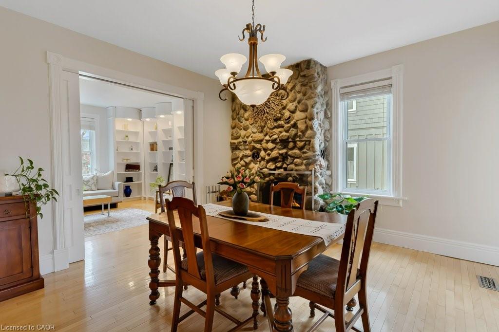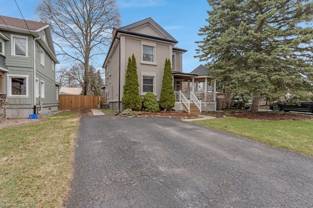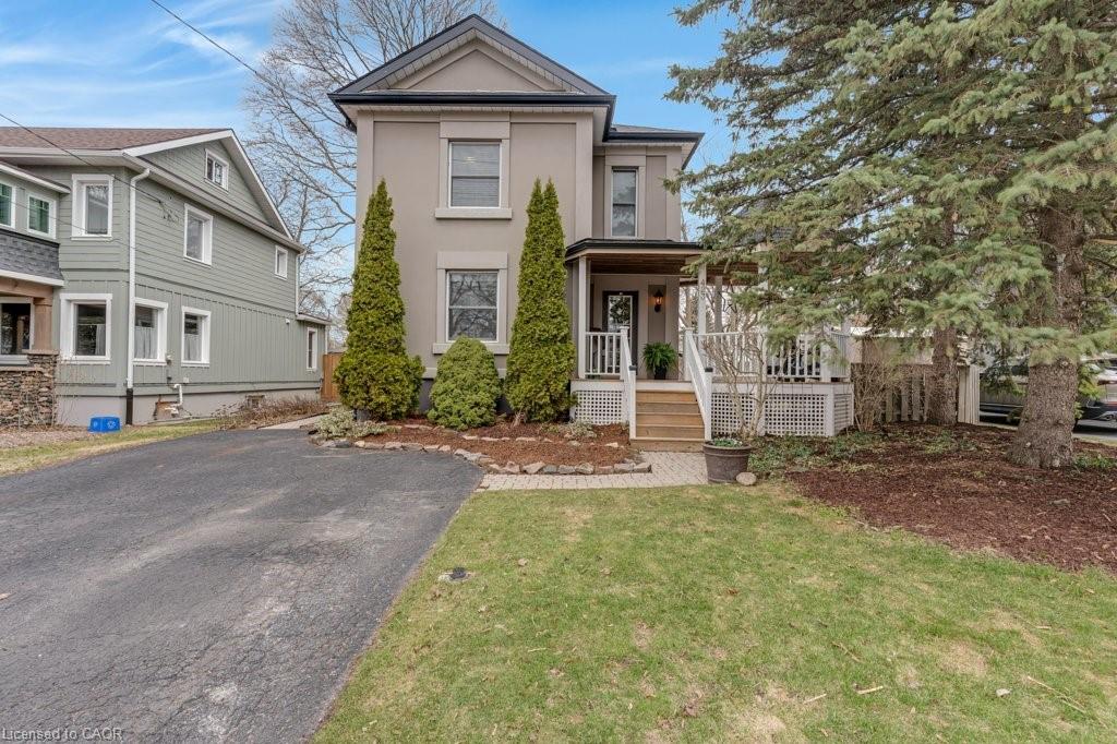Looking for a beautiful century home is Preston? This home has been lovingly cared for with 3 bedroom, 2 baths and nicely updated touches throughout. The generous pool-sized lot is one of the best in the neighborhood at 165 ft. deep, double driveway offers parking for 3. The front porch is welcoming with a sitting area under a quaint gazebo. Upon entering you are surrounded by the charm of an older home including its elaborate trim. The living and dining room are open but connected by pocket doors. This space is bright with gorgeous windows and built-in floor to ceiling shelves while the dining room features a wood fireplace and plenty of space for your larger family to gather. The addition of a mudroom at the back offers two entrances from the outside, one from the side of house and the other from the back porch. A 2pc bath in conveniently located here. The kitchen at the back of the house has terra cotta tiles with chefs desk and island as well as the garden door exit to the stunning covered porch and fully fenced park-sized yard. The covered porch is the extension of your living space for almost all seasons. This enormous lot is like being on a nature walk. Family BBQ's, reading by the fire, maybe a future pool ... or imagine the hockey rink for the kids! The privacy and space is endless. The 2nd level has 3 bedrooms with a large primary boasting a large walk-in closet. The main 4pc bath has a separate tub and shower as well as the laundry and plenty of storage cabinets. There is a walk up to the unfinished attic space. The basement rec room is cozy with carpet and extra nooks for hobbies or work space. The utility and storage areas offer a work bench and even more storage. Moments walk to the river and Riverside park and downtown Prestons shops and restaurants. Please take a moment to review the marketing video, floor plans, and 360-degree photography to get a better grasp of this exceptional property.