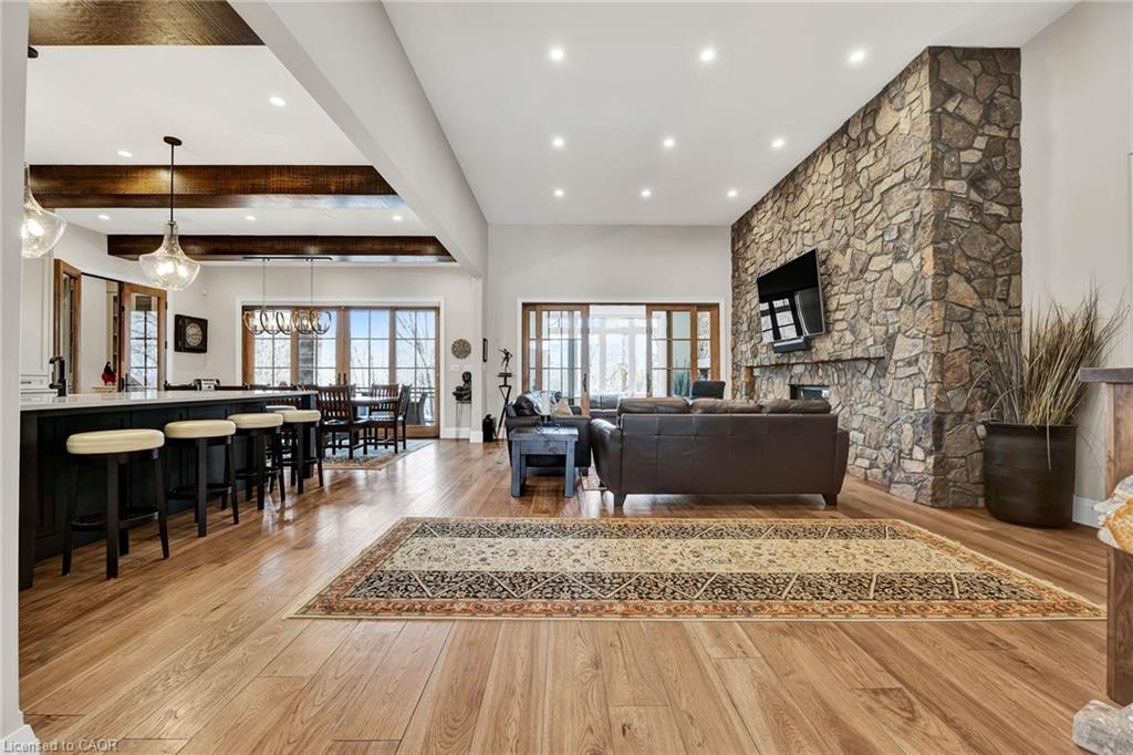 Located in the prestigious Deer Ridge community, this custom-built home stands apart for its thoughtful design, refined finishes, and award-winning features. Every detail from the materials selected to the layout of each space has been crafted with purpose. The main level features a chefs kitchen with dovetail soft-close cabinetry, quartz countertops and backsplash, a Wolf gas range, and a striking wrought iron hood. White oak ceiling beams add warmth, while a large island provides the perfect space for gathering. The kitchen flows into a dedicated dining space illuminated by oversized windows. A full-height custom stone fireplace anchors the great room, leading seamlessly into a cozy sunroom with a second fireplace and views of the backyard. Also on the main floor are a spacious laundry/mudroom, a private office, and a second bedroom. The primary suite is a private retreat with coffered ceilings, large windows, a custom walk-in closet, and an elegant ensuite featuring a tiled walk-in shower, soaker tub, and double vanity with gold accents. The basement is built for both wellness and entertainment, featuring two more bedrooms, a bright indoor pool, fully equipped fitness room, and a luxurious bathroom recognized with an NKBA Ontario Honourable Mention. Entertain in style in the custom Scotch Room and award-winning wet bar featuring double fridges, glass-front cabinetry, and interior lighting. This bar earned 1st place by NKBA Ontario awards and 2nd nationally by the Decorators & Designers Association of Canada. A built-in entertainment unit with Sonos sound completes the space. This is a home where luxury meets liveability where every room supports the way you want to live, without compromise. Don't miss this opportunity! Book a private showing today!