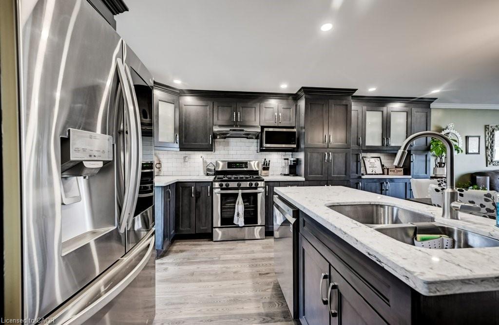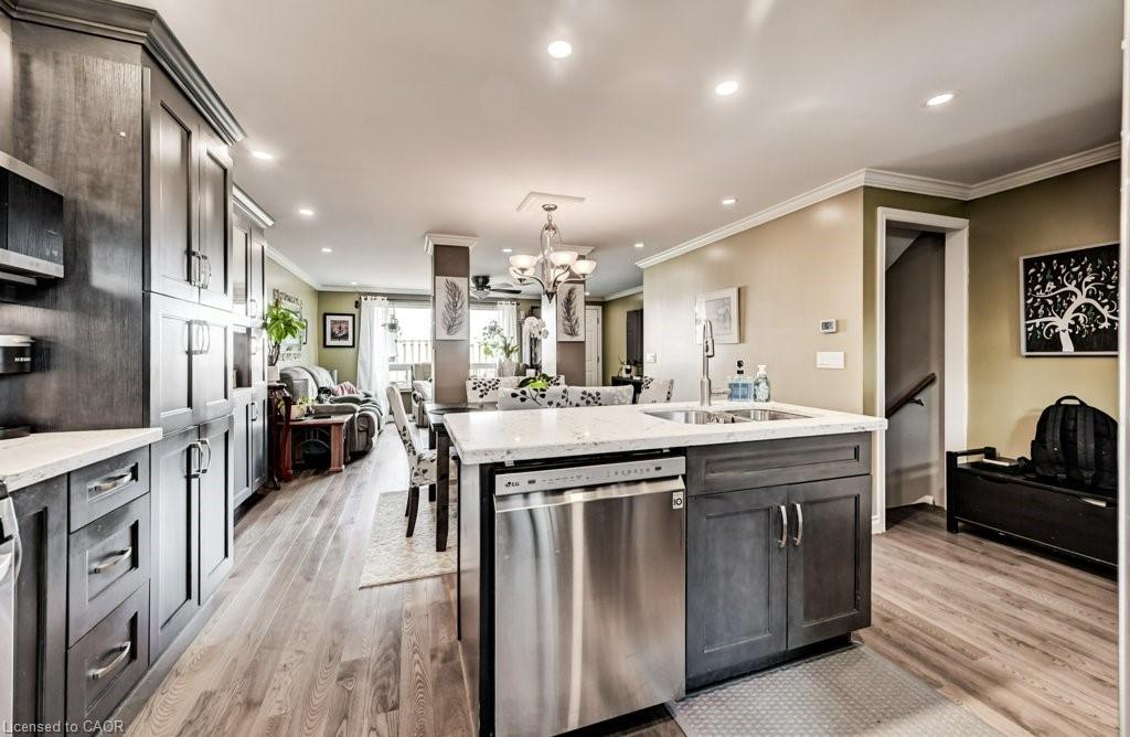 Over $100,000 has been invested in upgrades in this stunning luxury end-unit townhome. Completely transformed, this home offers a bright, open-concept layout with a sleek, modern feel throughout. The show-stopping, high-end kitchen is truly breathtaking, featuring a custom-designed Canada Maple Kitchen with quartz countertops, premium appliances, and exceptional attention to detail—perfect for even the most discerning buyer. The main floor has been fully taken back to the studs and rebuilt with new drywall, plumbing, and wiring. Structural LVL beams span from foundation to foundation, creating the seamless open-concept design. Additional highlights include Ash flooring, crown mouldings, recessed dimmable lighting, and a cozy electric fireplace built by Dimplex. Major mechanical updates provide peace of mind, including newer central air, an on-demand hot water heater, water softener, and an upgraded hydro panel. The washer and dryer are also newer, and brand-new front, back, and screen doors were just installed. The home has been further enhanced through the Green Energy Program with added insulation from the walls up to the attic. Enjoy maintenance-free living with condo fees that cover all exterior components, including water and sewer. The condo corporation is also scheduled to complete the roof in 2026, adding even more value. This home is ideally located in sought-after Galt North, just minutes to all amenities and with convenient access to Highway 401. Added Bonus: The seller is including three wall-mounted TVs—85” in the living room, 60” in the recreation room, and 46” in the primary bedroom. Luxury awaits—don’t miss your opportunity to own this exceptional home