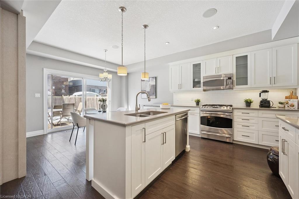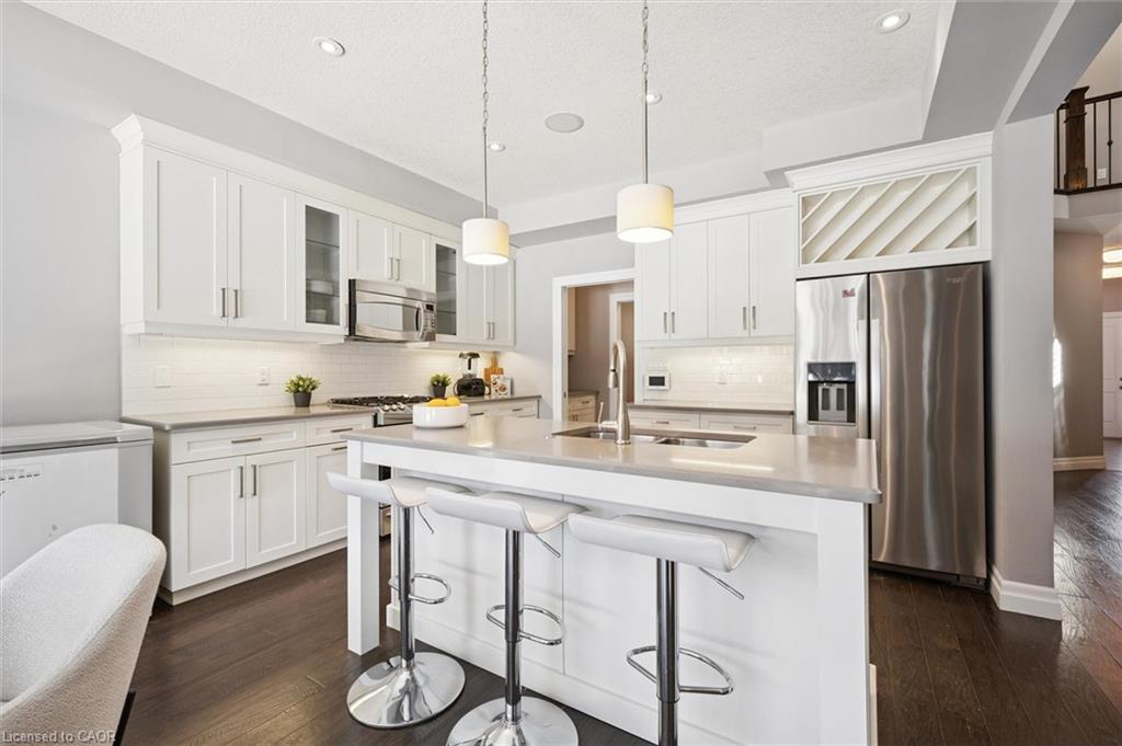 Modern. Bright. Move-in ready. And set in one of Waterloo's most family-loved neighbourhoods, Clair Hills. You know that feeling when you walk into a house and it just feels right? Get ready for that feeling. From the moment you step inside, the dramatic open-to-above living room with soaring ceilings and an elegant iron-spindle staircase takes your breath away. Rich, dark hardwood floors flow throughout the main level, connecting a show-stopping open-concept kitchen designed for real life and entertaining. Think quartz countertops, a gas range, white shaker cabinetry, a massive centre island for homework and wine nights alike - and a walk-in pantry with its own counter space. Upstairs, the primary suite is a genuine retreat: nearly 450 square feet of space, a spa-like 5-piece ensuite, and a walk-in closet so large you might need to go shopping just to fill it. Two more generously sized bedrooms, a 4-piece bath, and a bright, oversized office with French doors round out the second floor. Downstairs, a huge unfinished basement with a bathroom rough-in is ready for your vision - rec room, home gym, playroom, or all of the above. Step outside to your private, fenced backyard, perfect for summer barbecues while the kids run free. And the location? Steps to Edna Staebler PS, the YMCA daycare, St. Moritz Park, Laurel Heights Secondary School, KW Bilingual Private School, and kilometers of trails. Costco and The Boardwalk are minutes away. This is the house you pictured when you started your search. Welcome home.