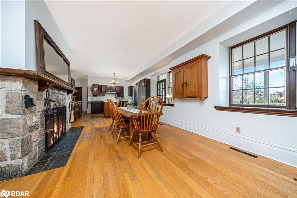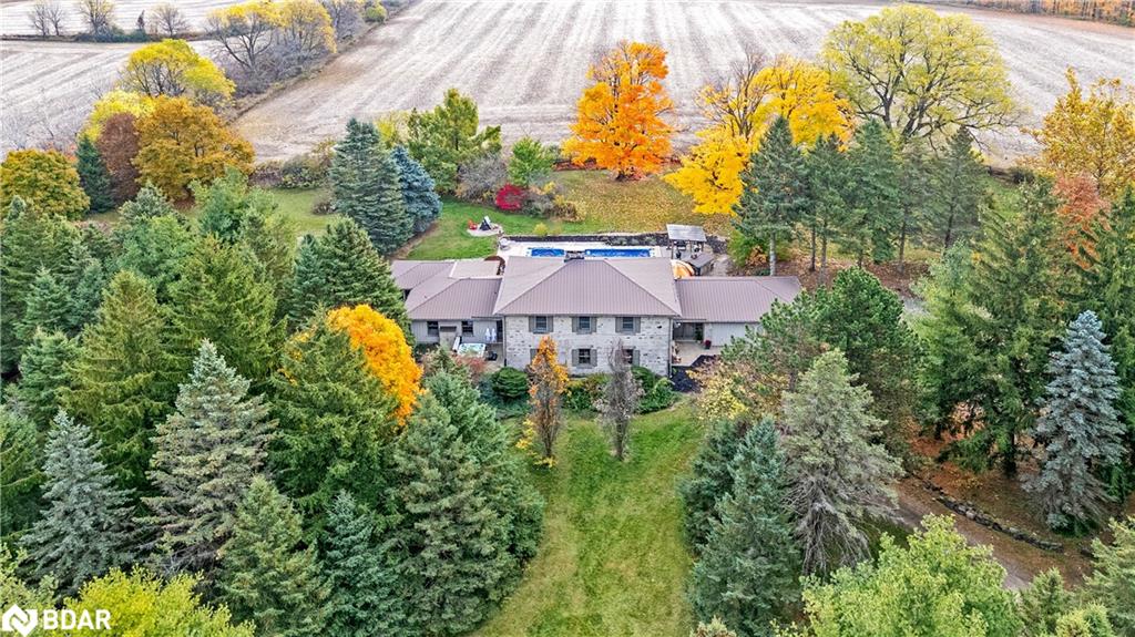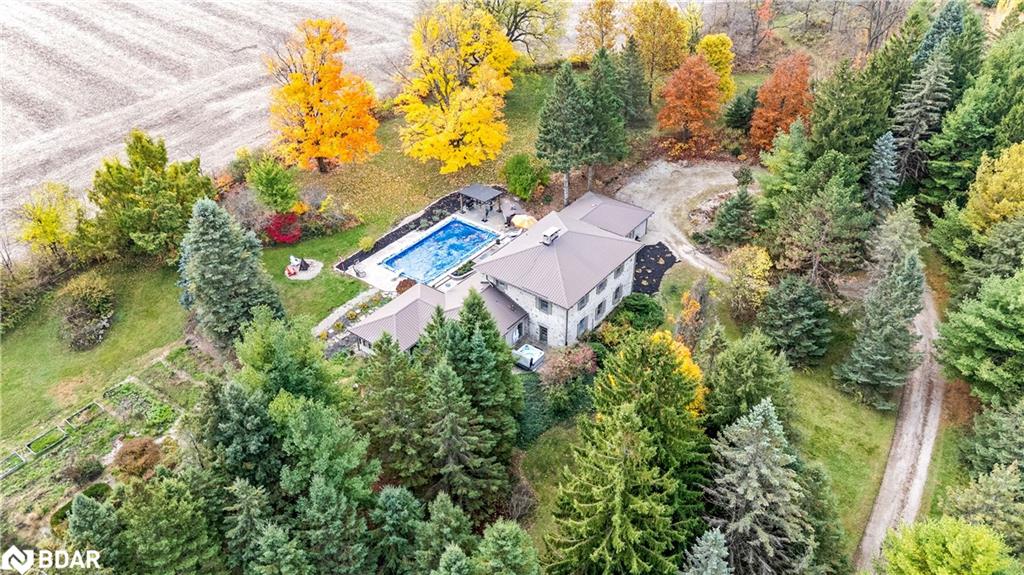 This circa 1875 fieldstone farmhouse has been thoughtfully redesigned by architect Grant A. Whatmough and is set on approximately 99 acres behind a gated entry. Maintaining classic charm and modern convenience, this property is ready for a new family to carry on the tradition. The main floor welcomes you with a double door entry leading into a spacious open concept kitchen and large living area highlighted by a stone fireplace and deep windowsills. The kitchen features Corian counters, stainless steel appliances, a center island, and walkout access to a covered stone patio and in ground pool. Enjoy cozy breakfasts by the wood burning fireplace or host larger gatherings in the formal dining room. A rare main floor primary suite offers hardwood floors and a walkout through double French doors to a sunroom with heated floors overlooking the perennial filled backyard and pool. The spa style ensuite includes heated tile floors, a double glass shower, and a soaker tub. Upstairs, you will find four bright and spacious bedrooms, each with closets and windows overlooking the private property. Along with the added ceiling height, this level features two updated baths, upper level laundry, and generous closet space. Outdoor living is highlighted by a 20 x 40 geothermal heated marbelite pool with diving board, a flagstone patio, and a covered entertainment area complete with a pizza oven and cooking space. A heritage post and beam barn with hayloft, a secondary garage or shed, and a silo enhance the property's charm. Mechanically, the home offers dual geothermal systems for the house and pool, radiant in floor heating, two drilled wells, and an active lease on approximately 52 workable acres. Trails and a 21 acre woodlot provide endless opportunities for exploration. This one of a kind rural retreat is just minutes from town amenities and ready for its next family to enjoy.