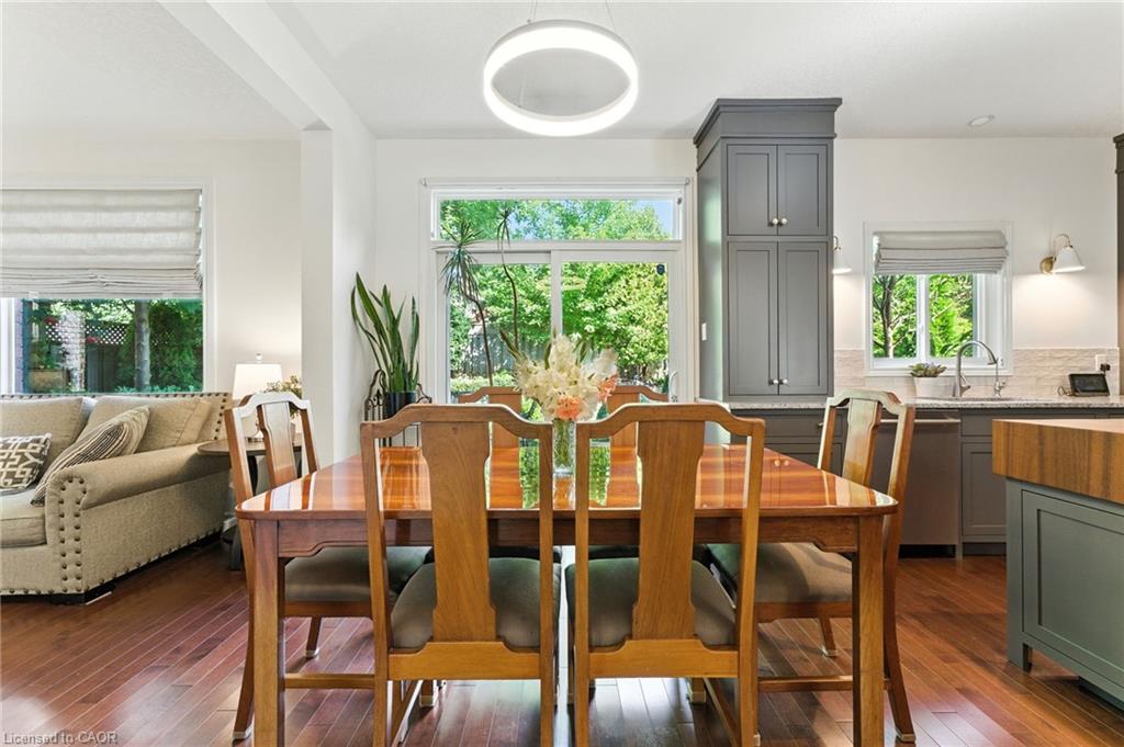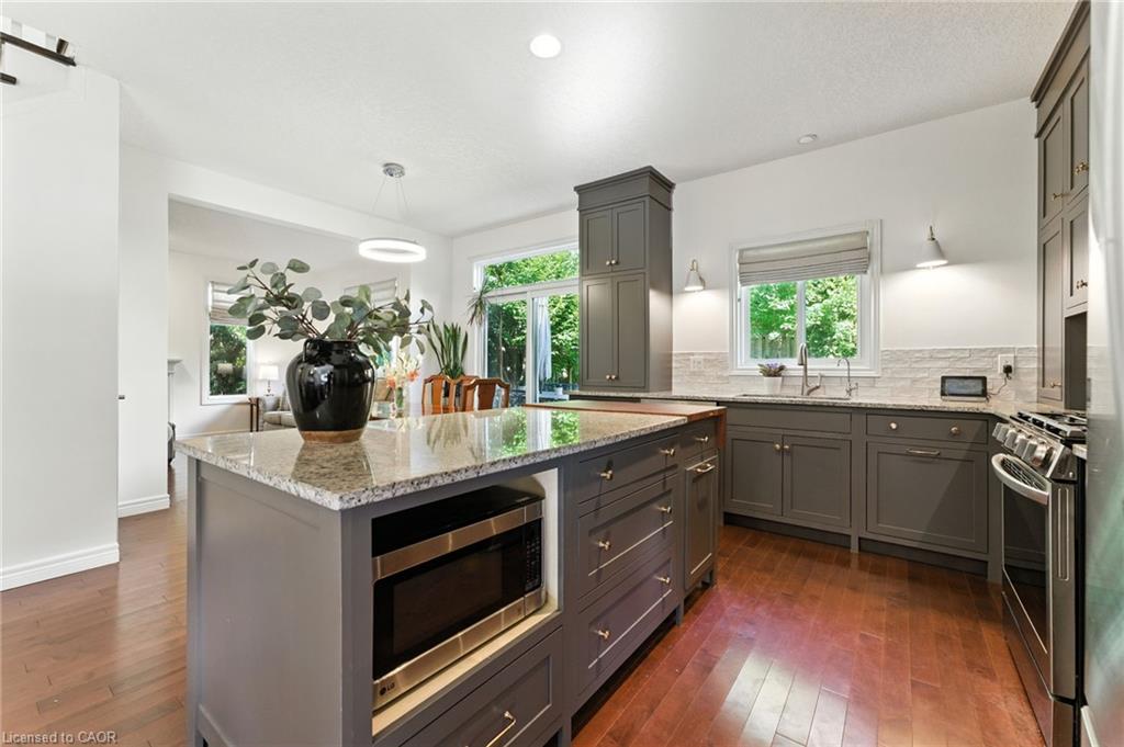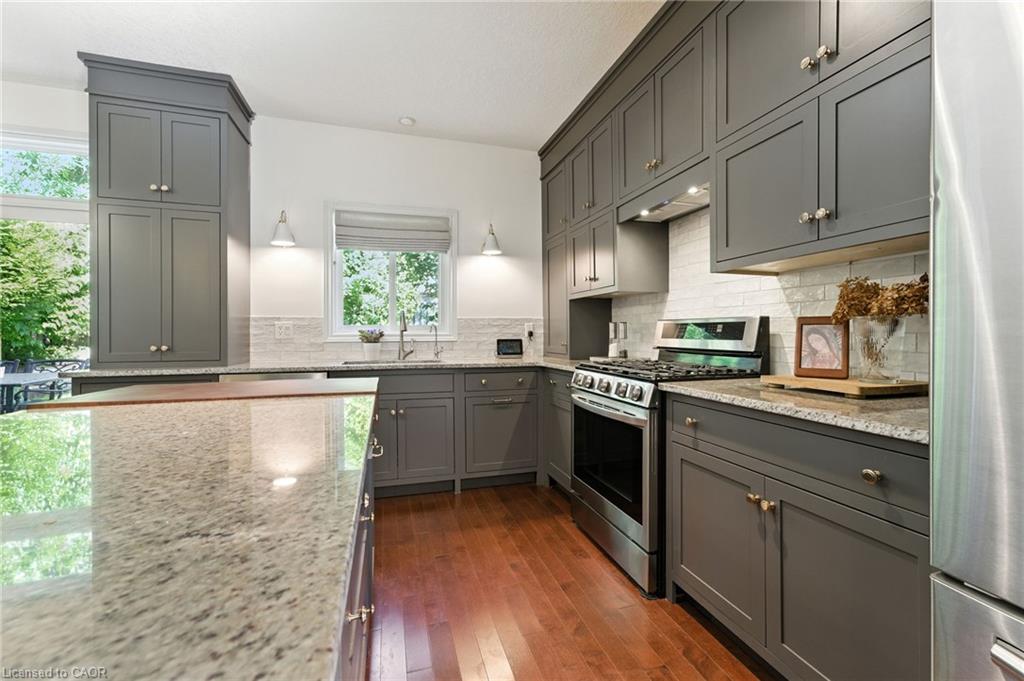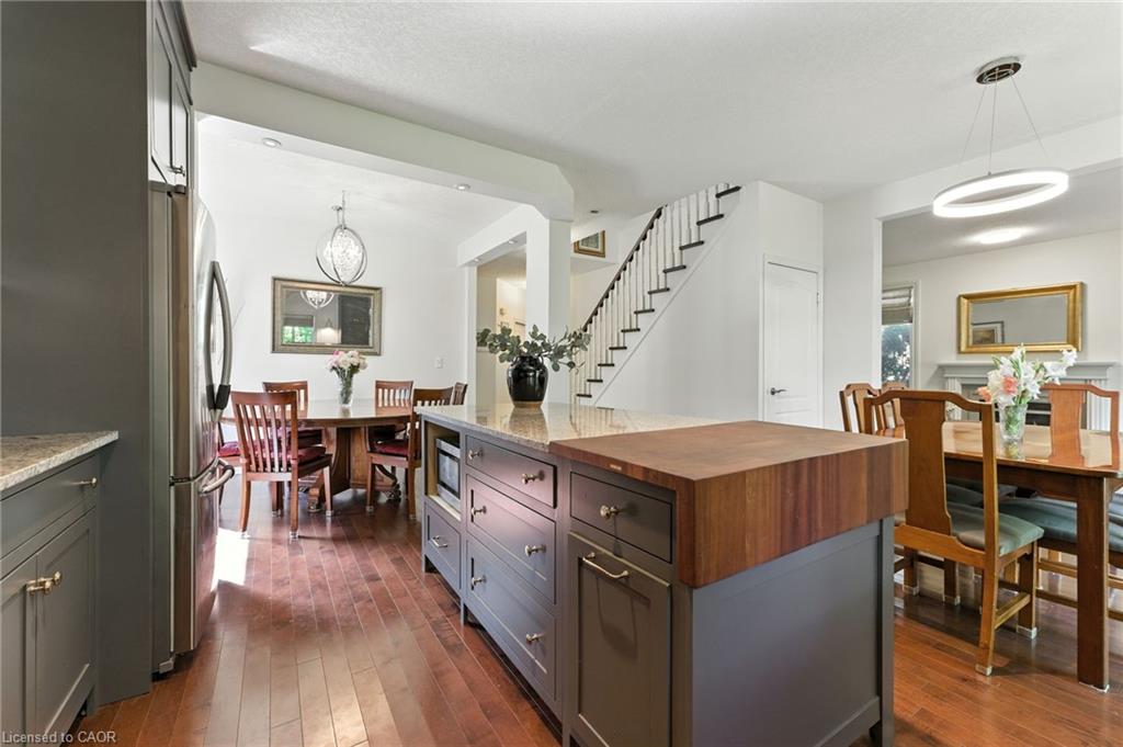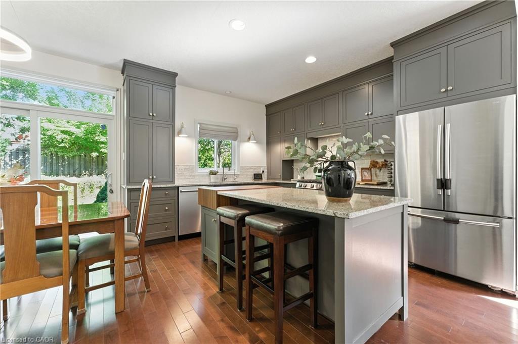 Welcome to 506 Eastbridge Blvd, Waterloo. This beautifully updated 2-storey home offers the perfect balance of comfort, style, and thoughtful upgrades in one of Waterloo’s most sought-after neighbourhoods. Located in the quiet Eastbridge community, you’re just minutes from schools, shopping, and walking trails along the Grand River. Step inside to a bright and airy main floor, where high ceilings and expansive windows fill the home with natural light. The custom kitchen features floor-to-ceiling cabinetry, granite and butcher block countertops, a sensor-activated faucet, and 4-step water purification system, paired with premium stainless steel appliances. The adjoining dining area and inviting living room with a cozy fireplace make it an ideal space for family gatherings. Premium maple hardwood floors carry throughout the main and second levels. Upstairs, the spacious primary suite includes a walk-in closet and a four-piece ensuite with a soaking tub. Two additional bedrooms and a 3 pc bathroom with ceramic finishes complete the second floor. Upstairs vanities installed in 2025. The finished basement expands your living space with two additional bedrooms, a family room, rustic ceramic shower, plenty of storage, and a cold cellar. Outside, enjoy your private garden oasis with lush greenery, with mature trees, fruit tree (plum), evergreens and perennials; a deck and patio perfect for entertaining or relaxing. The trees have been professionally treated by Pinnacle Tree.