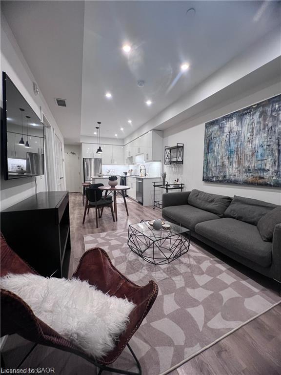 Discover modern living in this stunning 1-bedroom, 1-bath condo that combines style and convenience. With high ceilings and large windows, the unit is bathed in natural light, creating an open, airy feel. The carpet-free layout includes a sleek kitchen with a central island, upgraded appliances, and a luxurious walk-in tiled shower in the bathroom. The spacious walk-in closet provides ample storage, making this home both functional and sophisticated. Residents enjoy premium amenities, including a Rooftop Terrace with BBQ & Hot Tub, a fitness and business center, media room, bike room, dog washing station, and a serene courtyard with firepit, hot tub and BBQ. Ideally located near a variety of restaurants, shopping, scenic trails, and parks, this condo offers quick access to RIM Park, Conestoga Mall, St. Jacobs Market, universities, and Uptown Waterloo – perfectly blending urban convenience with serene surroundings.