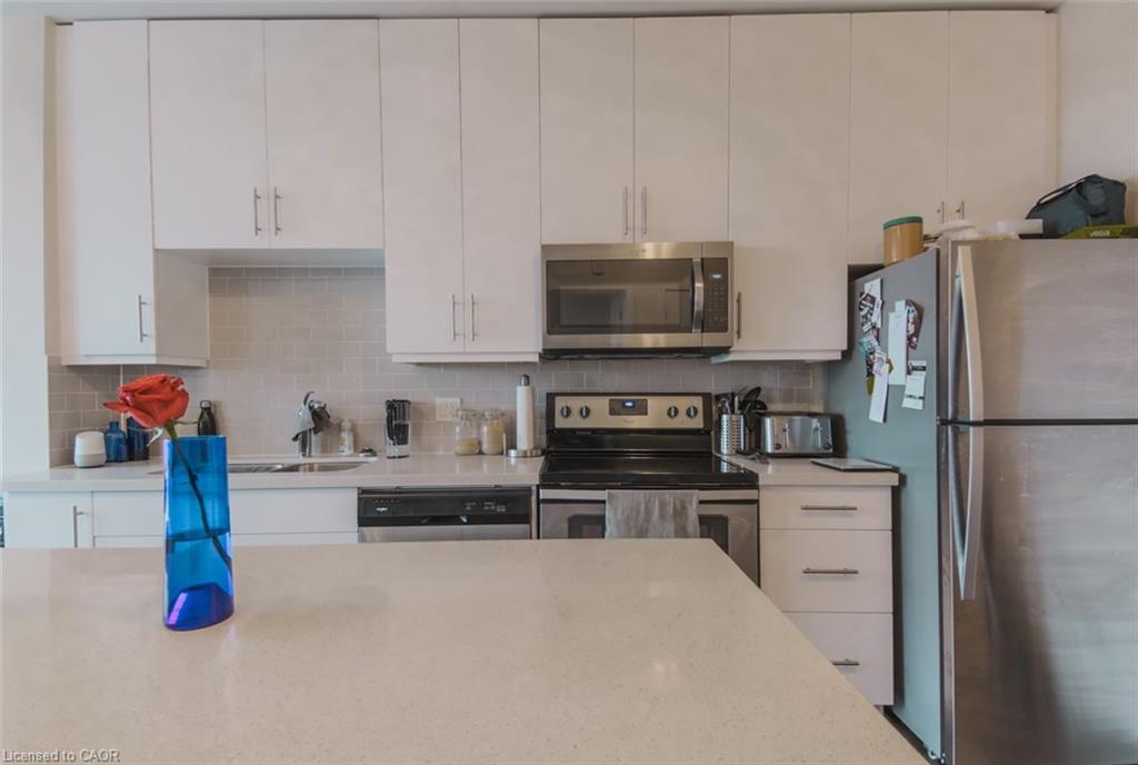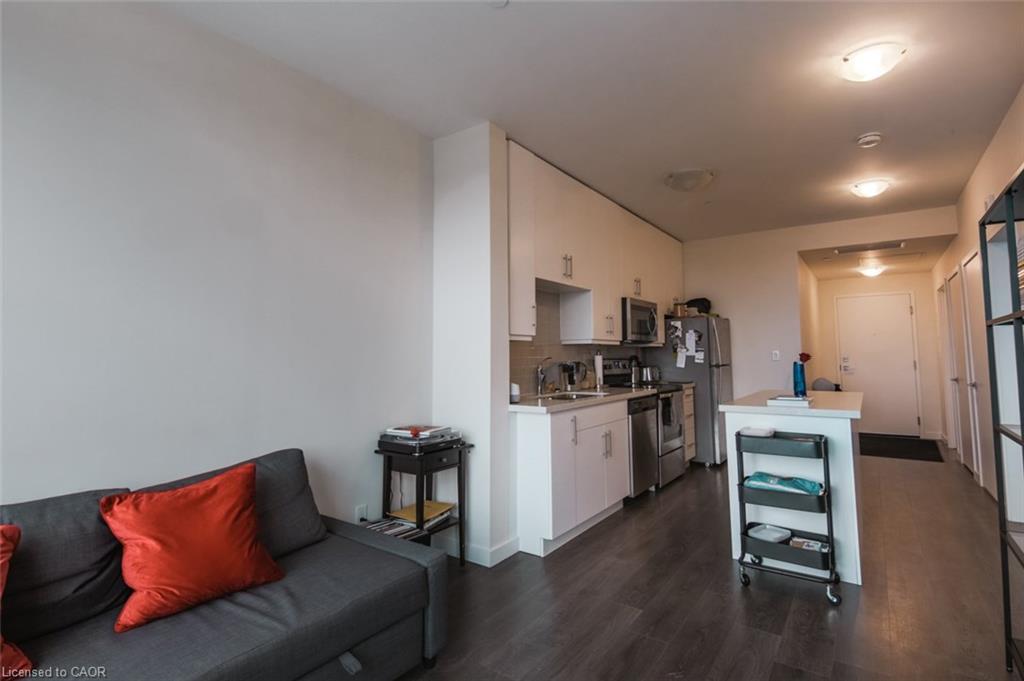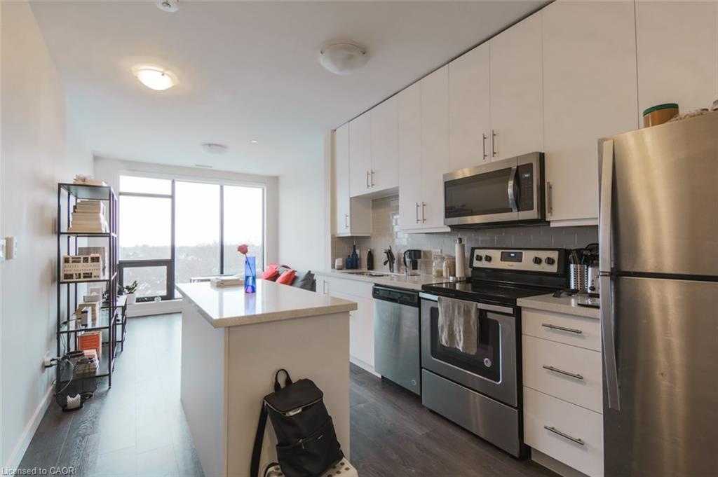 Highly UPGRADED 1 bedroom 1 bath condo in Kitchener’s trendy Boutique Style Midtown Lofts! This unit is bright and spacious with floor to ceiling 9 foot windows throughout which allows for tons of natural light. The large and functionable kitchen features quartz countertops, breakfast island, backsplash and stainless steel appliances. A spacious living room with access to the private balcony offers incredible views of the city. An over-sized bedroom with walk-in closet and a 4 piece bath with quartz countertops complete this unit! Carpet free with porcelain tile and laminate flooring throughout and convenient in-suite laundry. This unit comes with 1 underground parking spot and one storage unit. Also you get full use of the building amenities including a fitness center, lounge area and a professionally landscaped outdoor terrace with BBQ's. Prime location and just steps to the tech community such as Tannery, Google, Vidyard, Sunlife, School of Pharmacy, LRT, shopping, restaurants, café’s, Victoria Park and so much more! Available April 1st