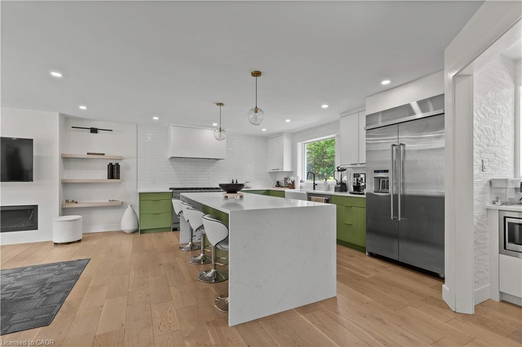 Updated executive home sits on a private court in Colonial Acres and backs onto a stream. There is plenty of room with the main floor office and five bathrooms. the main level is carpet free and features a beautiful floating staircase. The custom kitchen features a walk-in pantry and an island with seating. The bright living room features a built in fireplace and large windows. The dining area features its own built-in fireplace and walk out to backyard patio. Two of the five bedrooms have ensuite bathrooms. The primary features vaulted ceilings and a walk-in closet with built in organization. Prepare to be impressed by the 6 piece en-suite with its walkthrough shower, heated tiled floors and soaker tub. The finished lower level features a bar, wine cellar, gym and recreation room that walks out to the fenced rear yard. The spacious backyard features a 40' x 20' pool.