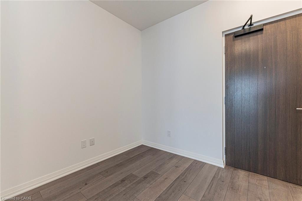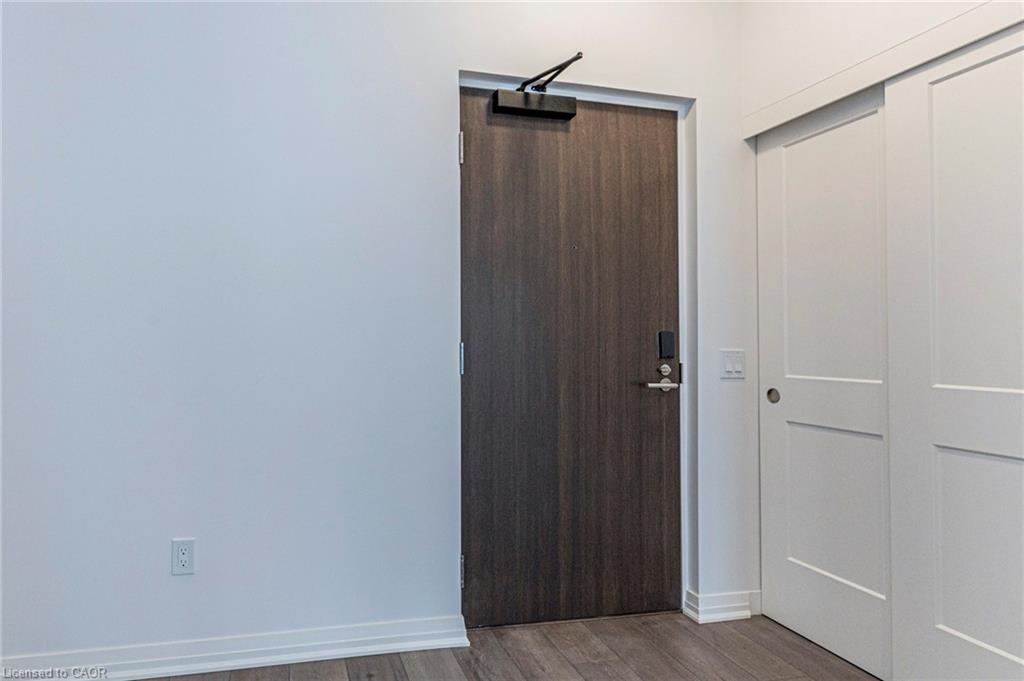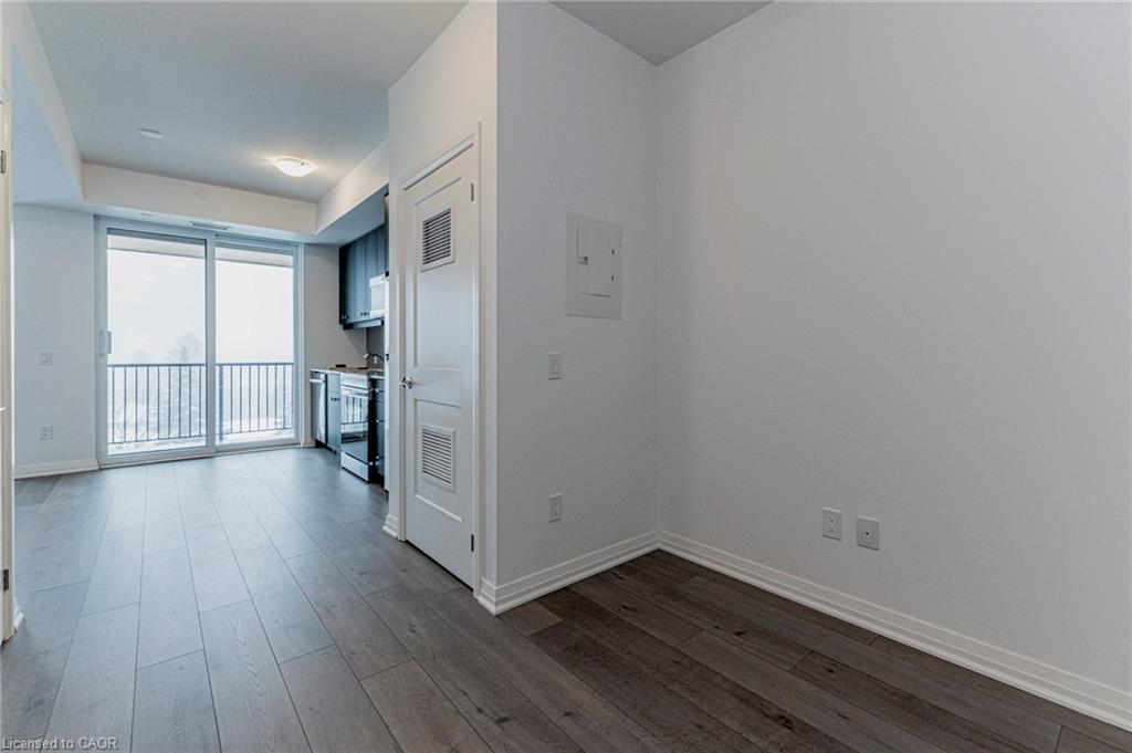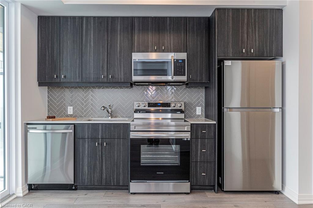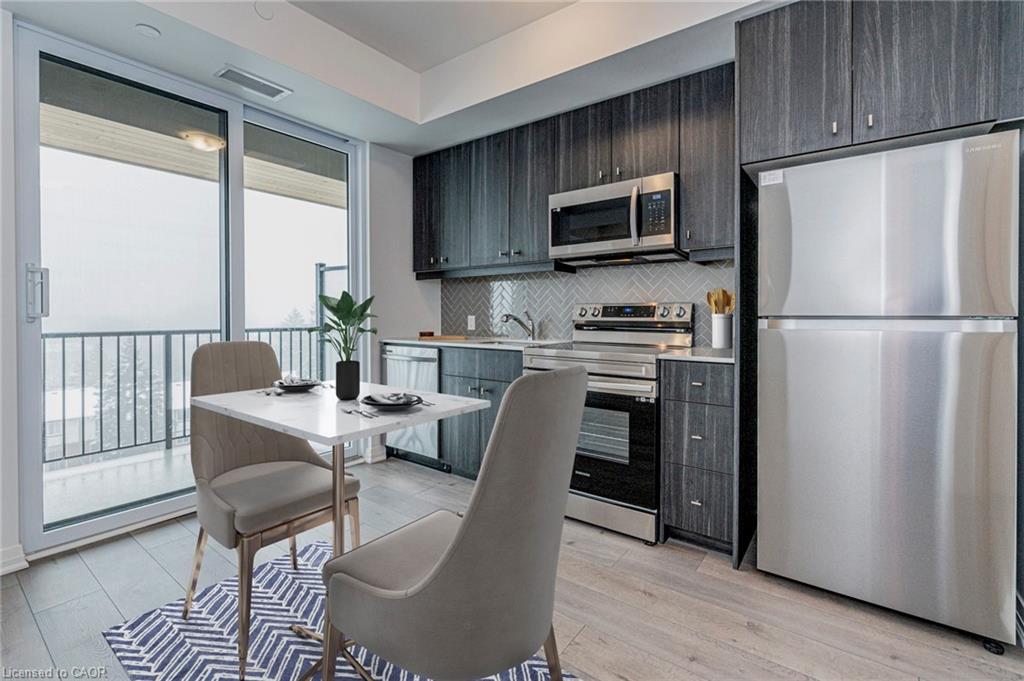 One of the nicest one bedroom plus den floor plans featuring 2 balconies, one off the bedroom and one off the living room adding an extension to your living space. Tied together seamlessly with upgraded wide plank flooring throughout. The 4 piece spa bath is beautifully finished with dark onyx porcelain tiles. The kitchen comes with 4 stainless steel appliances and a full size stackable washer and dryer. Amenities all within arm's reach. Get your morning pick-me-up at Starbucks or Tim Hortons just steps from your front door. Countless dining options await. With easy access to transit including the LRT and bus stops you can effortlessly explore the City or commute to work. The convenience of Highway 7/8 is also only minutes away. Stock up on groceries at Sobeys across the street, stroll to the bank or explore the vibrant St. Jacobs Farmers Market just down the road - it's all within your neighbourhood. With continuous development and investments in this area it's becoming a hotspot. With its unbeatable location, efficient design and access to a host of amenities, The Jake Condos provides the ideal backdrop for everyday living. Building features include the community mailboxes with large parcel receiving area, professionally designed landscaping with an irrigation system, common lobby lounge and semi-private lounge area and a contemporary peloton studio/gym. Tenants pay for hydro/water/water heater rental. This unit comes with one underground parking spot EV#58 with EV access. Available Now!