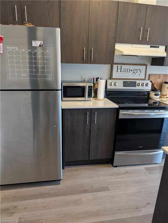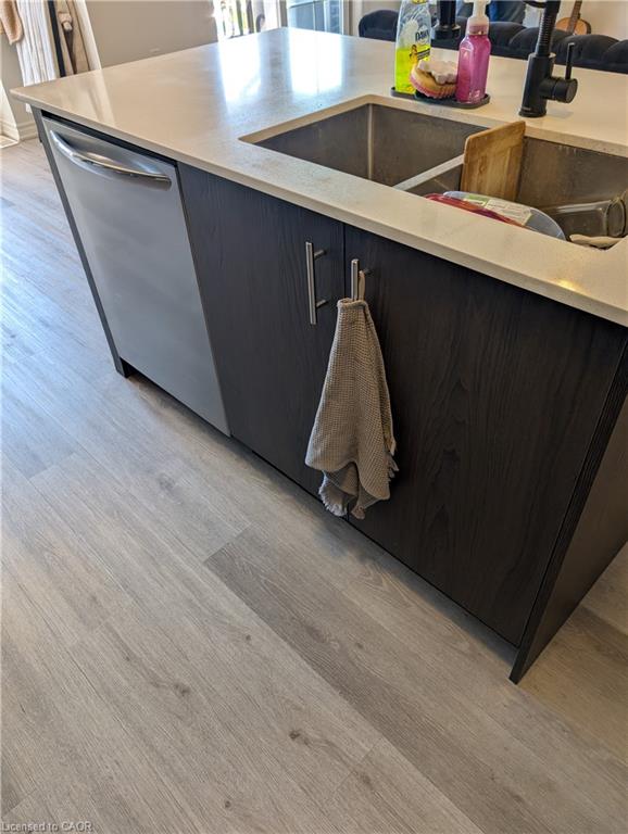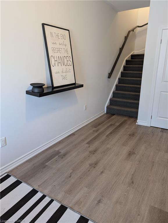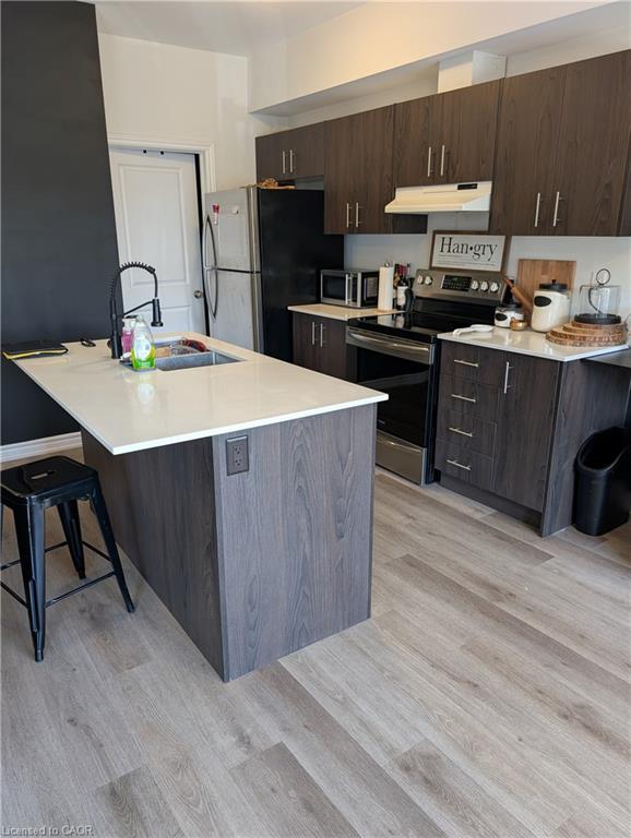 This stunning, spacious townhome is perfect for newcomers, couples, and families alike. Featuring an exceptional layout, this home boasts 2 generous bedrooms with oversized windows, a versatile den ideal for a home office, and 2 modern bathrooms. The upgraded kitchen is a chef's delight, showcasing sleek quartz countertops, a large island with a breakfast bar, and stainless steel appliances, making it perfect for cooking and entertaining. The open-concept living and dining area flows seamlessly to a walkout balcony, your ideal spot for enjoying evening tea or weekend coffee while basking in the warmth of natural sunlight that fills every room. Additional highlights include easy-to-clean premium vinyl plank flooring, cozy carpeted stairs and bedrooms, and practical ceramic floors & quartz countertops in the bathrooms. There is also a large pantry /laundry closet in the Kitchen for added convenience. Enjoy the luxury of a private garage and driveway to park 2 cars, with visitor parking conveniently located right across from your home, making hosting a breeze. The community is unbeatable, with a kids' park just a 2-minute walk away and all essential amenities within a 5-minute drive, including grocery stores, daycare, schools, and Cambridge Memorial Hospital. Plus, quick access to HWY 401 in under 10 minutes saves you valuable time. This townhome combines beautiful finishes with functional design, making it an ideal choice for families or professionals. Don't miss this opportunity to live in comfort and style in a highly desirable neighborhood!