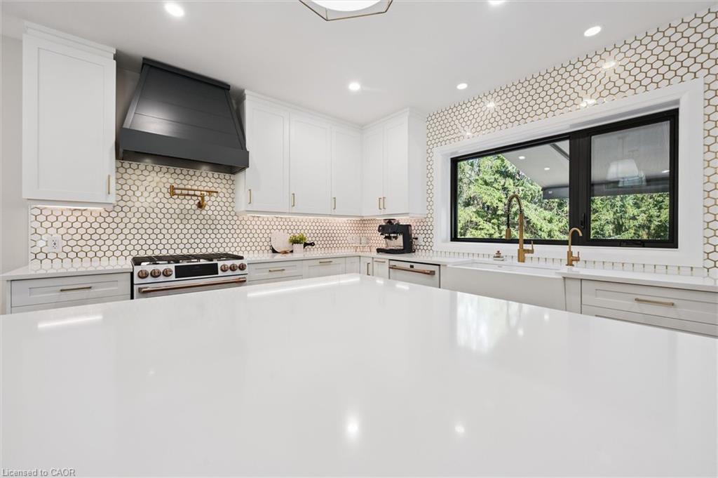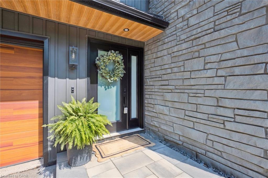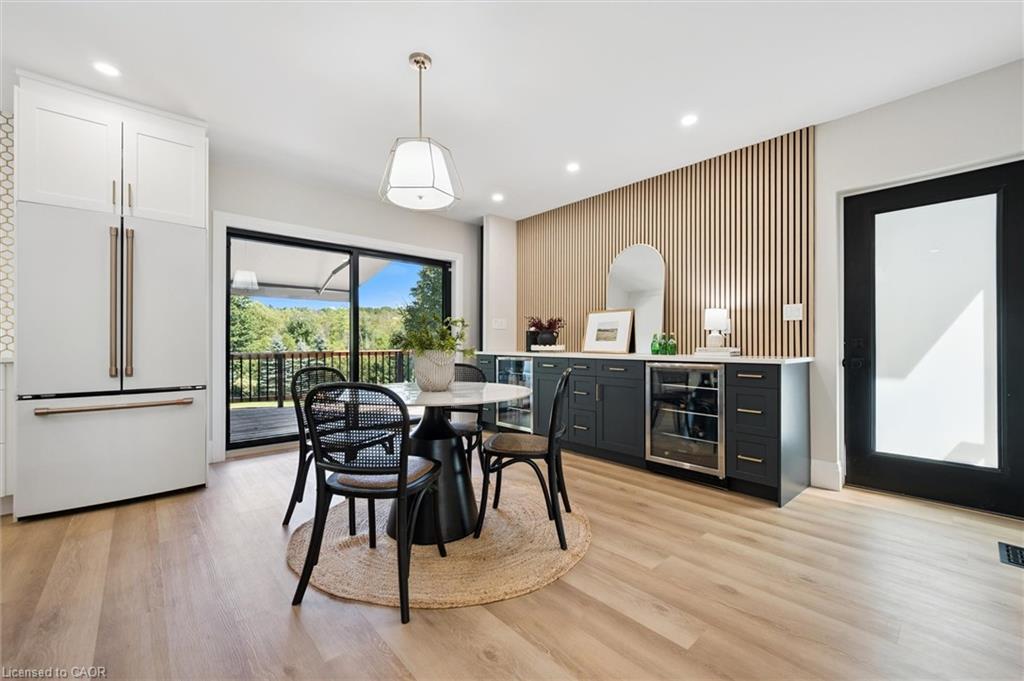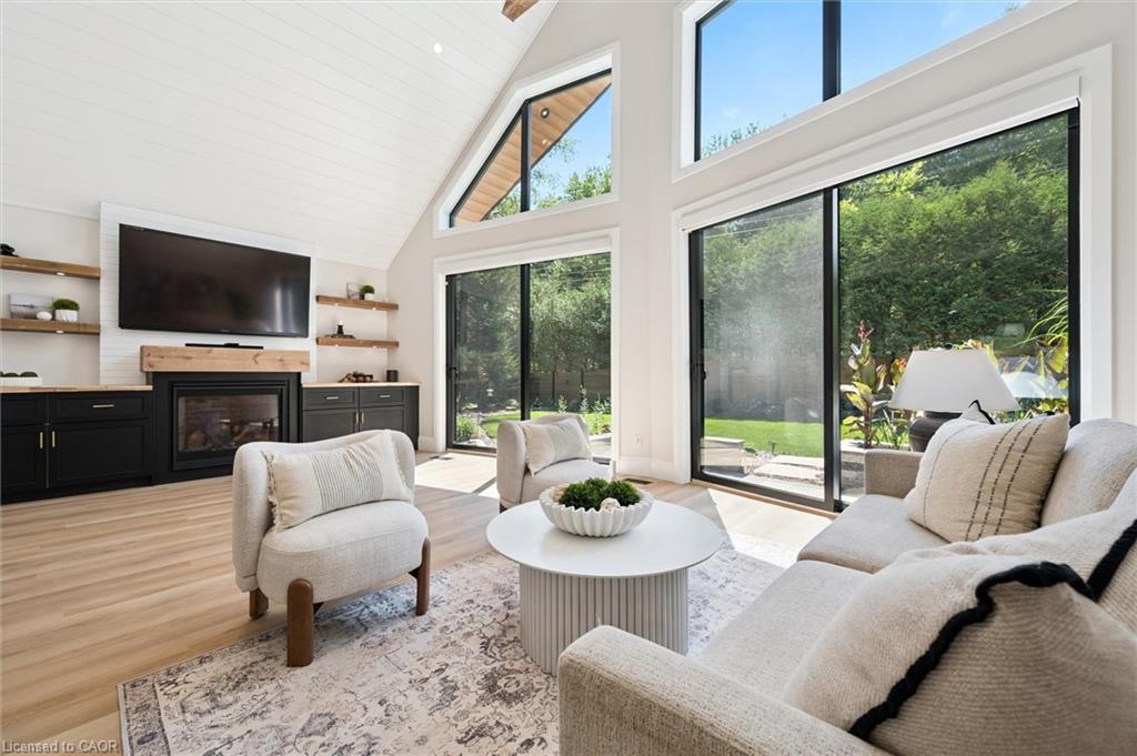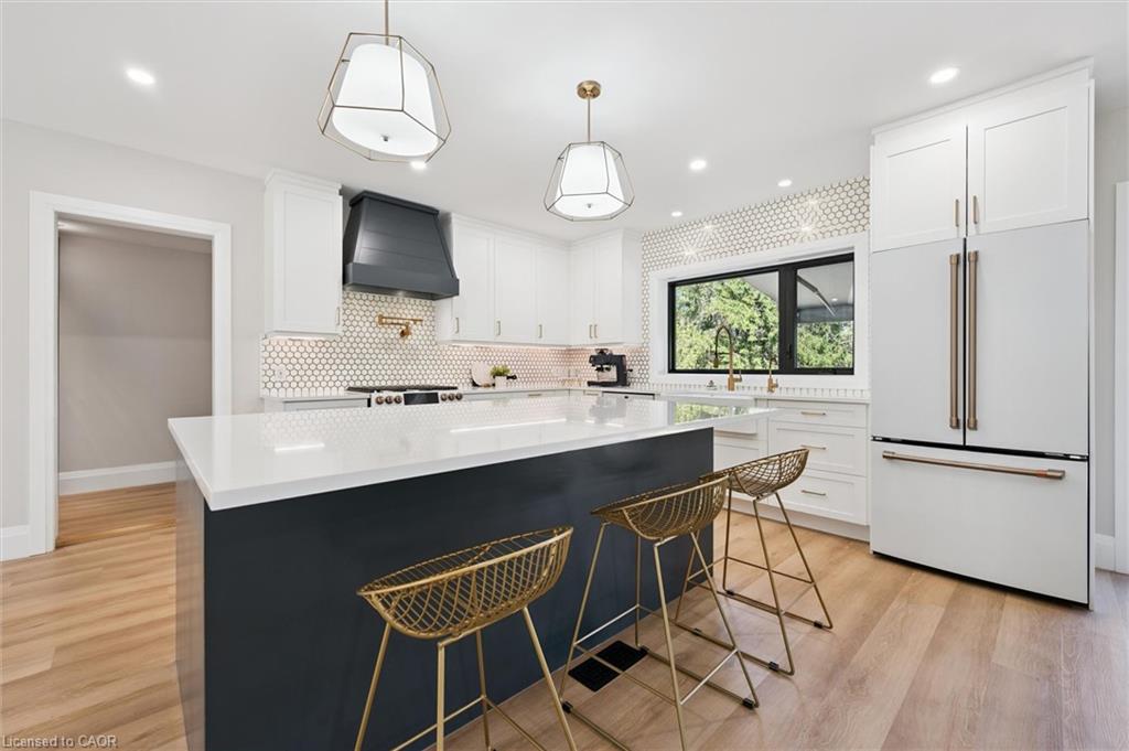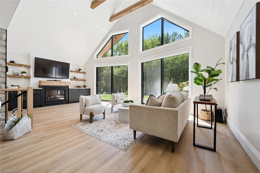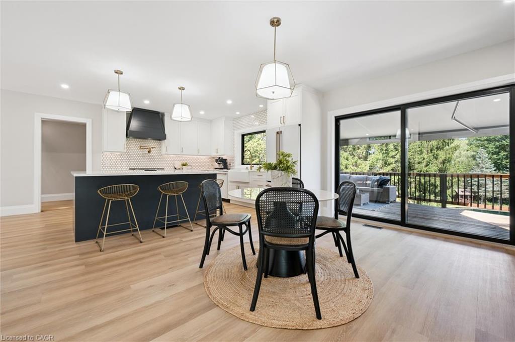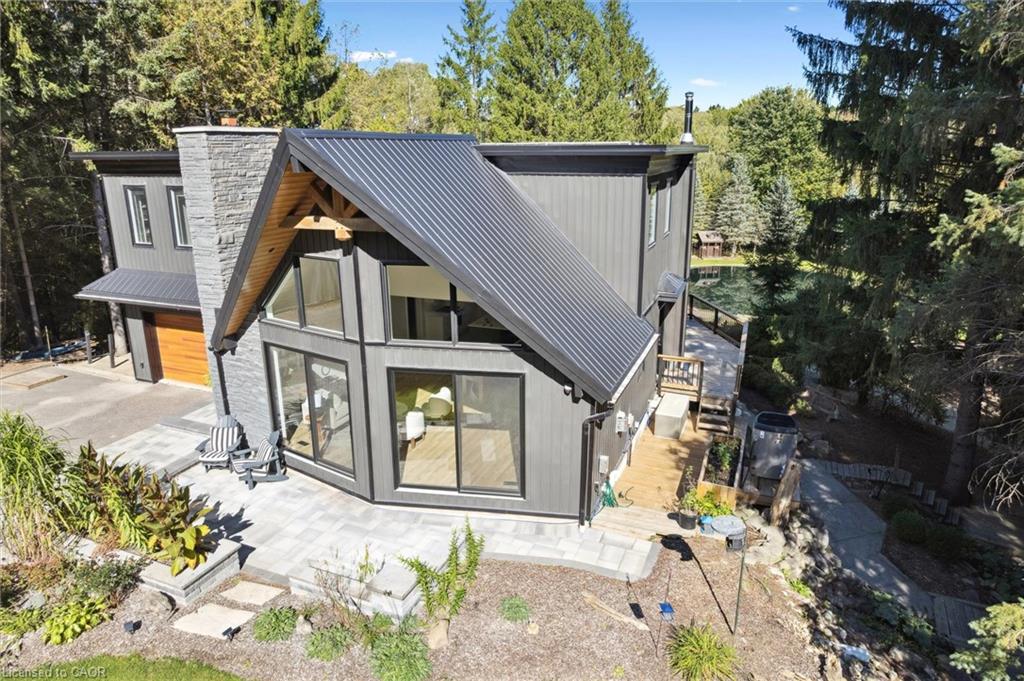 Private Oasis in Waterloo. This one-of-a-kind, fully renovated home offers a cottage-like retreat just minutes from city amenities. Set on 3.7 acres surrounded by trees, a pond, and nature, it combines luxury finishes with smart home technology to create a truly signature property. Inside, the open-concept living room features soaring vaulted ceilings, a propane fireplace, and expansive windows that flood the space with natural light. The chef’s kitchen boasts quartz counters, a spacious island, high-end appliances, pot filler, custom backsplash, and an adjoining pantry with built-in microwave, additional oven, fridge, wine rack, and storage. Perfect for entertaining, the main floor also includes a stylish dining area, built-in bar, walkout to a deck with power awning, and a 4-pc bath. Upstairs, the primary suite is a private sanctuary with breathtaking views, a large walk-in closet, and a spa-like 5-pc ensuite featuring a soaker tub, glass shower, and double sinks. Two additional bedrooms, a 3-pc bath, and convenient upper-level laundry complete this floor. The finished lower level includes heated tile floors, a rec room with cozy wood fireplace and walkout, rough-in for a wet bar, an additional bedroom, office with separate entrance, and a 3-pc bath.The mechanical features include updated electrical & plumbing, Lennox heat pump with backup propane furnace, R/O system and new carbon filter for drilled well, new septic system, solar panels on flat roof generate electricity. Smart home features throughout. Outside, enjoy a private front yard, secondary driveway which allows extra parking, a large patio overlooking the pond with sandy beach and floating dock, plus two charming bunkies—one with a wood stove. All of this within minutes to shopping, schools, markets, and trails. A+++