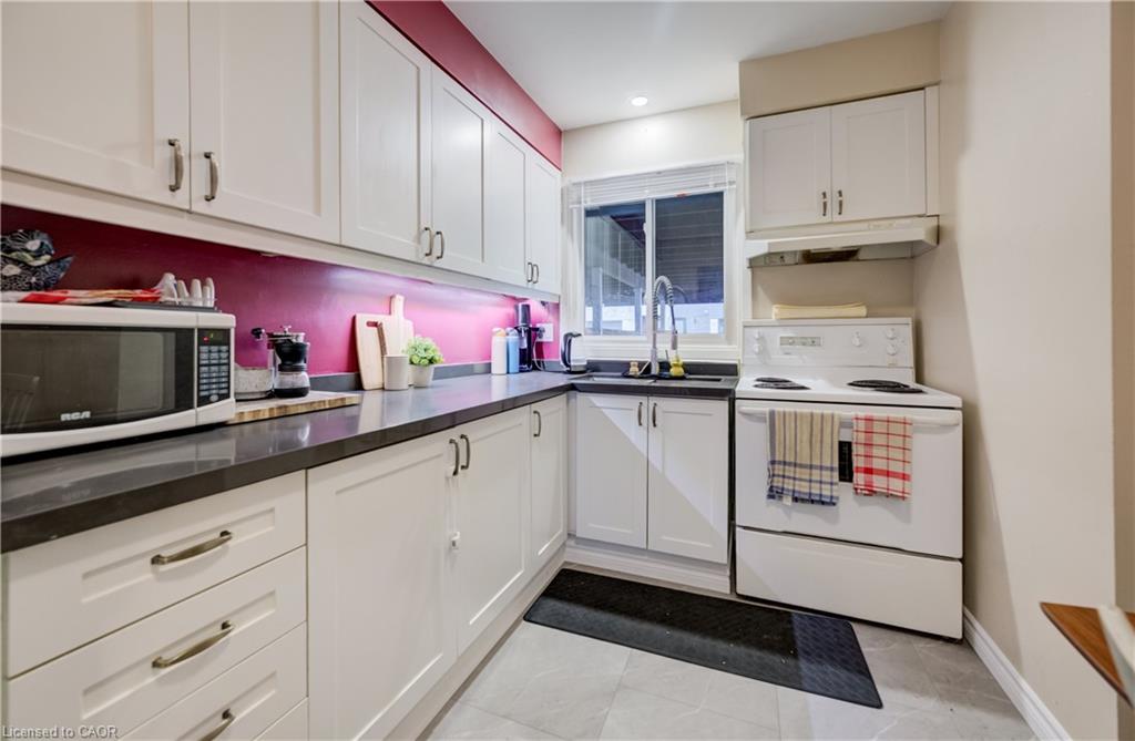 The updated kitchen (2020) features refaced cabinetry, new hardware, sink and faucet, along with brand new flooring (2026). Sliding glass doors in the living room lead to a private patio that backs onto a greenspace — which allows for an open backyard feeling. Upstairs, you’ll find two spacious bedrooms with updated vinyl flooring and a beautifully refreshed 4-piece bathroom professionally completed by Bath Fitters (2023). The partially finished basement provides a versatile living space for a rec room, office, or home gym, plus ample storage.