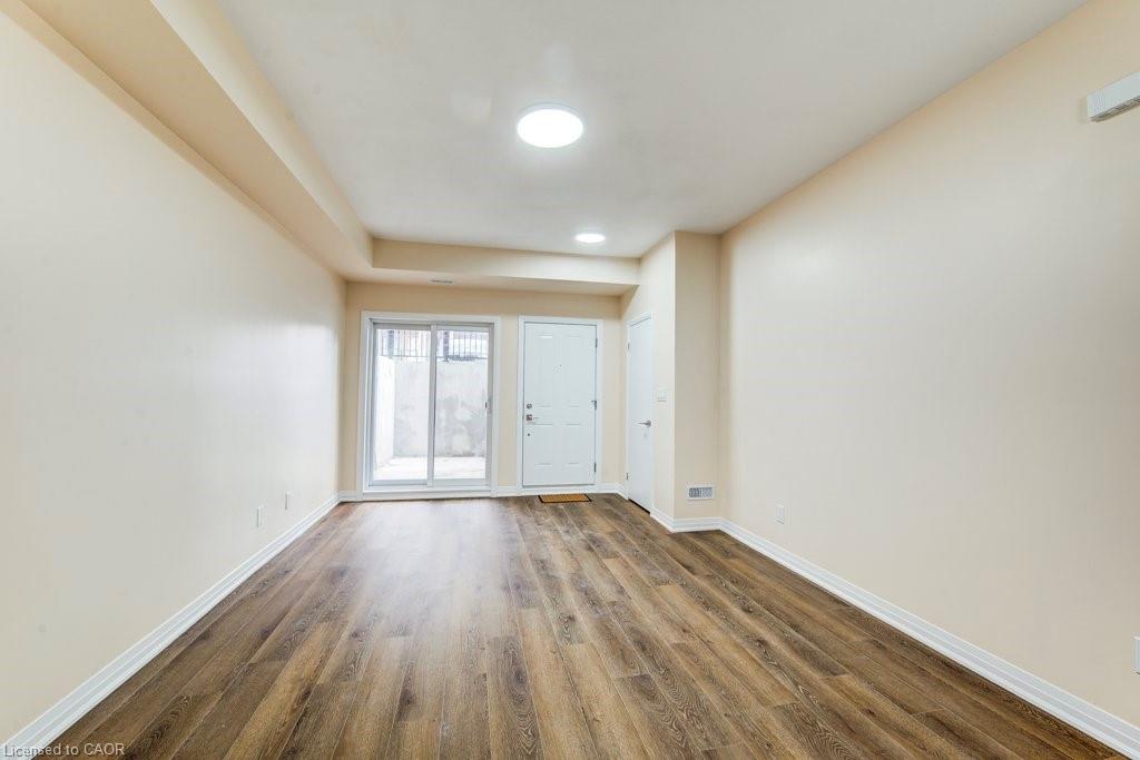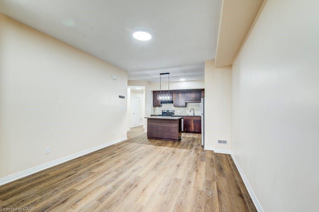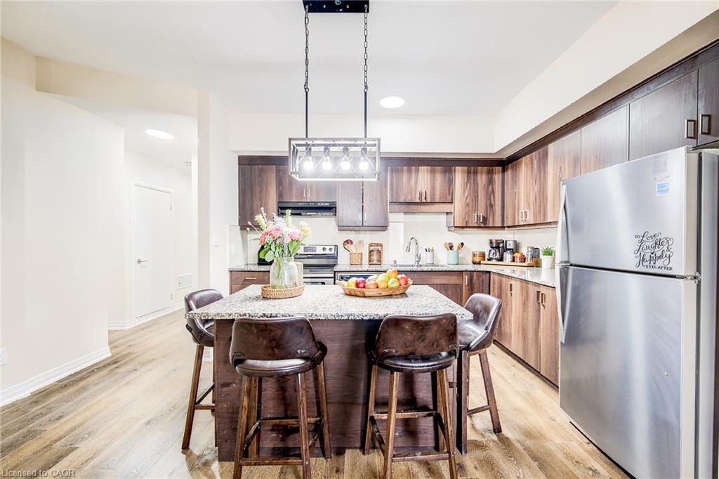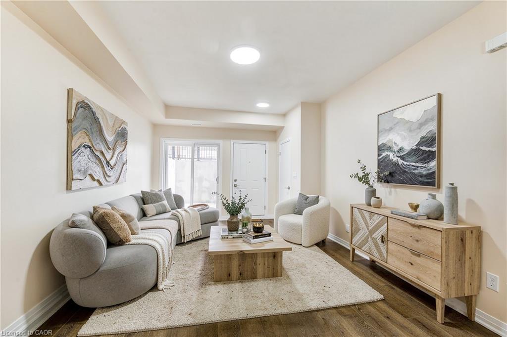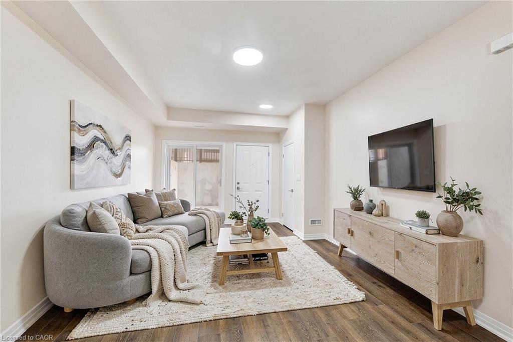 Welcome to this stunning lower-level stacked condo townhouse, featuring 3 spacious bedrooms and 2 full bathrooms. The Primary Bedroom comes with a big walk-in closet and ensuite with standing shower and glass door. The open concept living, dining, and kitchen areas are perfect for modern living, boasting 9-foot high ceilings that create an airy ambiance. Step out to your private patio, ideal for relaxing. This unit backs on to green conservation area. The home is recently renovated with fresh paint, laminate flooring throughout the home (no carpet), new backsplash in the kitchen, new glass door enclosure in the ensuite bathroom, ect, and is Ready to Move In! This beautiful home includes one surface parking spot (# 57) and is situated in a prime location close to all amenities. Enjoy easy access to nature trails, a variety of restaurants, theaters, and entertainment options. Cambridge Centre Mall, the YMCA, and public transit options including GO Transit are just minutes away. With quick access to Highway 401, commuting is a breeze. This home is a good option for first-time home buyers, those looking to downsize, or real estate investors seeking a turnkey investment opportunity. Don't miss out on this perfect blend of convenience, comfort, and modern living!