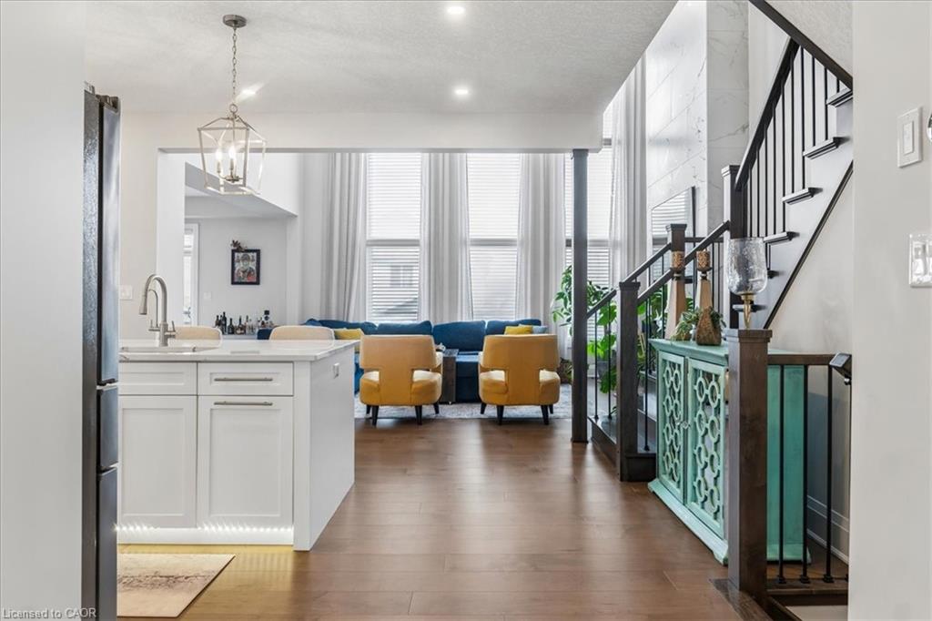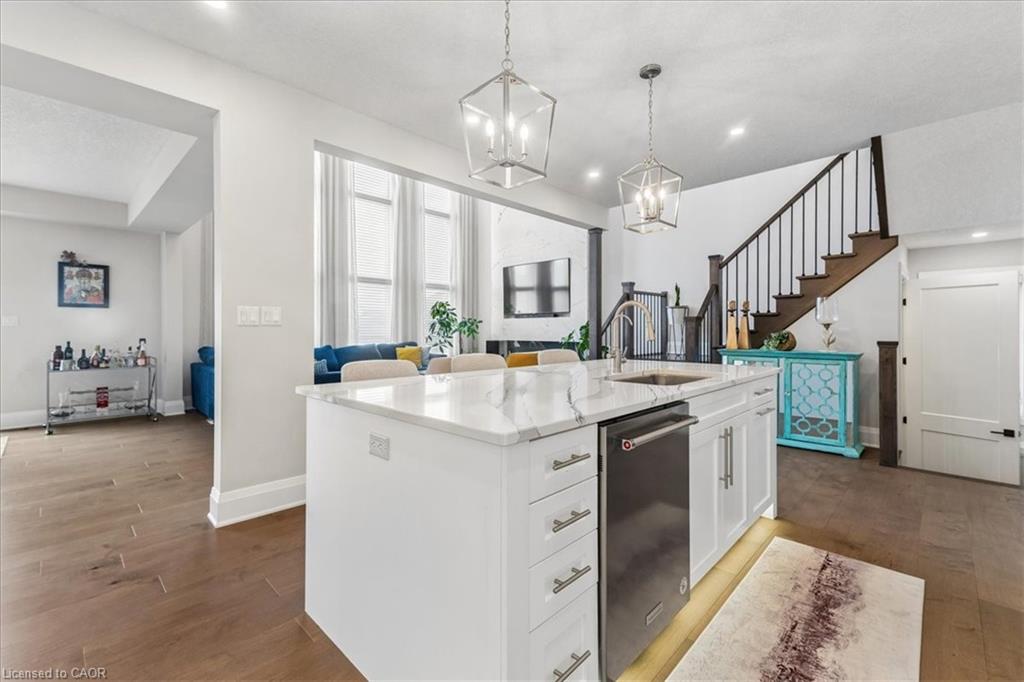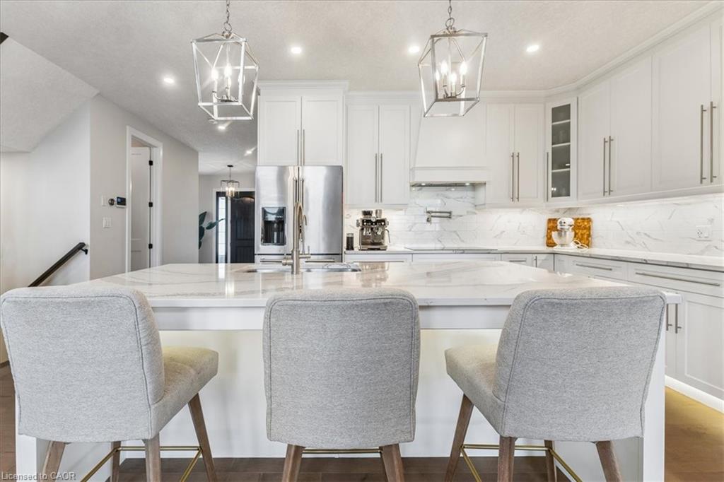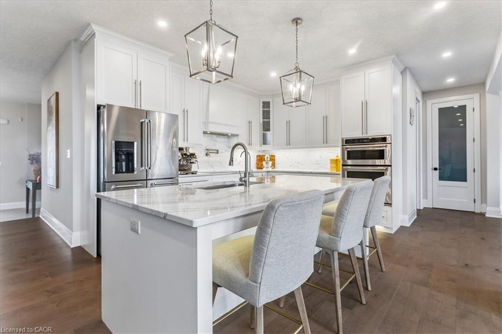 Welcome to an exceptional executive home in the highly sought-after Riverwood community of Kitchener. Offering over 3,500 sq ft of elegant living space plus a fully finished walk-out basement (additional 1100+ sq ft) with in-law suite potential, this 5-bedroom, 5.5-bathroom designer home showcases luxurious, high-end finishes throughout and is fully finished and move-in ready. Step inside to a grand foyer leading to a bright open-concept main floor, perfect for both everyday living and upscale entertaining. The chef-inspired kitchen is a true showpiece, featuring premium stainless steel appliances, Cambria stone countertops, a large centre island, under-cabinet lighting, and abundant custom cabinetry. The dining area is filled with natural light and offers direct access to an extra-large deck—perfect for refined outdoor dining and hosting. The impressive living room showcases over 17-ft ceilings, dramatic floor-to-ceiling windows, rich engineered hardwood flooring, and seamless access to the XL deck from both the living and dining areas, creating a stunning indoor-outdoor flow. Upstairs, the spacious primary suite offers a walk-in closet and a spa-inspired 5-piece ensuite with a double quartz vanity, deep soaker tub, and an oversized glass-tiled shower. Four additional generously sized bedrooms feature ensuite or semi-ensuite access, providing comfort and privacy for family and guests, along with a convenient upper-level laundry room. The fully finished walk-out basement adds exceptional versatility with in-law suite potential—ideal for multi-generational living or extended entertaining space. Enjoy the expansive deck, perfect for relaxing in style or hosting gatherings. Located near top-rated schools, parks, Chicopee Ski Club, the Grand River, and major highways including 7/8 and the 401. A rare opportunity to own a luxurious, fully finished executive home with premium upgrades in a prime location. Book your private showing today.