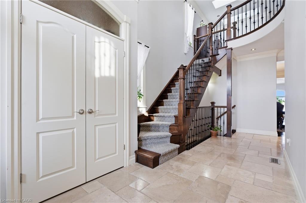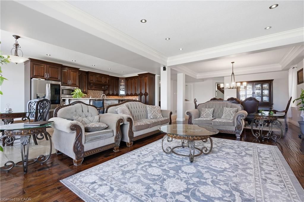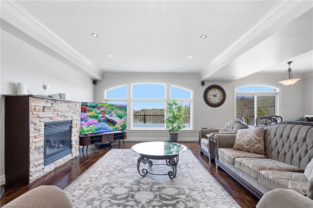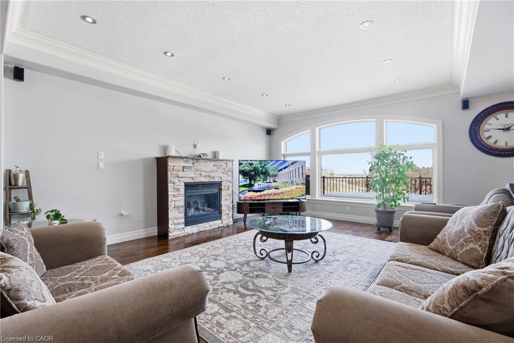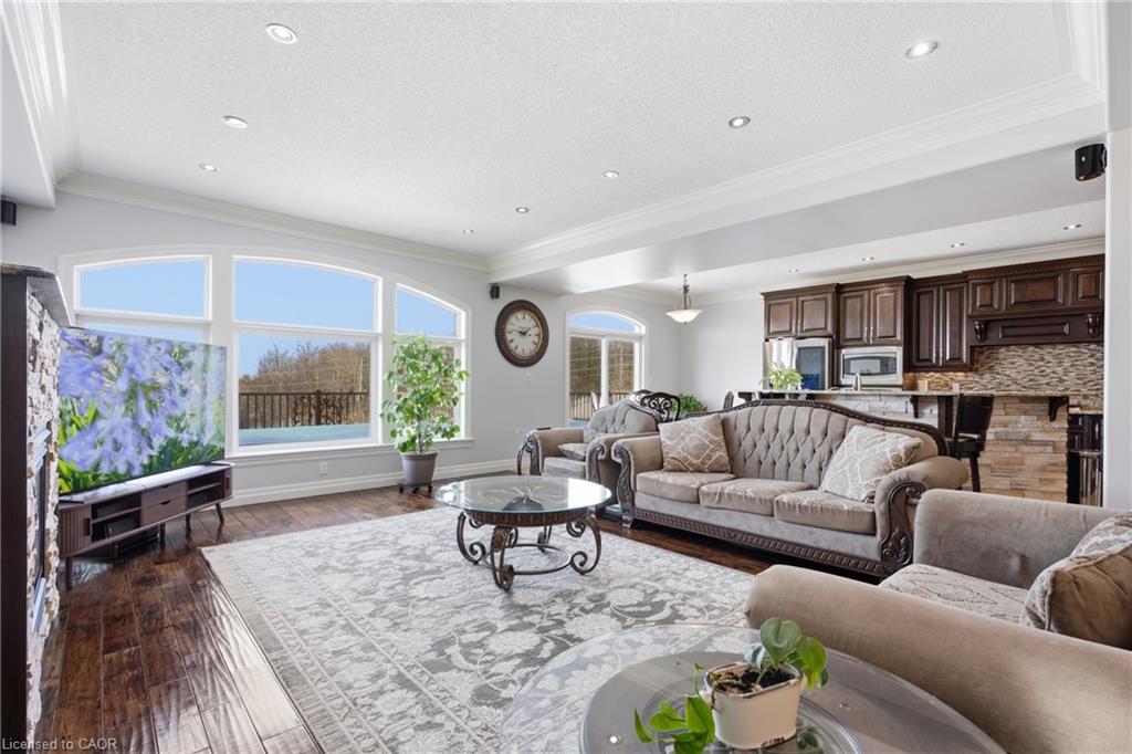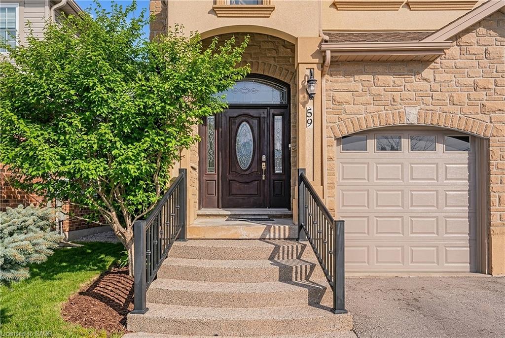 Welcome to 59 Newcastle Drive, Kitchener, a beautifully maintained ravine-backed home offering over 2,900 sq. ft. above grade plus a finished walkout basement. Backing onto peaceful greenspace with no rear neighbours, this property offers a rare blend of privacy, space, and natural surroundings. Exceptional curb appeal, mature landscaping, and parking for 5 vehicles (2 car garage and 3-car driveway) create a strong first impression. Inside, the main level features 9-foot ceilings, hardwood flooring, and extensive pot lighting throughout. The living room is highlighted by a gas fireplace and a striking wall of windows overlooking the ravine. The kitchen is well-appointed with granite countertops, built-in stainless steel appliances, a gas stove, and a large island, flowing seamlessly into the dining and breakfast areas. A main-floor laundry room with garage access and a powder room complete this level. Upstairs, a spacious family room offers flexible use and can easily convert to a fourth bedroom, while a separate den provides ideal office space. Three generously sized bedrooms include a primary suite with walk-in closet, private balcony, and ensuite featuring a jacuzzi tub and separate shower. A 4-piece bathroom serves the additional bedrooms. The fully finished walkout basement with 9-foot ceilings and heated floors expands the living space with a large recreation area, wet bar, and spa-like bathroom with private sauna. Step outside to an elevated deck with sweeping ravine views and a covered patio below, offering a peaceful, private outdoor setting. Additional highlights include integrated in-ceiling speakers, security camera pre-wiring, updated kitchen appliances, new AC (2025), and new garage doors. Ideally located near top-rated schools, parks, trails, shopping, transit and major highways. A rare ravine property at this price is hard to find. Book your private showing today and make this your Forever Home!