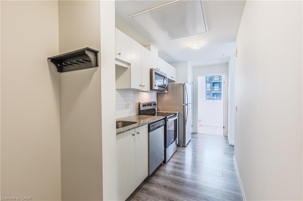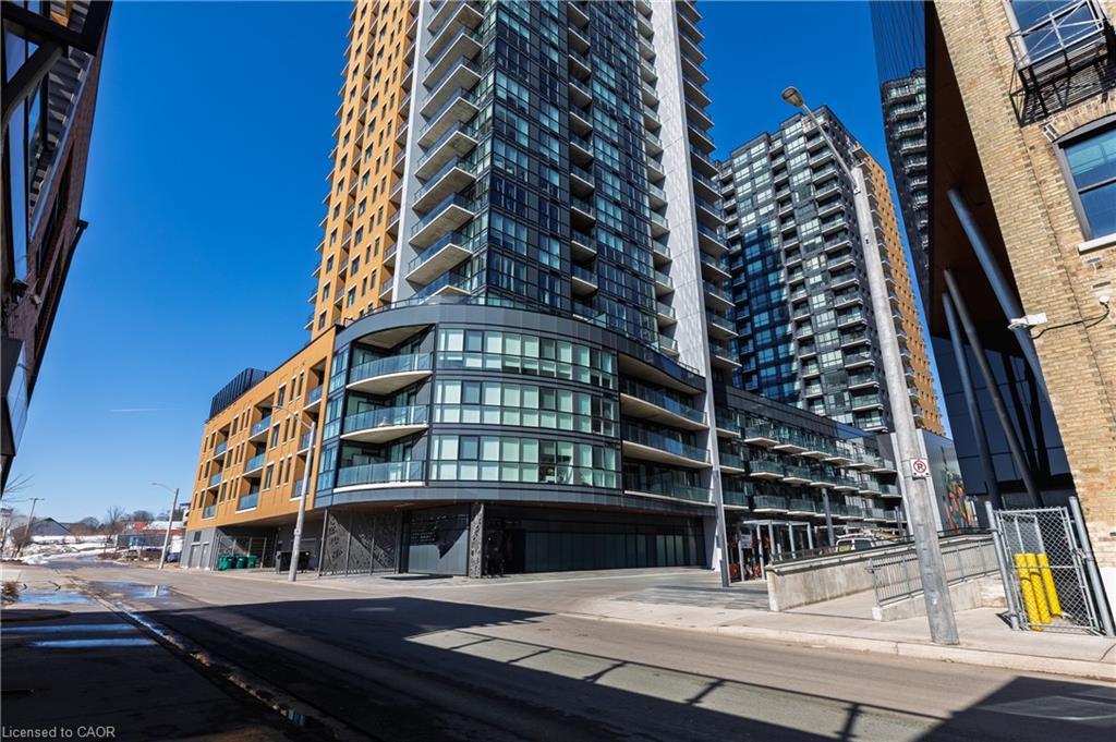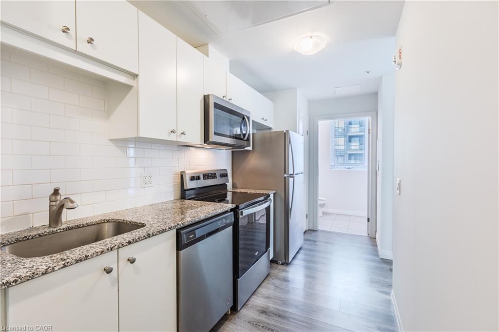 Welcome to Garment Street, Kitchener’s vibrant Innovation District! This modern bachelor/studio-style condo offers a thoughtfully designed open-concept layout. The bright living area is filled with natural light from large windows and features engineered flooring throughout, creating a clean and contemporary feel. The kitchen is beautifully finished with modern cabinetry, granite countertops, backsplash, and stainless steel appliances. The in-suite washer and dryer add everyday convenience. Residents of this sought-after building enjoy exceptional amenities including an outdoor swimming pool, half-court basketball court, landscaped terrace with BBQ area, party room with private patio, outdoor dog run with pet washing stations, fitness room, and a yoga/wellness studio. Located steps from the ION Light Rail Transit, GO Station, and bus routes. This unbeatable location is within walking distance to Tech Hubs including Google. You’ll also be just minutes from Downtown Kitchener, Victoria Park, restaurants, shopping, and more. Don’t miss this fantastic opportunity.