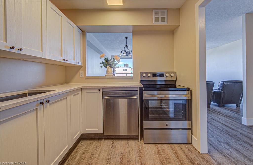 BRIGHT & QUIET TOP-FLOOR UNIT IN PRIME STANLEY PARK LOCATION! Welcome to Suite 610 at 18 Holborn Court, a spacious 2-bedroom, 2-bathroom condo in one of Kitchener’s most established neighbourhoods. Situated on the 6th (top), this home is exceptionally quiet, filled with natural light, and truly move-in ready. Step inside to a welcoming open-concept layout featuring a generous living and dining area. Large windows showcase expansive views while allowing sunlight to pour in throughout the day. The functional kitchen offers ample cabinetry and counter space, with easy flow into the main living area. The primary bedroom is spacious and includes a private 3-piece ensuite and walk-in closet, creating a comfortable retreat at the end of the day. The second bedroom is ideal for guests, a home office, or additional family members, conveniently located near the second full bathroom. The in-suite laundry room has ample storage space. This well-managed building offers fantastic amenities, including an elevator, fitness room, sauna, and visitor parking. Located on a quiet cul-de-sac, you’ll enjoy peaceful surroundings while remaining incredibly close to everything. Just one block away, Stanley Park Mall provides unmatched convenience with Canadian Tire, Zehrs, LCBO, TD Canada Trust, restaurants, and essential services. Public transit is steps from your door, and quick access to Highway 7/8 makes commuting simple. Parks, schools, and trails are also nearby, making this an ideal location for a wide range of lifestyles.