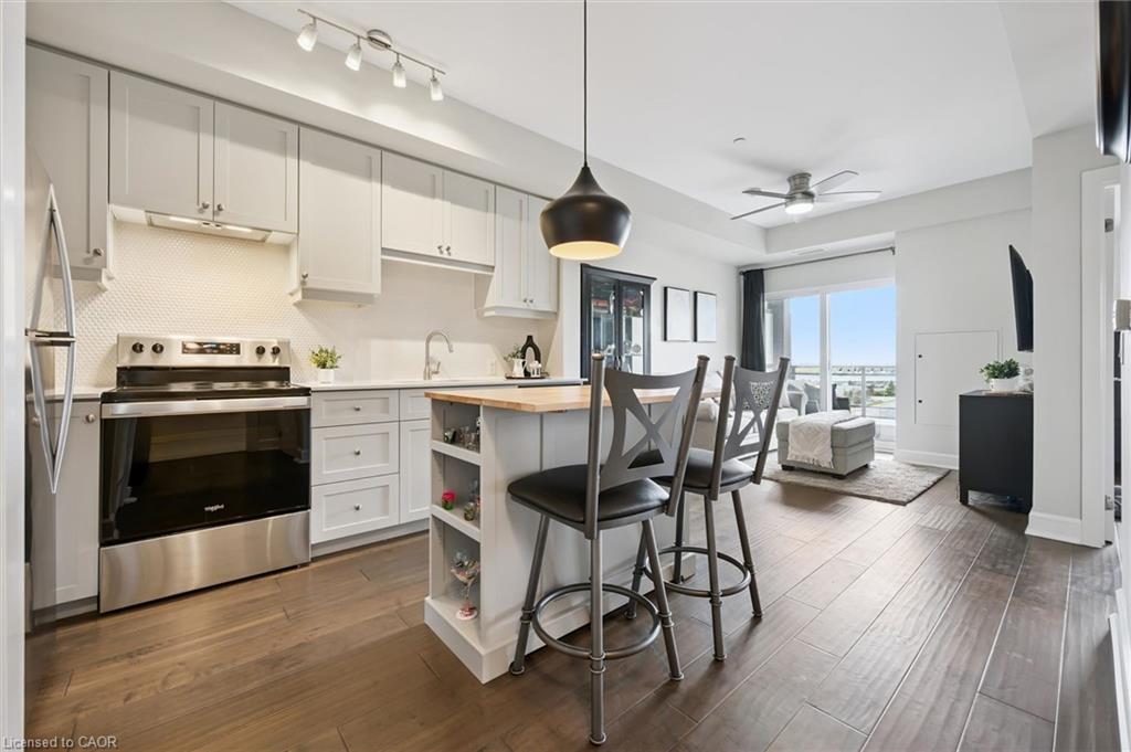 Welcome to the top floor! You'll fall in love with this sleek and luxurious owner-occupied 1 bedroom, 1 bathroom unit, boasting a ton of upgrades and an unobstructed panoramic view from the top floor! Open concept and cozy eat in kitchen and living room create your own perfect oasis. The primary bedroom features a walk-in with custom built-in wardrobe AND a large picture window with the same amazing view. Spacious 4pc bath with glass shower, modern tile, and stylish matte black fixtures. Upgraded finishes include engineered hardwood, luxury millwork, shaker cabinets, quartz countertops, penny tile backsplash, high end lighting, and much more. Building 255 is far superior to the other Blackstone buildings as it offers free wifi and air conditioning/heating controls from WITHIN the unit. Tenancy includes 1 parking spot conveniently located close to the front door and impressive amenities such as a beautiful party room , a private gym, a co-working space, social second floor terrace, a pet washing station, and secure bike storage. Located close to expressway, LRT, transit, and Conestoga Mall. Book a private showing before it’s gone!