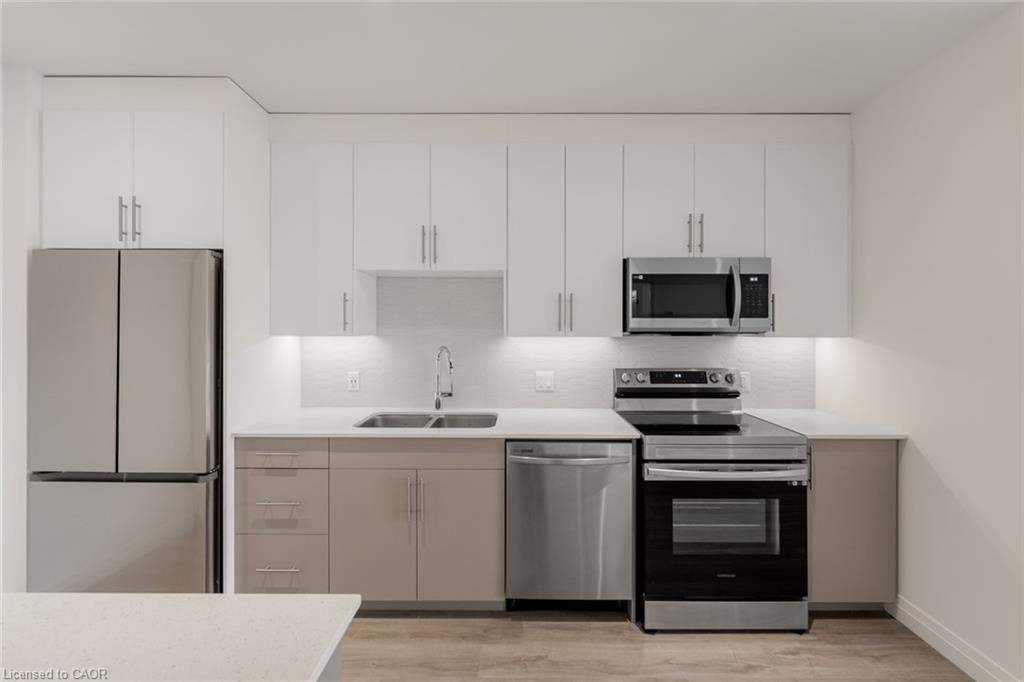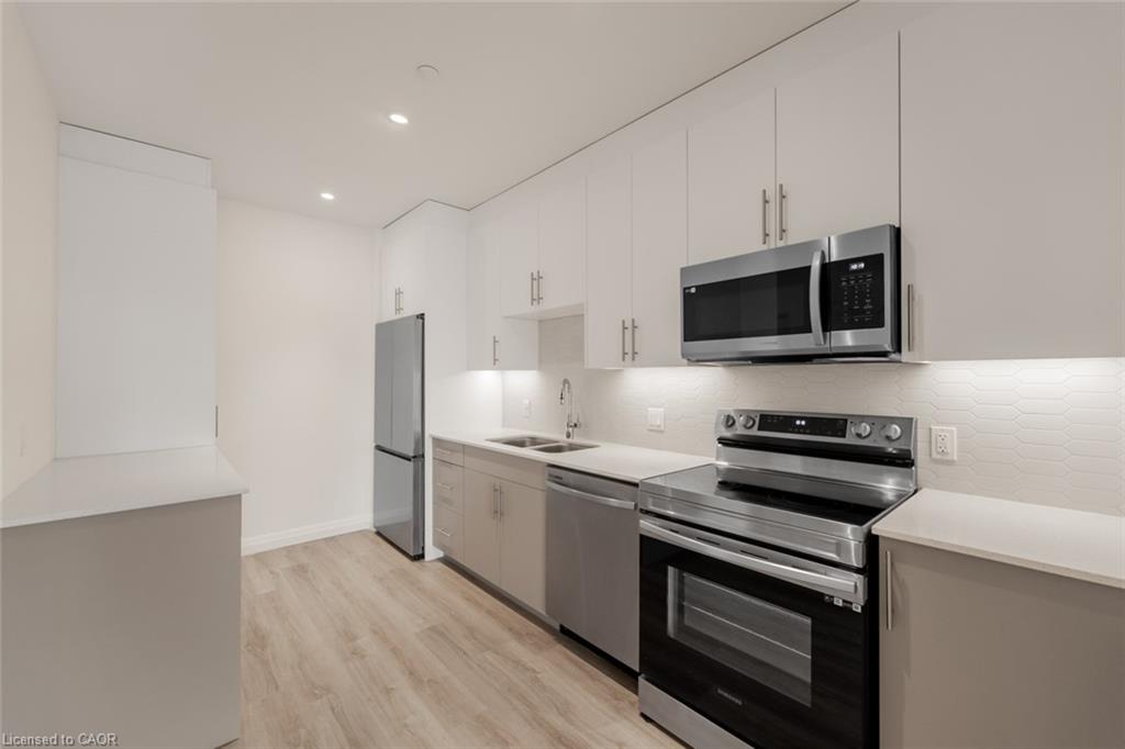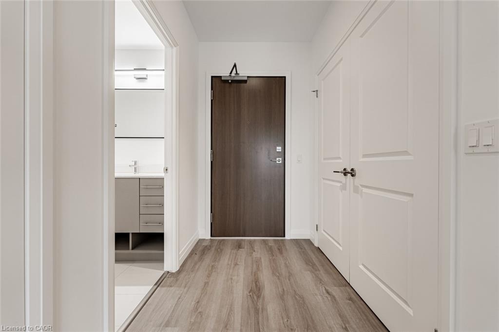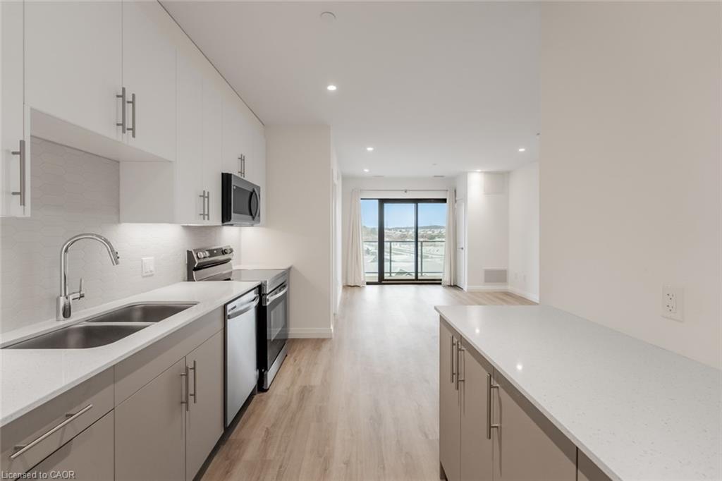 Forget The Shovels! Welcome To The Flats At Rainbow Lake - One Of Kitchener's Best Kept Secrets. Set Within A Private Lakeside Conservation Enclave, This Stunning 2-Bedroom, 2-Bathroom Suite Offers 912 Sq Ft (+92 Sq Ft Balcony) Of Carpet-Free Living Plus 1 Parking Space. The Bright White Kitchen Features Quartz Countertops, Stainless Steel Appliances, Sleek Backsplash, And Valance Lighting, Blending Modern Elegance With Everyday Functionality. The Scandinavian-Inspired Finishes Extend From The Unit And Throughout The Building, Which Is Situated On 4.4 Acres Of Lakeside Property And Surrounded By Over 45 Acres Of Protected Conservation Land, Including One Of The Oldest Growth Forests In Southwestern Ontario. Enjoy Swimming, Fishing, Canoeing, Scenic Trails, And Tranquil Lake Views Right Outside Your Door. Amenities Include A Co-Working Space, Library, Games And Party Room, Outdoor Dining And BBQ Areas, Gym With Sauna, Bike Storage, Dog Wash Station, And EV Chargers. Ideally Located With Immediate Access To Highway 401 And Just Moments From Transit, Shopping, Dining, And Schools. A Fantastic Opportunity To Live Where Nature Meets Modern Living.