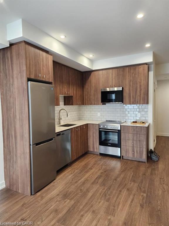 Amazing 1 Bedroom plus Den on 6th Floor at Station Park's Union Tower-1. Enjoy beautiful views of Uptown Waterloo and Kitchener downtown. Spacious den offers a space that could be used for work/study/play. Upgrades: gourmet kitchen with soft close drawers, zebra blinds and pot lights. Includes: storage locker, mobile-enabled features garage parking space, smart-suite entry, high efficiency front-loading stacked washer/dryer, wifi-enabled hotspots throughout all common areas, fast-charge ev parking, secure parcel room enabled with electronic delivery system, 9 feet ceilings, light vinyl wide plank flooring throughout and kitchen includes built-in stainless-steel appliances, quartz countertops and contemporary tile backsplash. Walking distance to Google building, Go Train Station, Grand River hospital, coffee shops, restaurants and retail stores. Steps away from Lrt stop (Central Station), GRT bus stops 1893/1896 (route#6/7/8), and future multi-modal transit hub. 15 minutes commute to both Universities and walking distance to McMaster's School of Medicine and School of Pharmacy. Phase-1 amenities will include Fitness area, Peloton studio, Indoor lounge area/bar/seating, Bookable private dining area equipped with kitchen/dining table/lounge seating, Outdoor natural gas Bbq’s with bookable private dining areas, Private hydropool swim spa/hot tub, Dual-Bowling lanes with semi-private banquette seating and a Concierge desk support for resident support. Lots of outdoor amenities such as outdoor skating rink, ground floor retail stores, restaurants and grocery store are planned in the future. Phase-2 amenities will include game areas, yoga studios, music jam areas, co-working room, outdoor bookable private cabanas, kids play area and running tracks. Available immediately. Station Parks is one of the futuristic developments located in K-W area, grab the opportunity to live/work/play here, be where the heart of the city is!