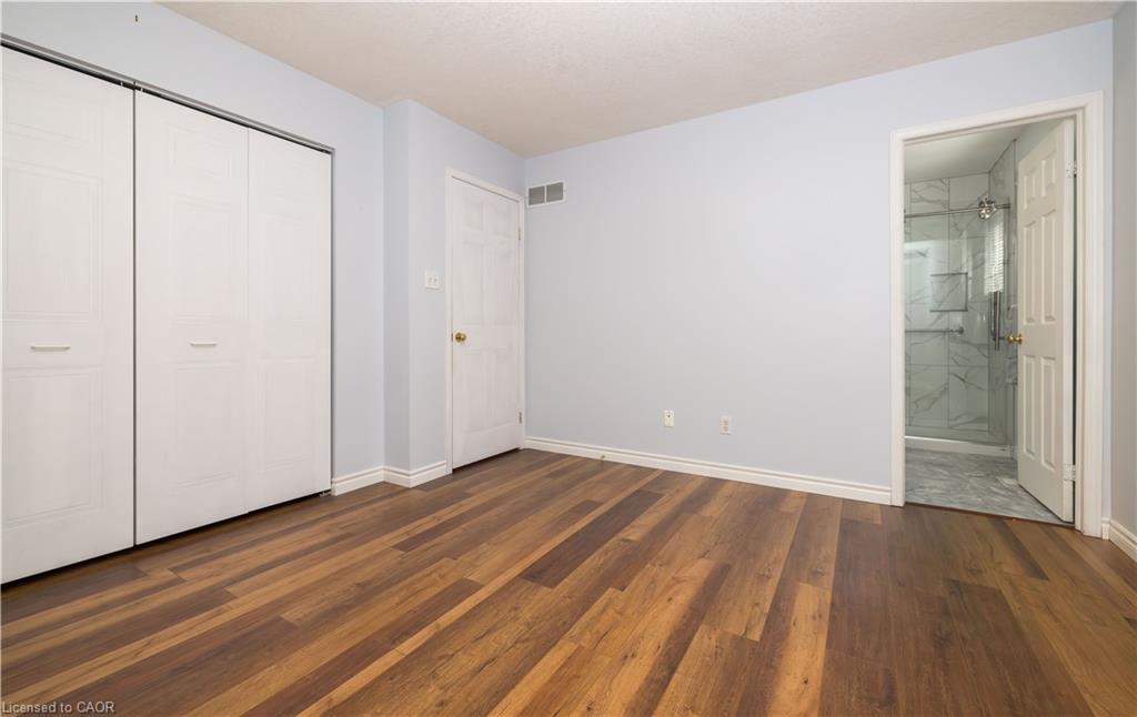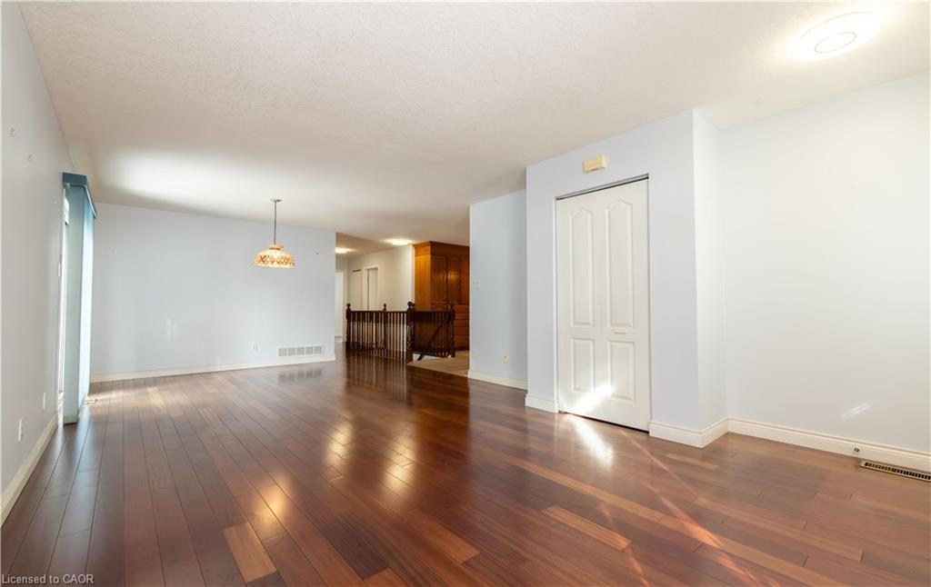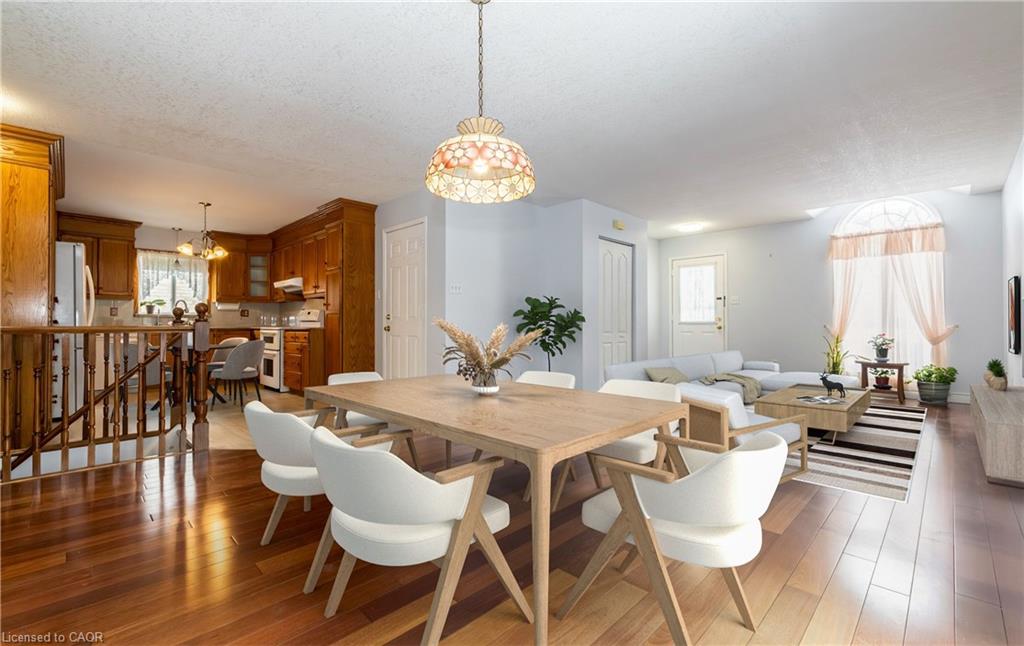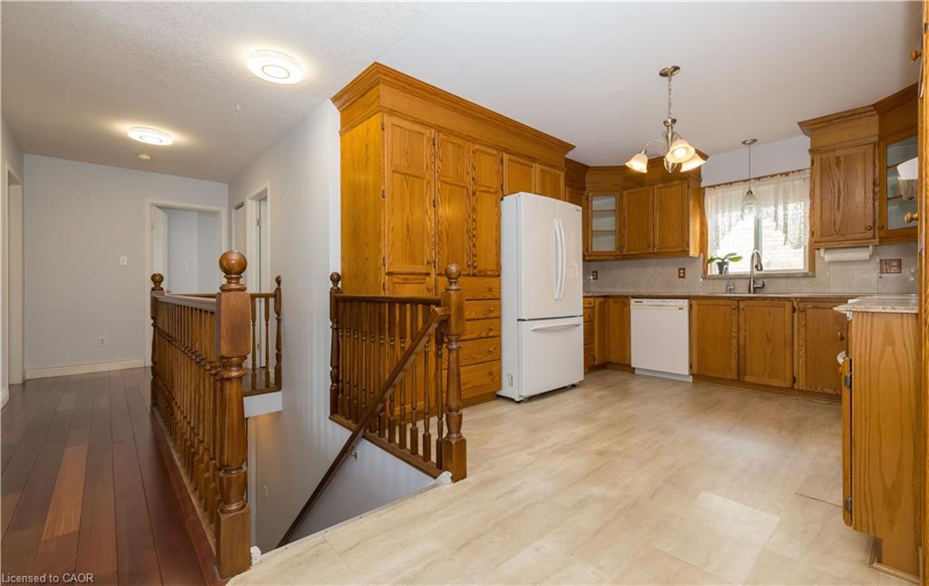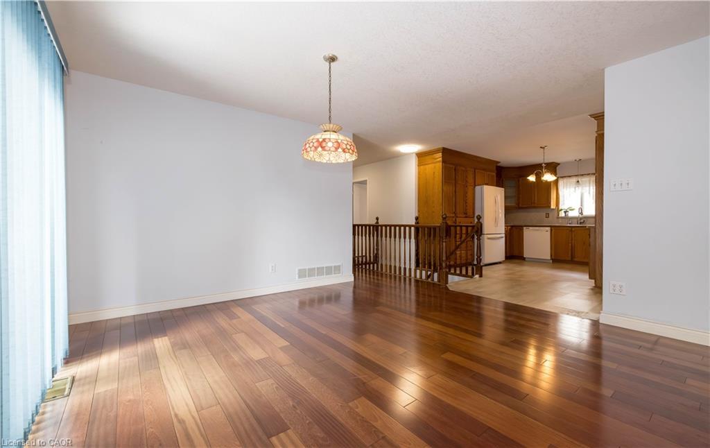 Tucked into a quiet Cambridge neighbourhood, this well-kept raised bungalow offers space, comfort, and a layout designed for everyday living. The main level welcomes you with a bright, open living and dining area finished with hardwood floors and a walkout to the deck, creating an easy flow for family gatherings or relaxed evenings at home. The primary bedroom provides a peaceful retreat with hardwood flooring and an updated 4-piece ensuite, while two additional bedrooms and a second full bathroom complete the main floor. The eat-in kitchen features classic oak cabinetry and a comfortable setting for morning coffee or casual meals. Downstairs, the partially finished lower level adds flexibility with a rec room and a fourth bedroom or den, ideal for guests, a home office, or a growing family. Set on a generous 59.05 x 98.42 ft lot with a concrete double driveway, the home also offers practical updates including a heat pump installed in 2022, a 200-amp electrical system, a 2014 roof, and an owned water softener. A solid home with space to settle in and make your own.