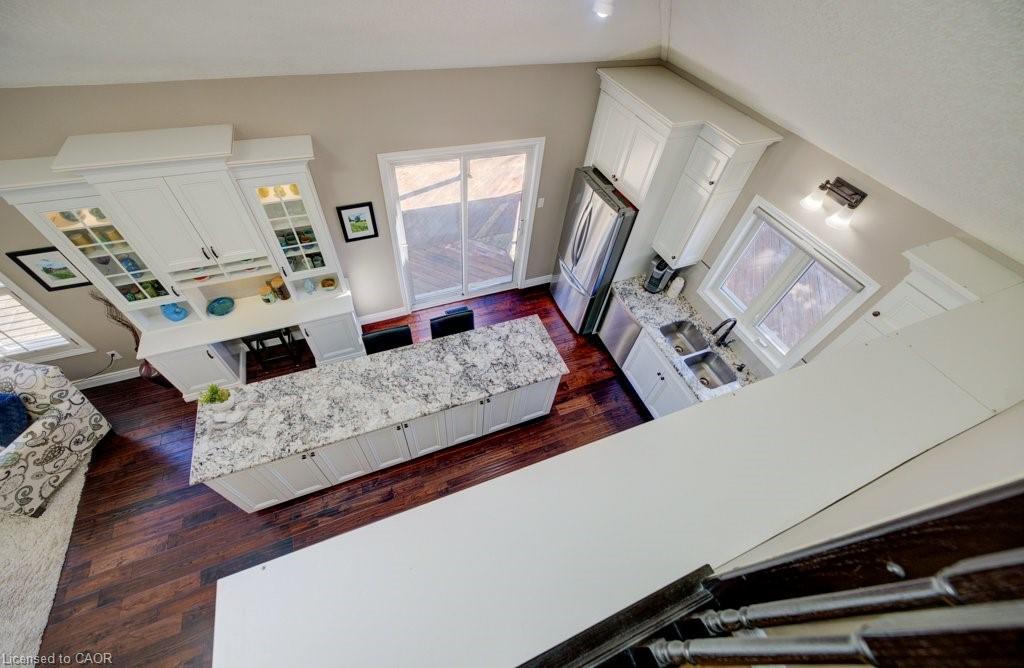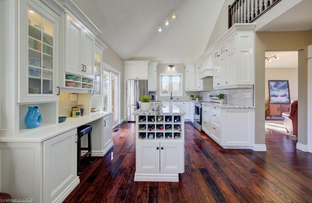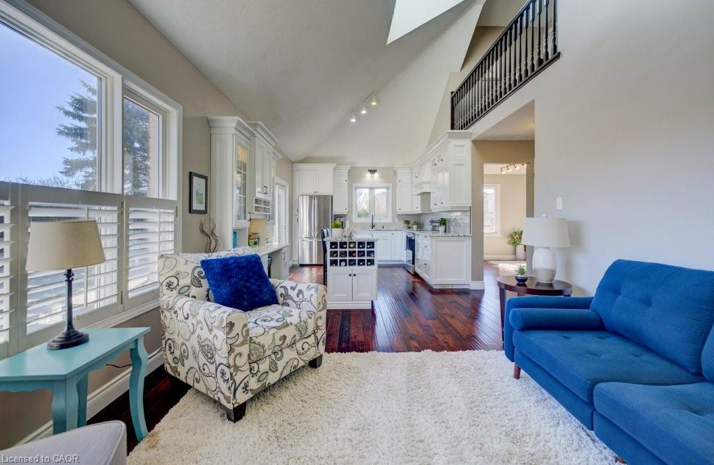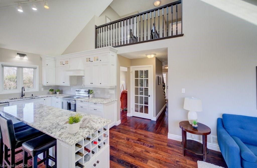The main floor showcases a bright, open-concept layout with a stylish kitchen complete with custom white cabinetry, granite countertops, and a large island—seamlessly flowing into the living space beneath a vaulted ceiling filled with natural light. Also on the main floor is a large formal living room a laundry room and a 2-piece bathroom.