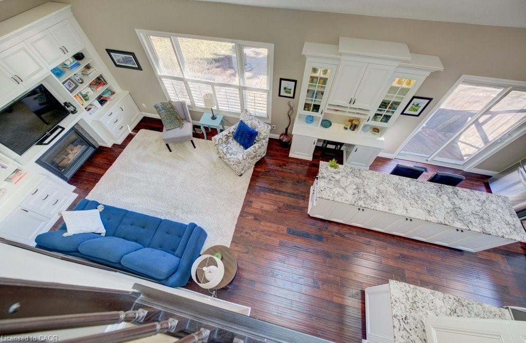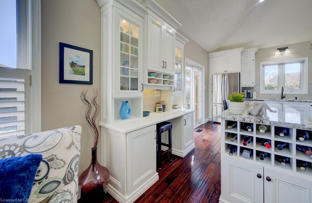 The fully finished basement is designed for both function and fun, featuring a pub-style wet bar with multiple refrigerators, a dedicated office, spacious rec room with a gas fire place, and a convenient 2-piece bath—ideal for entertaining or working from home.