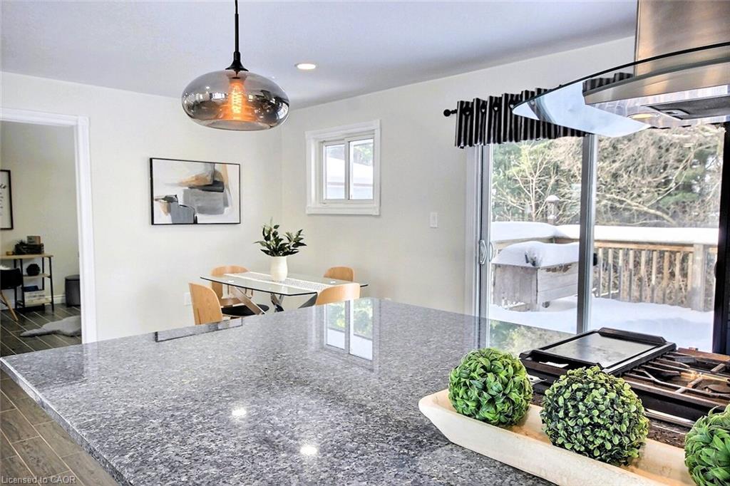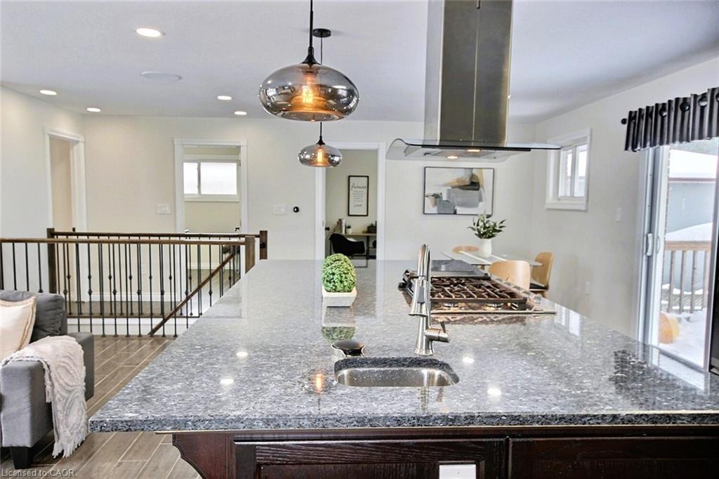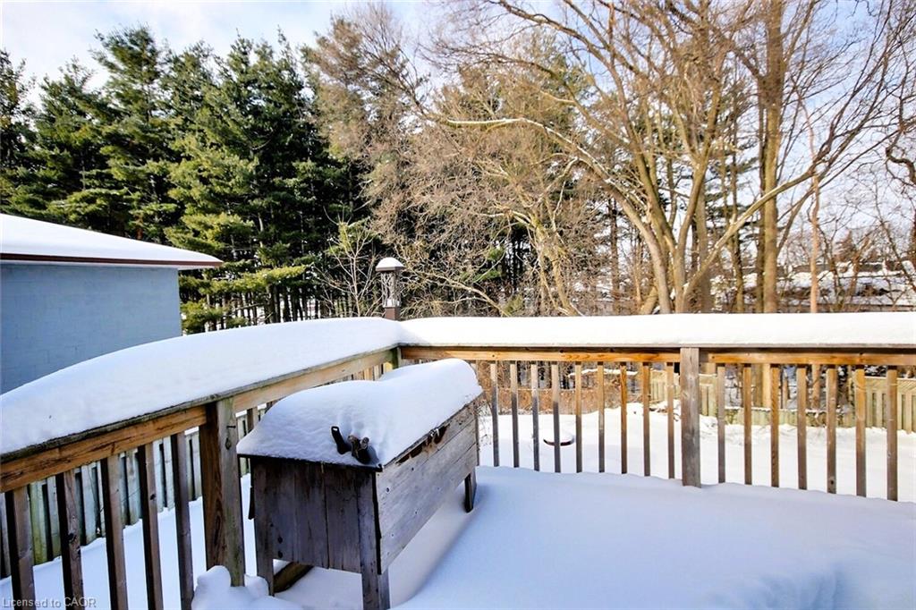 The main level showcases a bright open-concept area perfect for family, friends gatherings. The kitchen boasts richly toned silent-close cupboards, wall oven, 10x5 granite island/bar, ideal for casual dining and socializing which overlooks the impressive family room with a large picture window, easy clean wood grain flooring, built-in surround sound speakers. Slider doors that lead to a deck that overlooks the rear yard backing onto mature trees, perfect for outdoor gatherings and baroques. Enjoy! Also on the main level is generous main washroom with laundry facilities eliminating the need to venture downstairs. The lower level has been stripped clean, painted and ready for your customization, featuring an intact 3-piece washroom and plumbing for a kitchenette/bar area, allowing you to create additional rooms or maintain an open-concept feel. This home offers both comfort and versatility for modern living. Truly delightful.