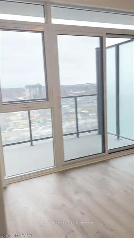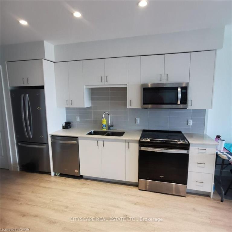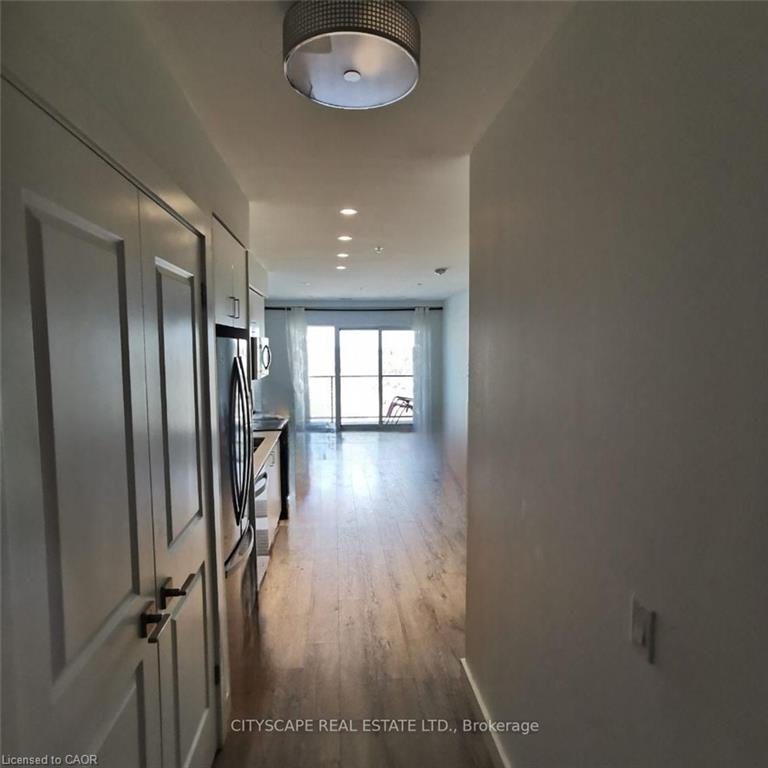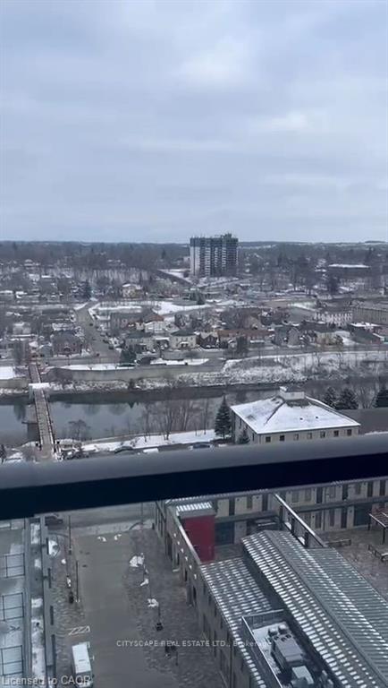 Welcome to the Gaslight District in historic downtown Galt - one of Cambridge's most sought-after communities, known for its vibrant atmosphere, dining, entertainment, and year-round events. This spacious 1-bedroom suite offers 804 sq. ft. of total living space (676 sq. ft. interior + 128 sq. ft. balcony) with 9' ceilings, a bright open-concept layout, and floor-to-ceiling windows showcasing beautiful views of the Grand River and downtown Galt.Enjoy two private balconies, accessible from both the living room and bedroom - the perfect place to unwind and take in the views. The modern kitchen features quartz countertops, quality cabinetry, a ceramic tile backsplash, an undermount sink, and stainless steel appliances, seamlessly connecting to the open living space. Additional highlights include in-suite laundry, a walk-in closet, and 1 underground parking space. Residents enjoy access to an impressive collection of amenities, including a fully equipped fitness centre, yoga studio, games room, resident lounge/party space, private meeting/work rooms, and a spacious outdoor terrace with pergolas, fire pits, BBQs, and lounge seating overlooking Gaslight Square. Steps to restaurants, cafes, entertainment, boutique shops, public transit, and scenic river trails. Some photos virtually staged.