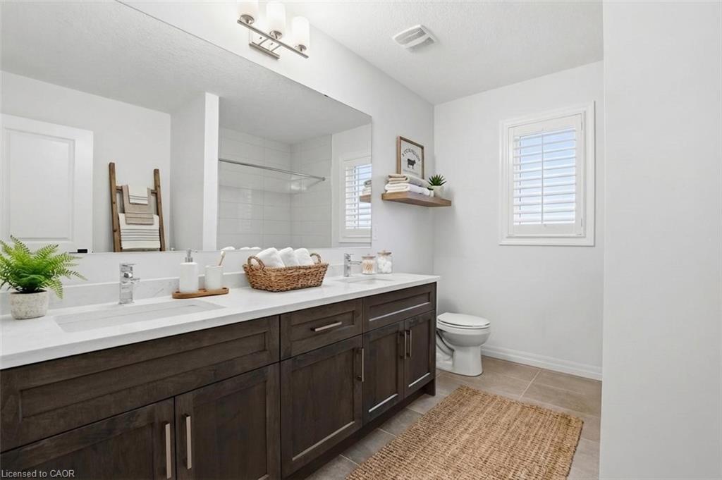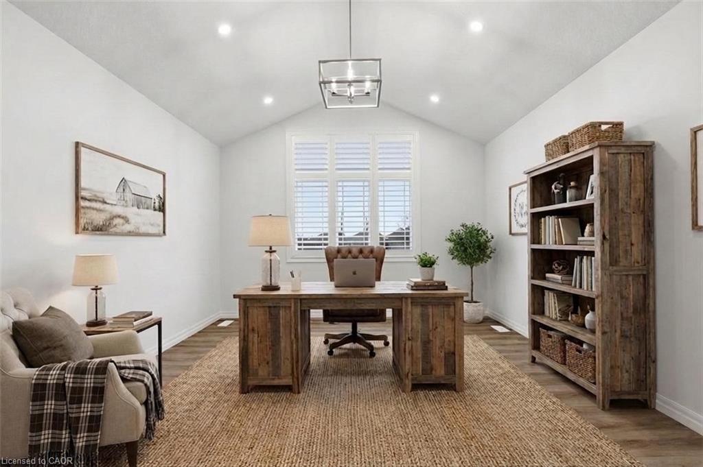***OPEN HOUSE SATURDAY 2-4 PM***BACKS ONTO GREENSPACE**IMMEDIATE POSSESSION/MOVE IN NOW **4 BEDROOMS + 3 FULL BATHROOMS, OFFICE, + VAULTED CEILINGS*** HUGE LOT & DRIVEWAY! SANDRA SPRINGS! KITCHENER'S NEWEST FAMILY SUBDIVISION. Exquisite stone detail on the front gives this home lovely curb appeal as soon as you see it. Modern finishing touches throughout in this grand home boasting over 2900 square feet. Large foyer entry, huge family room open to eat in the kitchen with QUARTZ COUNTER TOPS & BACKSPLASH! Entertainers dream kitchen, island with seating for 6! 9 foot ceilings, pot lights, modern millwork & trims. 4 BEDROOMS PLUS UPPER FLOOR OFFICE and 2 ENSUITES, 3 FULL BATHS perfect for the drawing family! FULLY LOADED WITH Designer upgrades such as upgraded lighting package, SOARING VAULTED CEILINGS. Photos are virtually staged.
