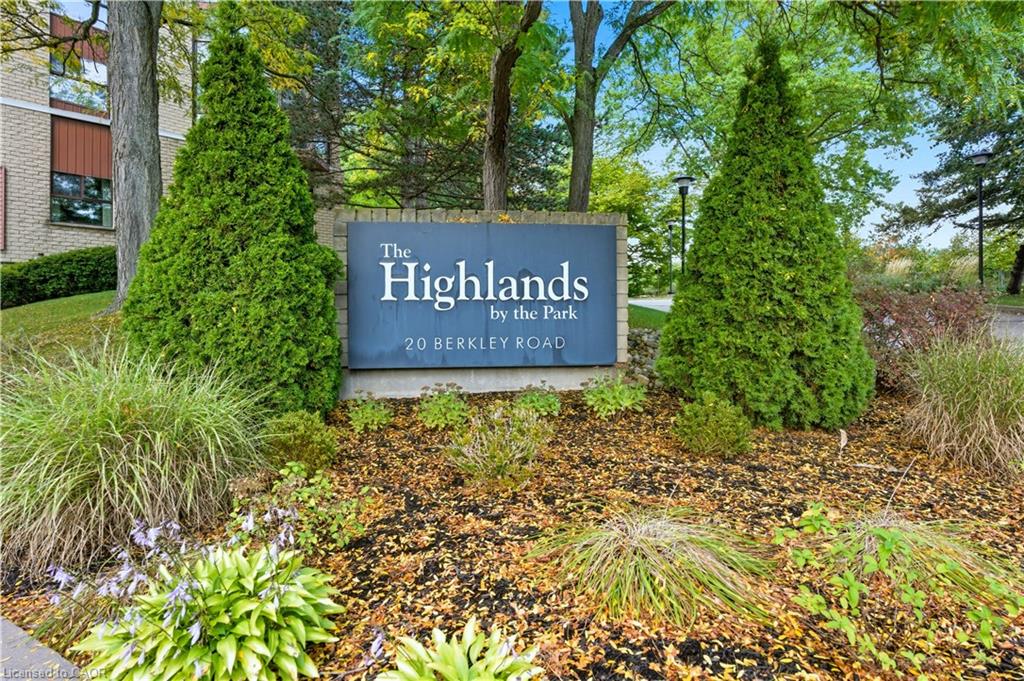 Welcome to The Highlands by the Park; 20 Berkley Road. Nestled atop a hill at the end of a quiet cul-de-sac in historic West Galt, this prestigious condominium offers tranquility, privacy, and sweeping views of nature and the city skyline. Overlooking a majestic woodlot, Victoria Park, and beyond, this building is one of Cambridge's hidden gems. This spacious 2,418 square foot, carpet-free unit offers a rare combination of size, layout, and natural light. With 3 generously sized bedrooms, 2 full bathrooms, and a thoughtfully designed floor plan, it’s ideal for those seeking a blend of comfort and functionality. Step into an impressive foyer with mirrored walls and a large closet before entering the bright eat-in kitchen, complete with ceramic tile, crisp white cabinetry, built-in range top, track lighting and a cozy breakfast nook that looks out over lush greenery. The kitchen opens into a formal dining room with laminate flooring and elegant wall sconces; perfect for entertaining. The adjacent oversized living room features a wood-burning fireplace (sold in as-is condition) and leads to a bright all-season solarium with floor-to-ceiling windows, perfect as a den, office, or creative space. Down the hallway, you’ll find three spacious bedrooms, including a large primary suite with two large windows, an expansive walk-in closet, and a 5-piece ensuite. A second 4-piece guest bath serves the remaining bedrooms. The in-suite laundry closet is conveniently tucked away off the main hallway. Building amenities include a rooftop terrace with panoramic views, ample seating, and barbecue, a party room with full kitchen and lounge area, meeting room, exercise room, and beautifully maintained common spaces. This unit includes one underground parking spot with a tandem storage locker. Don’t miss this rare opportunity to live in a peaceful, elevated community surrounded by nature, just minutes from the charm and culture of West Galt.