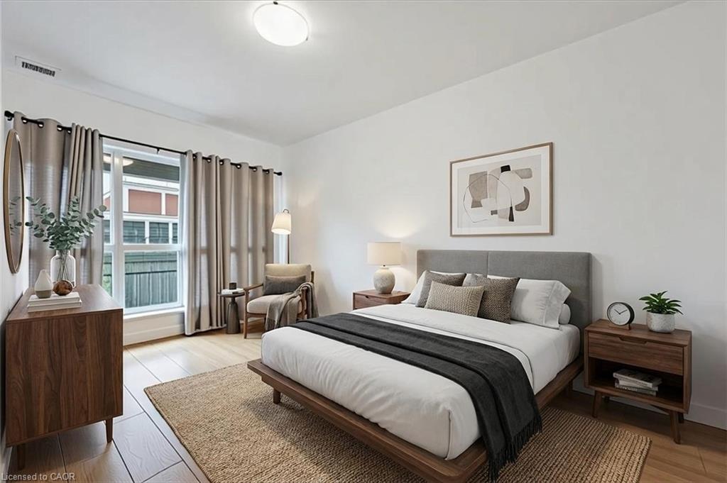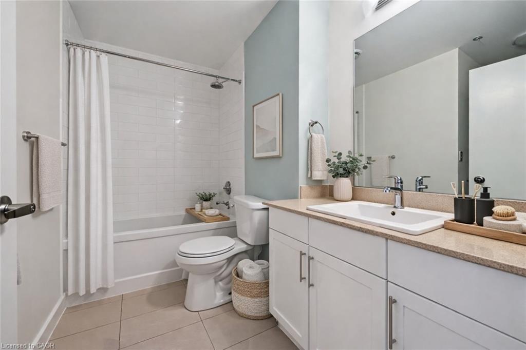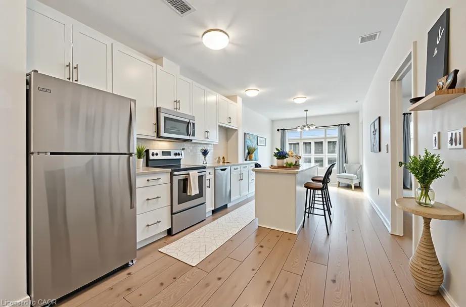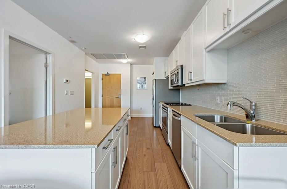 Welcome to Suite 706 at 1 Victoria - a stylish executive condo in the heart of Kitchener's Innovation District. This bright and modern suite offers 659 sq. ft. of smart, efficient living space designed for both comfort and style. The open-concept kitchen features crisp white cabinetry, granite countertops, stainless steel appliances, a glass mosaic backsplash, and a spacious centre island perfect for meal prep, casual dining, or gathering with friends.The generous one-bedroom layout includes an oversized bedroom with space for a cozy seating area and a walk-in closet, while expansive windows in both the living room and bedroom fill the space with natural light. Engineered flooring throughout and in-suite stackable laundry add everyday convenience. Step out onto your private balcony overlooking the beautifully landscaped terrace, complete with raised flower beds, gardens, and relaxing seating areas - your own little urban escape. This unit also includes underground parking and a storage locker. Residents enjoy access to fantastic amenities, including a bright fitness centre, media room, and party room. Perfectly located in the core of the Innovation District, you're just steps to the LRT, GO Station, Victoria Park, the University of Waterloo School of Pharmacy, Google, McMaster's School of Medicine, Communitech, restaurants, cafés, and more. Urban living at its best - stylish, connected, and incredibly convenient. Photos have been virtually staged.