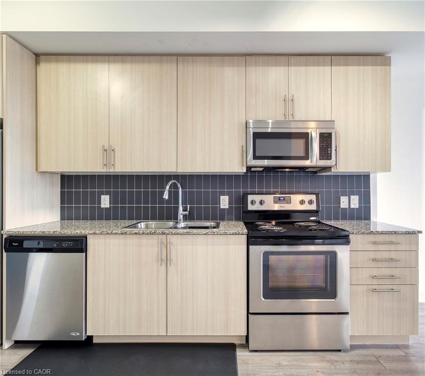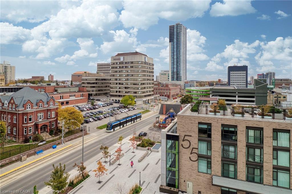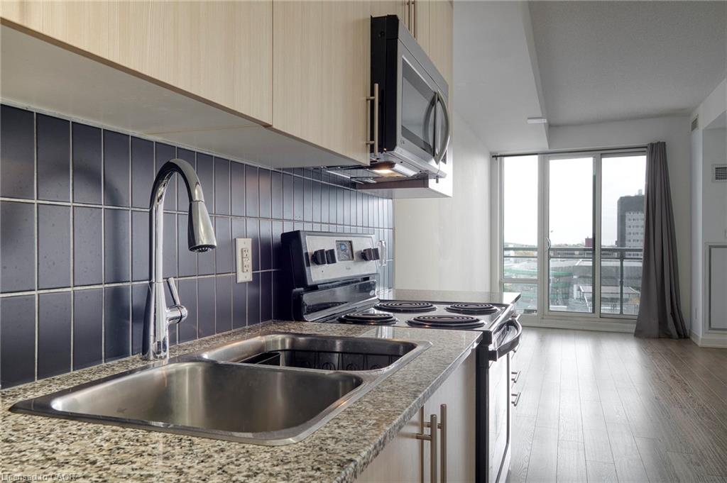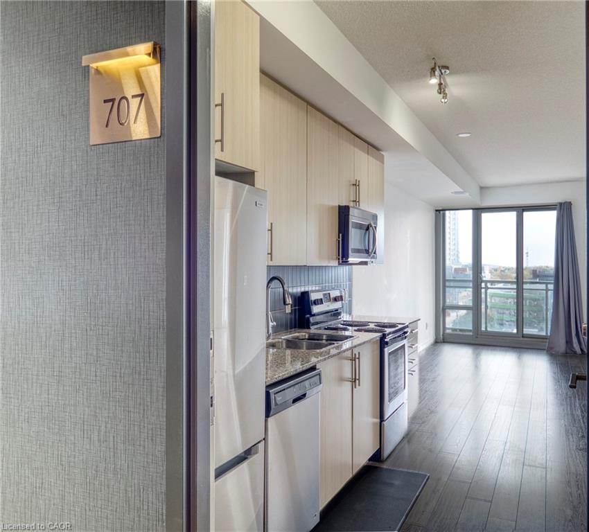 This spacious Andrin-built City Centre condo delivers a great 7th-floor view, modern look, and full amenity package INCLUDING PARKING! Take advantage of shared amenities with Young Condos just across the path - large fitness centre with cycle room, rooftop lounge with community bbq's, party room, penthouse-level running track, and 24 hours concierge and security. Enjoy a blossoming social life with like-minded people across two buildings: have them to your common spaces or visit them at theirs! Sitting in a convenient and exciting downtown location, find LRT, Victoria Park, grocery and cafe, our favourite San Francisco Panini eatery, Kitchener Public Library, and Centre in the Square within reach. At home, this 7th-floor condo is finished with balcony space, storage locker, and underground parking space. Offering 600 square feet, the unit is finished with stainless-steel kitchen appliances, stacked laundry insuite, granite counters, updated bathroom, and primary bedroom with walk-in closet. Enjoy an early-morning sunrise view over downtown and find some peace in quiet in a great unit that is move-in ready. See for yourself, today!